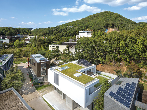 제약이 많았던 땅. 가족은 그곳에 집과 그들의 출판사, 북카페를 담은 건물을 짓길 원했다. 긴 시간, 건축가와 함께 고민한 흔적은 공간 속에 고스란히 녹아들었다.위에서 내려다본 건물 전경. 1층이 개방적이라면 2층은 폐쇄적이고, 1층이 무거운 색상이라면 2층은 밝고 가벼운 색상, 반대로 1층이 벽체로 구성된 투과성이 있는 형태라면 2층은 매스 형태로 하는 등 건물은 주변 여건과 공간 활용에 따른 대립적 요소들이 극적으로 공존하고 있다.헤이리 문화마을에 위치한 이 건물은 출발선상부터 여느 프로젝트들과는 달랐다. ‘버려진 개를 키울 수 있는 독립적 주택’이 건축주가 신축을 결심하게 된 결정적인 이유이자 우리의 작업이 시작된 지점이었다.건축주는 대지 매입부터 건축가와 함께하였다. 주거·업무·상업이 동시에 수용 가능하며 주 업무인 출판업과 부업인 북카페의 특성을 잘 살릴 수 있는 장소를 물색하였다. 프로젝트에 있어서 주된 요구사항은 주택과 사옥의 절대적 분리, 실용적이고 따뜻하며 이웃과 잘 스며드는 집, 수납은 넉넉하면서 비워낸 듯 단순한 내부 공간 디자인들이 있었다. 이와 동시에 극복해야 할 점으로는 아동 출판사 및 북카페와 같은 프로그램으로 인한 이웃과의 소음 문제, 출판사 직원의 복지 공간 등이었다.SECTION①정원 ②화장실 ③출판사 ④근생시설(북카페) ⑤미팅룸 ⑥창고 ⑦지원실 ⑧드레스룸 ⑨욕실 ⑩침실 ⑪다용도실 ⑫주방 ⑬거실 ⑭현관 ⑮작업실 ⑯엘리베이터가족이 운영하는 회사인 느림보 출판사 사옥이자 집. 대지가 위치한 헤이리의 까다로운 건축설계지침을 극복하고 만족스러운 건물을 완성했다.외부에서는 보이지 않는 주택의 안마당뒷마당과 이어지는 아늑한 길헤이리 문화마을은 건축에 있어 마을의 자체 건축설계지침에 의한 형태적 제약이 많은, 까다로운 곳 중 하나다. 본 대지는 <헤이리 건축설계지침>의 총 4가지 건물 유형 규정 중 네 번째인 ‘게이트하우스 유형에 속한다. 말 그대로 개선문과 같이 중간이 뻥 뚫린 게이트 형상의 건물을 지으라는 형태 규정이다. 게다가 건축재료 선택 또한 제약이 있어 흰색 외벽, 벽돌, 담장 등은 사용할 수 없다.이곳에 진행되는 모든 건축계획은 반드시 마을 자체 건축 심의를 거쳐야 하기 때문에 아무리 땅 주인이라 하더라도 제약 속에 순응하는 건축을 할 수밖에 없었다. 그런데도 건축주가 이 지역을 선택한 이유는 그들의 사업이 헤이리 문화마을과 잘 부합되고, 이웃과 함께 자연을 더불어 살 수 있는 좋은 환경과 문화를 제공하고 있기 때문이었다. 결국 나머지 제약적인 부분들은 건축가와 머리를 맞대어 풀어나가기로 하였다.건물의 1층은, 게이트 형상처럼 좌우 두 개의 별동으로 분리되어야 할 헤이리 건축설계지침과는 반대로, 출판사의 사무공간과 북카페를 한 동으로 배치하여 고용을 줄이면서 관리가 용이하도록 하고, 공간만 분리하여 업무영역과 상업영역, 각각의 효율을 높일 수 있는 방법을 이용했다.HOUSE PLAN대지위치▶ 경기도 파주시 |대지면적▶ 651.2㎡(196.98평) |건물규모▶ 지상 2층건축면적▶ 317.41㎡(96.01평) |연면적▶ 493.41㎡(149.25평)건폐율▶ 48.74% |용적률▶ 75.77%주차대수▶ 5대 |최고높이▶ 9.3m구조▶ 기초 – 철근콘크리트 매트기초 / 지상 – 철근콘크리트단열재▶ 비드법보온판 2종1호 130, 180, 220mm / 압출법보온판 1호 130, 180mm외부마감재▶ 외벽 – 노출콘크리트 마감, 실리콘페인트(백색) 도장, 콘크리트블록 / 지붕 – 식재담장재▶ 콘크리트 |창호재▶프레임워크 153mm 삼중유리 창호(기밀성등급 1등급)에너지원▶ 도시가스전기·기계·설비▶ 전기 – 대원포비스 / 기계·설비 – HL설비컨설턴트구조설계(내진)▶ 모아구조시공▶ 콘크리트공작소설계담당▶ 염윤지, 이연정, 박혜진설계▶ JMY architects 윤재민북카페가 들어설 1층 공간. 높은 층고로 확보된 메자닌(Mezzanine) 층은 부유하는 계단을 통해 진입할 수 있다.정원을 품은 회의실은 공간의 확장감을 더한다.4m의 높은 천장고는 상업공간 내 화장실 상부를 활용한 중층을 가능하게 하여 보다 다양하면서도 아이들에게 재미있는 공간을 제공한다. 또한, 뒷마당 및 뒷산과 시원하게 소통할 수 있는 개방적 공간 구성을 가능케 한다.업무공간은 창고, 사무·창작 공간, 대표실, 주방으로 구성되고, 직원들의 요구에 따라 다소 폐쇄적 공간 구조를 가지게 되었다. 건축주의 연령대를 고려하여 1층의 엘리베이터는 2층 주택의 현관과 바로 통할 수 있도록 배치해, 노후생활에도 대비할 수 있게 계획했다.건물의 2층은 도로면 동쪽 방향으로 ‘ㄴ’자 배치를 택하여 도로 면과 접한 시선을 막고, 서쪽 동산 방향의 마당과 함께 최대한 열리도록 하여 자연과 소통할 수 있게 하였다. 외부로부터의 시선 차단과 소통하는 내부 구조를 만들기 위해, 도로면과 북측 이웃집 방향의 열림은 얇은 틈의 형식으로 최소화하고 단순한 벽체를 만들었다. 이는 건축주가 원하는 미니멀한 건축 디자인과도 잘 부합되는 부분이다.단정하게 꾸민 출판사 내부 전경INTERIOR SOURCE내부마감재▶ 벽 – 수성페인트(백색), 포세린 타일, 시멘트블록, 콘크리트 면처리, 실리