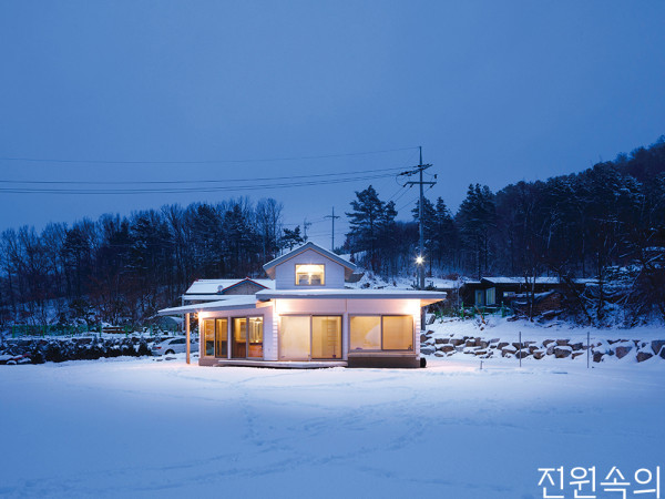 복잡한 현대 사회에서 가족, 마을, 집이 무엇인지 건축가는 묻고 고민한다. 평범한 외관에 담긴 그러나 결코 평범하지 않은, 3세대를 위한 세 겹의 공간.남쪽에서 본 모습. 넓은 밭 가운데에서 눈 쌓인 원두막과 같은 풍경 여름에는 밭의 한가운데에서 농사를 돕는 원두막과 같은 존재가 된다. 다시 만들어진 대가족이 집은 도시에서 각기 따로 살던 건축주 부부와 그 아이들, 그리고 그들의 부모님을 포함한 3세대의 시골 이주 계획으로부터 시작되었다. ‘함께 모여 살 수 있는 집’이다. 가족이라는 ‘공동체’라고 할지라도 이미 긴 시간 따로 살아왔고 각기 전혀 다른 삶의 방식과 가치관을 가지고 있다. 즉, 이 3세대의 동거는 많은 시간과 공간을 공유해왔던 과거의 대가족과는 본질적으로 다르기 때문에, 현대 사회형 대가족의 살아가는 방식으로서의 집에 대해서 생각해 보고자 했다.STRUCTURE눈이 많이 오는 날, 주변의 산과 이웃의 집들이 함께 만드는 풍경. 기초 위의 본집, 곁집, 작은 집이 결합된 하나의 ‘세 집’.외부에서 바라본 주택의 야경 3세대의 공유주택이 집은 단독주택, 세컨드하우스, 혹은 공동주택, 셰어하우스 등 어느 쪽이라고 확실히 말하기가 어렵다. 우리도 아직 어떤 종류의 주택인지 명확히 말할 수 없지만, 그런 면에서 앞으로의 새로운 주택의 종을 발견할 가능성이 있다고 생각한다. 하나의 공간을 나누어 공유하는 것이 아니라 시간을 나누어 공유하는, 마치 가족 간의 에어비앤비적인 공유방식이다.건축주의 부모님은 도시에 집을 유지하면서 2거점으로서 이 집을 생각한다. 농번기에만 체류 예정으로, 이 집이 농사를 지지하는 원두막이 되기를 기대한다. 건축주 부부는 여행을 좋아해서 많은 시간 집을 떠나있다. 집이 마치 여행의 준비를 위한 베이스 캠프이자 여행의 일부가 되지 않을까 생각한다. 그리고 아이들에게는 방학에 놀러 오는 새로운 고향집이 생겼다.키친, 응접실, 파우더 등 물 쓰는 공간이 하나의 가구로 연결되어 있다. MODEL● 곁집(食屋) : 자급자족의 과정이 있는 밭의 집밭(생산)부터 식탁(소비)까지의 과정이 그대로 집이 되는 것을 생각했다. 기초의 콘크리트가 그대로 연장된 발코니는 농작물을 다듬는 공간. 지붕에서 떨어진 빗물을 모으는 우물과 수전을 이용해서 씻거나 처마 밑의 건조대에서 채소를 말린다. 데크와 이어진 응접실은 수확된 농작물을 이웃과 함께 소비하고 다음의 생산을 준비하는 곳.● 본집(母屋) : 가족들의 집회소가족들이 항상 거주하는 것이 아니라 임시적으로 모이는 장소로서의 집을 생각했다. 농사를 지을 때, 여행에서 돌아와서, 여름방학에, 가족들이 각자 돌아오는 때에 대응할 수 있는 장소로서의 역할을 가진, 이른바 「가족의 집회소」로서의 집.● 작은 집(小屋) : 여름의 집 두 집의 위에 얹혀 있는 독립된 공간이다. 사다리를 타고 올라가면 먼산이 잘 보이며 다른 세계로 전환되는 것 같은 감각을 가진 마음의 안식처같은 공간.응접실의 복도는 창을 열면 걸터앉을 수 있는 툇마루가 된다. 가벼운 존재감의 사다리를 통해 다른 세계로 전환되는 것 같은 감각으로 작은집에 올라간다. 데크와 툇마루, 빗물받이 등이 구조적으로도 일체성을 가진다. 농업 - 농가주택 - 농촌마을이 마을은 농업이 마을 전체의 모습을 만들고 있다. 자연환경과 지리적 조건이 농업과 이어져 풍요로운 자연과의 유기적인 관계 속에 삶의 모습이 만들어지고 있다. 농업과 긴밀한 관계를 맺는 집, 농사 자체가 건축을 결정하는 하나의 요소가 되는 방식을 생각한다. 또한 이곳은 자연발생적으로 생겨난 마을이기 때문에 공공을 위한 시설이 부족하다. 개인의 집이 마을의 ‘공’과 가족의 ‘사’가 조화롭게 섞여 있는 장으로서의 역할을 하길 기대한다. 주변 사람들과 교류하고 협동을 통해 이루어지는 농업 방식과 문화를 지지할 수 있도록, 주변에 열린 관계성을 만들고 계절에 따른 농업의 변화에 대응하는 건축의 방식이 요구된다.본집과 곁집의 연결부 진입 공간의 모습. 깊은 처마가 있어서 이웃들이 모이기 좋은 장소가 된다. HOUSE PLAN대지위치 ▶ 충청남도 천안시대지면적 ▶ 775㎡(234.43평) | 건물규모 ▶ 지상 2층건축면적 ▶ 77.71㎡(23.50평) | 연면적 ▶ 84.38㎡(25.52평)건폐율 ▶ 10% | 용적률 ▶ 40%주차대수 ▶ 1대 | 최고높이 ▶ 5.9m구조 ▶ 기초 – 철근콘크리트 매트기초 / 지상 – 벽 : 경량목구조 2×6 구조목, 지붕 : 2×10 구조목단열재 ▶ 그라스울, 비드법단열재 2종1호외부마감재 ▶ 외벽 - 사이딩보드 위 외부용 수성페인트, 지붕 – 아스팔트싱글 위 외부용 수성페인트창호재 ▶ 알루미늄 시스템창호 THK42 로이삼중유리 | 에너지원 ▶ LPG시공 ▶ 태경건설설계 ▶ 오헤제 건축설계사무소 http://o-heje.com집과 계절봄 - 농사준비의 시작. 실내와 완만히 이어진 데크에서, 느긋하게 숲과 밭의 풍경을 즐긴다.여름 - 응접실의 시원한 처마밑은 옥수수등의 작물을 나누는 장소가 되기도 한다.가을 - 추수와 김장의 시기. 데크, 거실에서 작물을 다듬고, 처마 밑에는 야채등을 말린다.겨울 - 난로를 놓고 둘러 앉아 이야기하거나, 데크에서는 눈사람을 만들기도 한다.집 