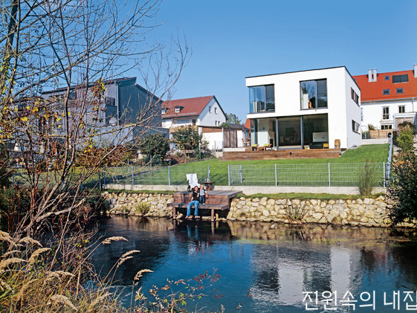 FUSSNER KÜHNE ARCHITEKTEN, Friedberg | GERMANYwww.fussner-kuehne-architekten.de주택을 둘러싼 주변 환경이 집의 캐릭터에 미치는 영향을 절대 간과할 수 없다. 건축가 Christian Fussner에 의해 설계된 이 주택은 독일 북바이에른 강가 언덕 위에 자리한다. 명쾌한 건물의 외관은 흡사 주변 경치와 끊임없이 상호작용을 하는 듯하다.북쪽의 입구와 계단실, 복도 이어서 연결되는 주방과 식당을 지나면, 몇 계단 아래로 벽난로와 ㄱ자 모양의 소파로 둘러싸인 거실이 등장한다. 높이의 차이를 둠으로써 한편으로는 좀 더 아늑하게 공간을 감싸 안은 듯한 분위기를 만들어내며, 다른 한편으로는 거실이 주변 경치를 향해 좀 더 가까이 다가서는 효과를 얻었다. 더욱이 남쪽과 남서쪽으로 크게 개방된 창들은 강가의 사계절 경치를 파노라마 장면처럼 고스란히 담아낸다. 강을 향해 층을 지어 조성된 테라스 공간은 주로 앉아서 편히 쉴 수 있는 장소로 이용된다. 약간 경사진 잔디밭을 거치면 강가에 바로 위치한 또 다른 작은 테라스로 연결되는데, 가족이 즐겨 타는 보트의 선착장으로 사용되는 곳이기도 하다. 3중창의 큰 통유리는 최고의 조망을 가능하게 할 뿐만 아니라 태양으로부터 많은 양의 에너지를 받아들인다. 가스난방과 태양열 집열기, 장작 난로 등을 통해 공급되는 에너지는 필요시 사용될 수 있도록 축열부에 저장된다. 블라인드와 조명, 음악 장치 등을 모두 간단히 조절할 수 있는 홈네트워크시스템을 갖추었고, 때에 따라서는 자동으로 조절되기도 한다.HOUSE PLAN주택구분 : 신축 / 2명의 자녀를 둔 가족의 주택대지위치 : GERMANY Freising 근처공사기간 : 12개월대지면적 : 대략 600㎡주거면적 : 170㎡+60㎡(사용면적-차고 제외)+42㎡(테라스)부피 : 900㎥공법 : 조적조, 외단열에너지 콘셉트 : 패시브적인 태양에너지 사용, 태양열 집열기, 가스 난방, 장작 난로연간 난방에너지 요구량(EnEV) : 59.6kWh/㎡a전체비용 : 380,000€사진 : Thomas Drexel본 내용은 단행본 ‘세계의 실용적이고 유니크한 주택 디자인 100선’에서 발췌한 내용입니다. ▶ http://www.uujj.co.kr/shop/item.php?it_id=1449535807※ 본 콘텐츠의 저작권은 (주)주택문화사에 있으며, 이를 무단 이용하는 경우 저작권법 등에 따라 법적 책임을 질 수 있습니다.