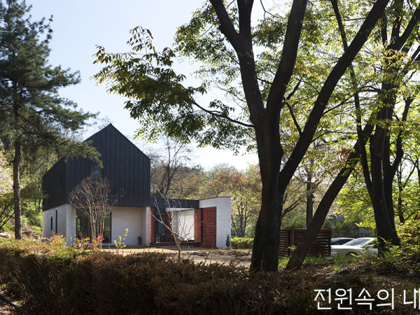 건축주는 직장 근처 판교의 단독주택에 살면서 본인들 손으로 직접 주택을 짓고자 여러 해 동안 땅을 찾고 있었다. 건축주가 살던 집은 외관은 단독주택이지만, 아파트와 동일한 내부구조에 마당이 협소해 아쉬웠다고 한다. 게다가 냉난방 효율이 낮은 것도 문제였다. 맞벌이 부부인지라 부모님과 같이 지내면서 어린 두 아이가 맘껏 뛰어놀 수 있는 넓은 마당과 맞춤형 실내공간의 꿈을 가지고 주택 설계를 의뢰했다.넓은 대지 위에 3세대를 위한 집 앉히기건축주가 찾은 땅은 일반적인 택지 개발을 통해 나온 단독주택지가 아니라 향린동산(경기도 용인시 동백동)이라는 오랜 세월을 통해 자생적으로 형성된 주택단지였다. 자연녹지지역(건폐율 20%)으로 170평 대지에서 30평을 쓸 수 있었다. 사실 넓은 대지에 집을 앉히는 일은 협소한 대지보다 더 많은 고민을 하게 만든다. 집을 구석에 배치하면 넓은 마당이 생겨 좋아 보이지만, 정원 관리 문제가 있고 주인공인 집이 왜소해 보인다. 그렇다고 집을 중앙에 배치하면 집과 정원의 구성이 어정쩡해질 수 있다. 더욱이 대지의 남쪽과 북쪽에는 작은 도로가 지나고 있다. 조망이 좋은 남쪽 면에 집의 정면과 큰 마당을 배치하고, 차량 이동이 많은 북쪽에 집의 후면을 두어 도로의 소음을 차단하였다. 집의 정면인 남쪽에는 한적하지만 주택단지 내부도로가 있어 사생활 보호를 위해 긴 벽을 세우기로 하였다.House The Wall _ 긴 벽을 통해 형성된 세 개의 마당하우스 더 월의 가장 큰 특징은 집의 정면부에 긴 가벽에 있다는 것이다. 이 벽은 기본적으로 남측도로로부터 집의 사생활을 보호한다. 건축주는 마당에 세 가지 기능을 담고 싶어 했다. 아이들이 뛰어놀 수 있는 큰 마당, 가족을 위한 중정 그리고 부모님을 위해 텃밭을 겸한 작은 정원이 그것이다. 긴 가벽으로 집의 내부와 외부에 경계가 생겼고, 벽의 앞쪽에는 큰 마당, 벽과 집 사이에는 중정 그리고 벽 끝에는 텃밭을 만들었다. 벽은 사생활을 보호하고 세 가지 색깔의 마당을 만들어 주었다. 1층 벽의 재료인 흰색 고벽돌을 비워 쌓아 자칫 단절감을 유발할 수 있는 외부가벽에 빛과 시선의 투과성을 만들었다. 가벽의 안쪽에는 정원 관리와 아이들 놀이기구를 수납할 수 있는 창고를 만들어 야외 생활이 많은 전원주택 삶에 적합성을 더했다.정갈한 박공지붕과 흰색 고벽돌의 대비대지 주변에 수목이 많고 남쪽으로 조망이 열려 있는 토지에 건축주는 심플하면서도 외부 자연환경과 대비되는 외관을 만들고 싶어했다.1층 외벽과 가벽은 흰색 고벽돌을 쌓고, 박공지붕과 2층까지 이어지는 외부 벽을 다크그레이 색의 컬러강판으로 처리하여 집에 강한 대비를 만들었다. 그렇게 주택은 모던하면서도 주변자연에 자연스럽게 녹아들었다. 낮에는 햇빛이 가벽을 통해 내부 중정으로 들어와 벽돌의 질감이 더욱 살아났고, 저녁 무렵이 되면 집 내부의 불빛이 가벽을 통해 바깥을 밝혔다. 중정 주변과 앞마당으로 이어지는 중정 문은 목재를 사용하여 자칫 컬러강판과 흰색 벽돌이 줄 수 있는 건조함에 자연의 따뜻함을 더했다. 건축개요대지위치 : 경기도 용인시 기흥구대지면적 : 557.00㎡(168.49평)건물규모 : 지상 2층건축면적 : 108.80㎡(32.91평)연면적 : 169.44㎡(51.25평)건폐율 : 19.53%용적률 : 30.42%주차대수 : 2대최고높이 : 8.3m구조 : 기초 - 철근콘크리트 매트기초, 철근콘크리트 줄기초 등 / 지상 - 벽 : 경량목구조 외벽 2×6 구조목 + 내벽 S.P.F 구조목 / 지붕 : 2×8 구조목단열재 : 그라스울 32K, 비드법단열재 2종2호 50㎜(가등급), 압출법보온판 100㎜(가등급)외부마감재 : 외벽 – 240*60*20T 고벽돌 타일(백색), 벽돌비워쌓기, 컬러강판 0.5T / 지붕 – 컬러강판 0.5T창호재 : 이건창호 로이 3중유리철물하드웨어 : 심슨스트롱타이 에너지원 : 도시가스, 태양광전기·기계·설비 : 정연엔지니어링시공 : ㈜우리마을설계 : mlnp architects (엠엘앤피 아키텍트 건축사사무소) 02-572-8026, http://mlnparchitects.com한옥의 지혜 _ 마당을 중심으로 공용 공간과 개인 공간 만들기가벽을 통해 형성된 중정형 마당 주변은 우리의 전통 한옥을 생각나게 한다. 대문을 통해 중정으로 들어오면 부모님이 거처하는 방이 사랑방 역할을 한다. 사랑방에서는 마당과 뒤뜰을 바라보는 큰 창이 있으며, 창 앞에는 툇마루를 배치하여 주변의 고즈넉한 풍경을 감상할 수 있다. 1층의 거실과 식당은 하나의 공간으로 연결되어 있어서 아이들을 보면서 저녁을 준비할 수 있고, 가족들이 한 공간에 있다는 느낌을 준다. 2층에는 두 아이와 건축주 부부의 방을 배치하였다. 아직은 어린 두 아이의 방은 현재에는 하나로, 미래에는 두 개의 방으로 나눌 수 있게 설계하였다. 그리고 그 위에는 아이들 다락방 겸 책장을 만들었다. 부부가 머무는 2층 메인 침실은 외부 테라스로 바로 나갈 수 있어서 1층에서는 볼 수 없는 풍경을 선사한다. 가족이 모이는 공간과 개인 공간이 유기적으로 연결되면서도 사생활이 보장되도록 고려하였다자재사양내부마감재 ; 벽 - 벤자민무어 친환경 도장 / 바닥 – 이건 강마루욕실 및 주방 타일 : MK TOTAL수전 등 욕실기기 : 대림바스주방 가구, 붙박이장 : 개인 공