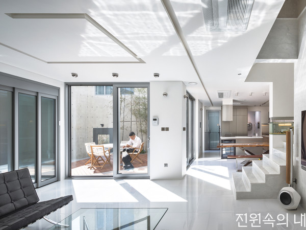 전원생활에 대한 막연한 꿈이 있더라도 획일화된 주거 문화에 익숙해져 집짓기 결정을 내리긴 쉽지 않다. 모험 같았던 일이 현실이 되고, 이젠 이 모두를 행복이라 말할 수 있게 된 부부의 집을 찾았다.대지의 단점을 보완한 집짓기“저희 삶에서 행복의 기준점을 찾으라면 집짓기 전과 후로 나뉘는 것 같아요(웃음).”지난 2월 말, 장은석, 신지윤 씨 부부와 반려견 폴로가 새집으로의 입주를 마쳤다. 이전 주거지와는 다른 상쾌한 공기와 매일 아침 마주하는 창밖 풍경은 이사 후 가족이 받은 가장 큰 선물이다.집 밖을 나가면 모든 것이 해결되던 대단지 아파트에 살며 불만 없이 편리한 생활을 누린 부부였지만 스킨스쿠버, 요트셀링, 모터사이클 등 사계절 다양한 취미가 생기면서 아파트 구조에서는 충족할 수 없는 아쉬움이 생겼다.“주택에 대한 로망이 점점 강해졌던 그 시점부터 여러 전원주택 부지를 찾아 다니기 시작했어요. 다들 그렇겠지만, 저희 조건에 완벽하게 딱 들어맞는 입지를 찾기란 상당히 어려웠죠. 뭐든 하나는 포기해야 가능한 상황이었어요.”그렇게 일여 년의 시간을 보내고서야 찾은 곳이 지금의 땅이었다. 부산역세권의 끝자락, 택지 개발로 생긴 마을 속 조용한 부지. 아직 제 모습을 갖추지 못한 주변 상황들에 대한 걱정도 있었지만, 단점을 안타까워하기보단 오히려 효율적인 공간을 계획할 수 있는 좋은 기회라 생각하기로 했다. 그리곤 디자이너인 남편은 불확실한 요소로부터 받을 영향을 최소화하며 80평의 땅 위에 둘만의 집을 그려나갔다.노출콘크리트와 방킬라이 목재로 마감된 건물의 외관. 켄틸레버 구조로 건물의 볼륨감이 그대로 전달된다. 집의 중심이 되는 중정. 프라이버시를 지키면서 외부의 영향을 받지 않고 가족이 자유롭게 야외생활을 즐길 수 있게 계획했다. SECTION 3주방/식당 5중정 7차고 9바이크룸 13침실 14발코니 15서재 16가족실 거실에서 바라본 중정과 주방 쪽 모습. 중정 덕분에 언제나 집 안 깊숙이 빛이 든다.HOUSE PLAN대지위치 ▶ 부산광역시 기장군 | 대지면적 ▶ 259.7㎡(78.55평) | 건물규모 ▶ 지상 3층 | 건축면적 ▶ 155.35㎡(46.99평) | 연면적 ▶ 385.06㎡(116.48평) | 건폐율 ▶ 59.82%(법정 60%) | 용적률 ▶ 148.27%(법정 150%) | 주차대수 ▶ 3대 | 최고높이 ▶ 11.17m구조 ▶ 기초 – 철근콘크리트 매트기초 / 지상 – 철근콘크리트조 | 단열재 ▶ 압출법보온판(가등급) | 외부마감재 ▶ 노출콘크리트 위 발수코팅, 방킬라이 목재 | 창호재 ▶ 이건 AL 시스템창호 | 열회수환기장치 ▶ HIMPEL | 에너지원 ▶ 도시가스, 태양광설계담당 ▶ 최락준 | 설계 ▶ VISTA DESIGN, 대흥종합엔지니어링건축사사무소 | 시공 PM ▶ 장성준 | 시공 ▶ VISTA DESIGN www.vistadesign.coPOINT 1 - 집 내·외부를 연계하는 중정부부가 가장 마음에 드는 공간이라 꼽는 중정. 아파트에서는 경험하지 못했던 가족만의 외부 공간에서 다양한 야외활동을 누린다. 차고에서 중정으로 바로 연결될 수 있도록 동선의 편의도 고려하였다.POINT 2 - 주방 옆 폭넓은 계단수직적인 연결 수단인 계단은 보통 주택보다 다소 폭이 넓게 계획되었다. 오르내리는 역할뿐만 아니라 앉아서 차를 마시고 이야기를 나눌 수 있도록 배려한 설계자의 고민이 엿보이는 부분이다.POINT 3 - 채광을 생각한 욕실2층 드레스룸 안쪽에 마련된 욕실. 샤워부스와 별도로 욕조를 두고 편의에 따라 사용할 수 있게 했다. 벽 한편에는 긴 창을 설치하여 은은한 빛이 내부 깊숙이 스며든다. 환기와 채광까지 잊지 않은 결과물이다.깔끔하게 꾸며진 서재. 한쪽 코너창은 주변 풍경을 담아낸다.중정을 품은 집직접 디자인하다 보니 설계 단계에서부터 마감은 물론 내부 세세한 부분까지도 사전에 충분히 검토하며 진행할 수 있었다. 특히 단순히 집이 아닌 지인들과 언제든 취미 활동을 즐길 수 있길 원했던 만큼 ‘함께 나눌 수 있는 공간’에 초점을 맞추고, 긴 직사각형의 대지에 중정을 우선순위로 건물의 배치가 이뤄졌다.“처음 저희가 집을 짓게 된 이유를 가장 충족시켜주는 공간이 바로 중정이죠. 지인들과 추억을 쌓고 반려견도 마음껏 뛰놀 수 있는. 외부의 영향을 받지 않고 자유롭게 공간을 누릴 수 있음에 큰 만족감을 느껴요.”중정은 각 층의 실들을 기능적으로 구분하는 데도 일조했다. 중정을 중심으로 1층 거실과 차고, 2층 침실과 운동실, 3층 서재와 테라스 등을 놓아 상충하는 성격의 공간을 자연스럽게 분리했다. 또한, 수직적으로 단절된 공간을 시각적으로 연결하고, 집 안 어느 곳에서도 따스한 볕을 만끽할 수 있게 된 것도 중정 덕분에 가능할 수 있었다.계단실 사이 유리 너머로 들어오는 천창에서의 빛과 아래층의 음악 소리가 언제나 집 안 곳곳에 스며든다.2층 침실에서는 큰 창을 통해 중정을 내려다볼 수 있다.PLAN 1현관 2거실 3주방/식당 4보조주방 5중정 6작업실 7차고 8운동실 9바이크룸 10다용도실 11욕실 12드레스룸 13침실 14발코니 15서재 16가족실 17손님방 18테라스 INTERIOR SOURCE내부마감재 ▶ 벽 – 벤자민무어 친환경 도장, 방킬라이 목재 / 바닥 – 폴리싱 타일, 천연 원목마루 | 욕실 및 주방 타일 ▶ 천연 대리석, 방킬라이 목재 | 수전 등 욕실기