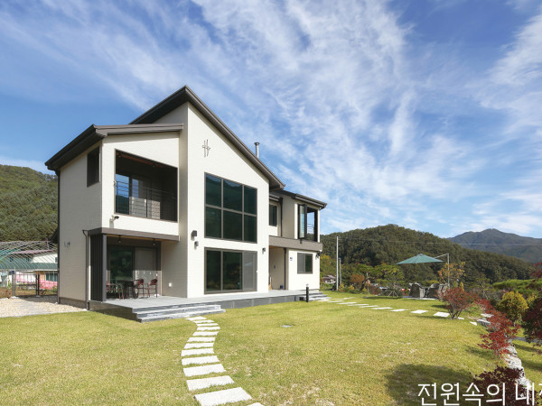 동쪽으로 소리산과 맑은 계곡이 흐르는 조용한 마을. 자연 속 절제된 선의 주택이 일상에 지친 가족을 치유한다.주택 지붕의 박공이 주변 산세와 닮아 자연스럽게 녹아든다. 건축주 문영숙 씨가 가장 좋아하는 곳으로 꼽은 2층 테라스. 계곡물 소리와 함께 가끔은 멀리서 부엉이 소리도 들린다고. 경기도 양평의 한 마을. 빼어난 풍광의 소리산을 지나 황금들판 너머에 자리한 모던한 주택이 김삼, 문영숙 씨 부부의 평화로운 주말을 조용히 품는다.“전원생활은 10년 동안 꿈꿔 온 낭만이었어요. 그렇기에 땅과 집을 대충 할 수 없었죠. ‘시간이 걸려도 꼼꼼히 하자’는 게 우리 목표였어요.”집에서의 거리, 교통, 자연경치 등 원하는 조건에 맞는 대지를 찾는 데만 3년이 걸렸다. 어렵게 구한 좋은 땅인 만큼 집도 집답게 짓고자 했고, 그래서 함께할 시공사로 더존하우징을 선택했다. 절친한 남편 지인의 추천도 있었지만, 오랫동안 업계에서 꾸준히 집을 지어왔다는 것 자체가 신뢰할 수 있었던 부분이었다고. 그렇게 반년. 오랜 기다림의 순간을 지나 부부는 겹겹이 산이 포개지는 풍경에 꼭 어울리는 목조주택을 만났다.디딤돌을 따라 정원의 끝에 다다르면 한 단 돋운 대지 위로 주택이 나타난다. 현관문 앞으로는 석재 데크를 설치해 활동과 관리의 편리함을 함께 잡았다. SECTION ①현관 ②거실 ③식당 ④주방 ⑤다용도실 ⑥욕실 ⑦안방 ⑧방 ⑨가족실 주말주택일수록 유지보수는 최소화로매일 집을 돌보기 어려운 주말주택. 머무는 동안 만큼은 전원생활에 집중할 수 있도록 부부는 ‘간편한 관리’를 주택설계의 최우선 사항으로 꼽았다. 비용은 조금 더 들더라도 오염과 자외선에 강하고 자가 세척 기능이 있는 KMEW 세라믹 사이딩과 지붕재를 택했고, 데크도 목재에서 석재로 바꾸었다.한편, 겨울 추위가 매서운 지역 특성상, 단열이 부실하면 곧바로 결로와 그로 인한 하자로 이어질 수 있었다. 이는 J-GRADE 구조재와 아이씬(ICYNENE) 수성연질폼을 적용하는 것으로 보완하고, 목조주택 감리제도인 5-STAR 인증까지 받아 품질 안정성도 확보했다.주택의 정원 전경. 티테이블부터 파고라, 텃밭, 평상, 가마솥까지 갖춰 다양한 활동이 가능하다. HOUSE PLAN대지위치 ▶ 경기도 양평군대지면적 ▶ 998㎡(302.42평) │ 건물규모 ▶ 지상 2층건축면적 ▶ 114.57㎡(34.71평) │ 연면적 ▶ 176.18㎡(53.38평)건폐율 ▶ 11.48% │ 용적률 ▶ 17.65% │ 최고높이 ▶ 9.42m구조 ▶ 기초 - 콘크리트 매트기초 / 지상 - 경량목구조 J그레이드 구조재단열재 ▶ 아이씬 수성연질폼, 그라스울 R19외부마감재 ▶ 벽 - KMEW 세라믹사이딩 16T / 지붕 - KMEW 지붕재창호재 ▶ LG하우시스 3중 유리 유럽식 시스템창호 │ 철물하드웨어 ▶ 심슨스트롱타이에너지원 ▶ 기름보일러 │ 조경 ▶ 더라임토목앤조경시공 ▶ ㈜더존하우징 1644-3696 www.dujon.co.kr거실과 식당 사이의 벽은 구조를 남기고 속을 비우는 방식으로 공간 간 소통감을 높였다.POINT 1 - CCTV와 스피커주택 외부에 설치된 CCTV와 스피커는 감시와 경계를 수행하며 주택 보안의 한 축을 책임진다. CCTV를 통해 침입을 확인하면 스피커로 이유를 묻거나 경고 메시지를 전달한다.POINT 2 - 5 STAR 인증주말주택이라도 따뜻하고 온전한 집이 되길 바랐다는 부부. 골조부터 단열까지 꼼꼼하게 점검하는 한국목조건축협회의 5-STAR 품질인증을 통해 더욱 든든한 집을 짓고자 했다.계단실 하부의 작은 서재는 가끔 묵상하거나 소소한 수납을 할 수 있는 공간이 되어준다. 어디서든 자연을 즐길 수 있는 구조와 공간주택은 단독주택이기에 가능한 풍성한 볼륨과 소리산의 경관, 정원의 푸름을 만끽하기 위한 방향으로 구조가 짜였다. 그래서 거실은 오픈 천장에 넓은 통창을 가지게 되었고, 2층에 배치된 딸과 아들 방에는 각각 테라스를 뒀다. 2층 가족실과 식당 벽 일부는 구조를 남기고 벽체를 터, 막힘 없이 이어질 수 있도록 했다. 덕분에 공간은 구분되면서도 갑갑함은 많이 걷어냈다. 특히 동측 테라스에는 폴딩 도어를 설치해 계절과 관계없이 풍광을 즐길 수 있다. 내부 마감재는 전체적으로 화이트 톤을 택해 더욱 밝고 따뜻한 분위기를 더했다. 그러면서도 벽에서 천장까지 크게 아트월을 둘러 자칫 밋밋할 수 있는 거실에 입체감 있는 포인트를 주었다.통창을 통해 들어오는 따뜻한 햇살과 장작 벽난로는 겨우내 따뜻한 집을 만드는 데 일조한다.창을 가로로 길게 내 전망을 놓치지 않는 2층 가족실. 복도 너머로는 딸 아이가 놀러오면 묵는 방이 있다. POINT 3 – 가마솥땅을 구입하고 남편이 가장 먼저 들인 물건은 바로 가마솥. 남편은 지금도 가끔 가마솥으로 찐 감자나 옥수수를 놀러 온 지인과 나누기를 즐긴다.POINT 4 – 파고라파고라는 텃밭 바로 옆에 자리해 수확한 채소를 그 자리에서 바로 다듬을 수 있다. 그 옆에는 가마솥과 파이어피트가 있어 야외 식당으로 기능하기도 한다.PLAN ①현관 ②거실 ③식당 ④주방 ⑤다용도실 ⑥욕실 ⑦안방 ⑧방 ⑨가족실 ⑩테라스 ⑪드레스룸 ⑫보일러실 복도를 사이에 두고 동측에는 아들이 머물 방과 가족실, 메인 테라스가 배치됐다. / 딸이 지낼 서측 방에도 테라스를 만들어 간단하게 바람