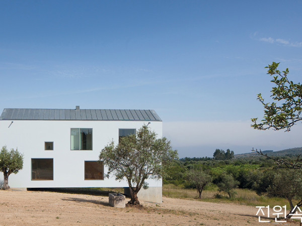 조용한 시골마을, 하얀 집 한 채가 서있다. 초록의 올리브 나무 사이에서 그 존재감을 각인시키며 하염없이 바라보게 하는 그런 집.올리브 나무와 어우러진 하얀 주택의 외관서측에서 바라본 모습. 주차공간과 연결된 긴 계단이 주출입구 앞에 위치한다.주택은 포르투갈의 중부에 위치한 폰테 보아(Fonte Boa)의 시골 땅에 지어졌다. 포도밭과 올리브 과수원이 있는 작은 대지로, 아름다운 산과 계곡이 주위를 둘러싸고 있다. 한때 이곳은 고대 로마시대(BC 4세기경)의 별장이 있었던 장소로, 지금은 주로 아담한 식물과 올리브 나무들로 풍경을 이룬다.주변 나무숲과 계곡의 전망을 활용하기 위해 서측 가장자리에 건물을 놓았다. 덕분에 주도로로부터 가족의 사생활이 보호되고, 채광에 유리한 위치를 확보할 수 있었다. 특히, 기존의 비탈면과 주변 모든 나무들을 그대로 유지 및 보존해야 했으므로, 지형에 큰 변화를 주지 않을 위치를 선택하여 집을 세웠다.주변 자연 환경을 그대로 유지하여 건물과 조화를 이루도록 했다. / 지면보다 낮은 개방형 차고 콘크리트 외벽의 지하층에는 와인저장고를 두었다.SECTION주변 풍광이 거실 안으로 들어온 듯한 큰 창이 인상적이다.목재로 마감한 내부. 계단 칸칸에 모두 수납공간을 두어 다양한 물건들을 넣어 둘 수 있도록 배려했다. 블랙 컬러의 난로는 공간 내 포인트가 되어준다.전통적인 포르투갈의 단독주택 유형을 재해석한 이 집은, 징크로 마감한 경사지붕을 가진 두 개 층의 직사각형으로 이루어져 있다. 콘크리트 구조의 지하층에는 소규모의 와인저장고를 두고 경사면으로부터 분리한 것이 특징이다.도로에서 주택으로의 진입은 대지의 남측 경계에 쌓은 돌담의 개구부를 통해 이뤄진다. 지면보다 낮은 개방형 차고는 콘크리트 벽으로 에워싸인 반지하 구조로 설계되었고, 이곳에는 세탁실과 주거공간으로 올라가는 계단이 놓였다.방풍문이 설치된 집의 입구까지는 플랫폼(Platform) 방식의 긴 계단으로 연결되어 있다. 계단과 부속 공간들로 채워진 두 개 층은 모두 세 부분으로 구성되며 1층에는 주방과 식당, 거실이, 2층에는 분리된 두 침실과 작업실을 배치했다.거실 옆으로 배치된 아담한 크기의 주방 / 현관에 선반을 두어 필요한 물건을 걸어둘 수 있도록 했다. 2층 복도공간HOUSE PLAN대지위치 : Fonte Boa, Fartosa, Penela, Portugal | 건축규모 : 지하 1층, 지상 2층연면적 : 180㎡(54.45평) | 엔지니어 : Paulo Maranha, Paulo Sampaio, Luíis Ribeiro(ECA Projectos)설계담당 : Joana Figueiredo, Catarina Fortuna, Filipe Catarino | 설계 : João Mendes Ribeiro joaomendesribeiro@mail.telepac.pt외관을 닮은 2층 방. 실에 맞춰 제작된 가구 덕분에 공간이 더욱 깔끔해 보인다.멀리서도 눈에 띄는 박공지붕 이층집두 층 사이의 소통은 집의 세로 방향으로 놓인 수납장 겸 계단실을 통해 이루어진다. 또한 내부의 모든 공간은 다양한 방식으로 주변 풍경과 연계되도록 만드는 큰 개구부나 작은 창을 통해, 외부와 특정한 유대관계를 가진다.건축가_João Mendes Ribeiro포르투갈 코임브라(Coimbra) 출신의 João Mendes Ribeiro는 포르투 대학교에서 건축을 전공했다. 이후 코임브라 대학교에서 박사학위를 받았고, 1991년부터 이곳에서 건축디자인을 가르치고 있다. 그동안 여러 설계 작품이 세계 각국의 출판물을 통해 소개되었고, 각종 건축상 수상을 비롯해, 베니스 비엔날레 포르투갈 대표로 참석하는 등 다양한 업적으로 이름을 알리고 있다.취재_김연정| 사진_José Camposⓒ 월간 전원속의 내집/ www.uujj.co.kr