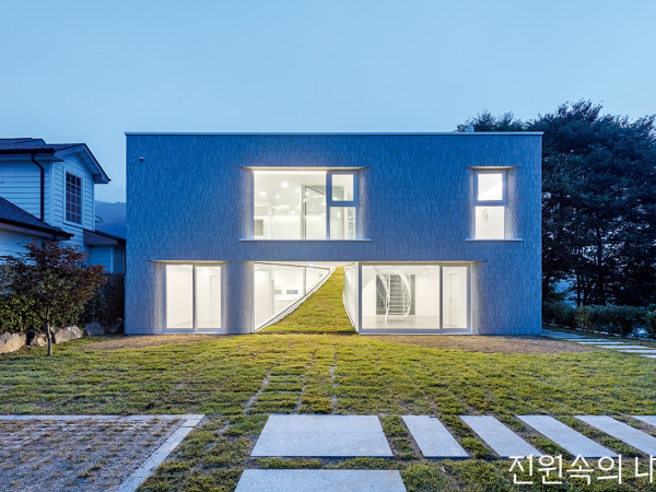 평범한 사각형 건물 사이로 작은 마당이 이어진다. 매일 변화하는 자연에 둘러싸여 가족은 오늘도 푸른빛 풍경을 마주한다.정면과 닮은 주택의 후면부 / 앞마당에서 바라본 모습. 집 중앙을 가로지르는 밸리정원과 실내 계단이 인상적이다. SECTION ①앞마당 ②현관 ③창고 ④가족실 ⑤거실 ⑥주방 ⑦욕실 ⑧침실 ⑨밸리가든 ⑩뒷마당 ⑪테라스 ⑫드레스룸 전원주택 + 3代를 위한 주택경기도 용인시 양지면. 그곳에 조성된 주택단지에 부모님과 젊은 부부 그리고 어린아이가 같이 살기 위한 집이 지어졌다. 50평 남짓의 아담한 이층집에 1층은 부모님 침실과 공용 공간, 2층에 자녀의 가족을 위한 침실 2개가 있다. 부모님이 아이의 육아를 도와주고, 젊은 부부는 도시로 출퇴근하며 연로하신 부모님을 보살피는 가족 3代의 꿈이 담겨 있다.같이 산다는 부담보다 서로를 위하고 이해하는 마음으로 세대별 공간의 독립성은 부여하되, 공동체의 결속을 강화하는 집이 만들어져야 한다고 생각했다.1층 거실과 같은 동선상에 놓인 주방1, 2층을 연결하는 곡선형 계단초월적 공간 + 주거의 공간일단 가족 모두가 독실한 기독교 신자라서 설계 초기부터 거주하는 공간에 기도의 공간, 또는 신성한 공간을 함께 두고 싶어했다. 특히 성경의 일화 중 예수님을 만나기 위해 지붕에 구멍을 내어 내려오는 병자의 이야기를 들려줬다. 그 일화는 방송사 기자로 일하다 높은 곳에서 추락하여 죽을 뻔했으나 지붕으로 떨어져 운 좋게 살았다는 젊은 남편의 개인적 경험과 겹쳐져, 이 집을 디자인하는 정신적 모티브가 되었다.하늘과 마주하는 지붕이나 천창은 초월적 존재와 사람이 만나는 접촉면일 수도 있다는 생각이 들었다. 결국 주택의 일상적 기능을 수용하면서 동시에 그것으로부터 벗어나 무한한 공간으로 연결된 집, ‘하늘로 난 문’을 가진 집을 상상했다.CONCEPT DIAGRAM & CIRCULATION집 안 곳곳의 큰 창들을 통해 내부에는 언제나 밝은 빛이 스민다.HOUSE PLAN대지위치 ▶ 경기도 용인시 처인구 | 대지면적 ▶ 472㎡(142.78평) | 건물규모 ▶ 지상 2층 | 건축면적 ▶ 93.61㎡(28.31평) | 연면적 ▶ 160.05㎡(48.41평) | 건폐율 ▶ 19.83% | 용적률 ▶ 33.91% | 주차대수 ▶ 2대 | 최고높이 ▶ 6.5m구조 ▶ 기초 – 철근콘크리트 매트기초 / 지상 – 철근콘크리트(벽), 무근콘크리트(지붕) | 단열재 ▶ 벽 – 비드법보온판 가등급 2종 150mm / 바닥 – 압출법 가등급 특호 80mm / 지붕 – 압출법 가등급 특호 220mm | 외부마감재 ▶ THK7 지정타일 | 창호재 ▶ KCC PVC 시스템창호 THK31 로이삼중유리, THK24 복층비강화곡유리 알루미늄 커튼월(신양금속공업 제작) | 에너지원 ▶ LPG | 조경석 ▶ THK20 포천석 디딤석조경 ▶ 건축주 직영 | 전기·기계·설비 ▶ pcm | 구조설계(내진) ▶ 터구조 | 시공 ▶ 무원건설 | 설계 ▶ AND(에이엔디)2층 가족실에서는 외부 경사로가 한눈에 들어온다.모든 공간이 하나로 연결된 듯 내외부의 경계가 모호해지며 자연스럽게 공간은 확장성을 가진다.PLAN ①앞마당 ②현관 ③창고 ④가족실 ⑤거실 ⑥주방 ⑦욕실 ⑧침실 ⑨밸리가든 ⑩뒷마당 ⑪테라스 ⑫드레스룸 2층에서 내려다본 밸리 정원천창 + 산책로천창으로 빛을 드리우는 방식은 역사적으로 판테온과 같은 종교적 건축물에 많이 쓰여 왔다. 천창은 중심 공간에서 태양 빛과 날씨의 변화를 온종일 지속적으로 내부에 전달하여 우주적 스케일이 내부에 현현(玄玄)하는 신성한 상징적 경험을 불러일으킨다.한편 건축적 산책로는 르 코르뷔지에의 빌라 사보아(Villa Savoye)에 잘 표현된 것처럼 사람의 움직임에 의해 경험되는 감각의 공간이다. 이 두 개의 건축적 요소를 결합하여 제3의 공간을 구축하고자 했다.시간에 따른 하늘의 움직임과 결합하여 사람의 신체적 움직임에 의해 경험되는 공간은 거주자의 정신적이면서, 동시에 신체적인 주거의 조건을 제공할 것이다.집의 중심부에는 지붕이 뚫리며 2층의 테라스와 1층 앞마당으로 연결되는 구부러진 경사로가 있다. 이 상징적인 외부 경사로와 쌍을 이뤄 실내의 1, 2층을 연결하는 계단이 마치 이중나선처럼 맞물려 돌아간다. 그리고 경사로와 계단 주변에는 두 개 층 높이의 공허부가 둘러싼다. 외부 경사로는 실내 공간 어디에서나 조망되는 입체적 정원으로 쓰일 수 있을 것이다. 이 집의 계단을 오르내리는 과정은 단지 동선을 넘어 세대 간의 만남과 정신적 교감을 활성화 및 상징화하는 중심 공간이 된다.앞마당과 이어진 경사로는 가족만의 입체적 정원이 되어준다.INTERIOR SOURCE내부마감재 ▶ 벽 – 친환경 수성페인트 / 바닥 – 포세린 타일 | 수전 등 욕실기기 ▶ 아메리칸스탠다드 | 주방 가구 ▶ GND조명 ▶ 조명나라, 아트라이팅 | 계단재·난간 ▶ 디딤판 – PL 12T 위 흰색 도장 / 난간 – 지름 30 환봉 위 흰색 도장 | 방문 ▶ 제작 | 붙박이장 ▶ GND 제작2층 부부의 침실. 투명한 유리창을 통해 언제든 1층 공간과 소통할 수 있다. 일상의 반복 + 무한한 변화이른 새벽, 집 중앙 두 개 층 높이의 공허부로 빛이 드리운다. 기도와 명상은 하루를 시작하는 가족의 의식이다.1층에 모여 식사를 하고 부모님께 아이를 맡긴 후 젊은 부부는 일터로 향한다. 1층의 침실 