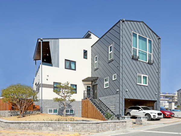 남에게 보여주기 위한 집이 아니라 온전히 ‘살기 위한’ 집을 고민한 결과, 아파트의 편리함과 단독주택의 자유로움을 둘 다 잡은 집이 탄생했다.현관으로 올라가는 노출 계단은 언제든 이웃과 소통하는 여지를 남기면서, 방범에도 유용하다.대단지형 아파트가 빼곡한 택지지구 모퉁이 땅에 들어선 목조주택. 삼면이 노출되어 지나가는 사람들의 시선을 모은다. 길과 길이 만나는 부분을 폐쇄적으로 막는 대신 길을 포용하는 듯 ‘ㄱ’자형 배치를 선택하고 조경 공간으로 선뜻 할애했다. 덕분에 보행자는 시각적으로 편하고, 건물은 규모에 비해 더 웅장해 보이는 효과를 얻었다.가족이 살고 있지만, 오픈하우스로 개방해 예약만 하면 누구나 방문할 수 있는 이 주택은 지하를 사무 공간으로 쓰고, 지상에는 주거 공간이 위치한다. 도심 외곽의 택지처럼 너른 마당은 없지만, 작은 데크 마당과 주방과 연결된 아늑한 테라스가 내외부를 자연스럽게 이어주며 가족의 야외 활동을 돕는다. 또한, 공사 현장으로 인해 생기는 먼지 등을 고려해 외장재는 자동 세척 기능이 있는 세라믹 사이딩과 오염 걱정이 적은 컬러강판을 적용했다. 지하층에 해당하는 부분은 현무암 판석을, 담장과 계단 아래에는 목재로 마감해 외관의 균형을 맞추었다.단조로울 수 있는 외관에 담장과 2층 테라스 벽면의 목재가 포인트가 되어준다. 다차선 도로가 있는 북쪽으로는 소음과 먼지 유입 등을 고려해 상대적으로 창을 적게 냈다. / 테두리에 배치한 벤치가 어우러진 외부 데크는 도심 주택에 꼭 필요한 요소 중 하나다.ELEVATIONHOUSE PLAN대지위치 ▶ 세종특별자치시 만남로6길 3 | 대지면적 ▶ 395㎡(120평) | 건물규모 ▶ 지하 1층, 지상 2층 + 다락 | 건축면적 ▶ 152.72㎡(46.19평) | 연면적 ▶ 378.58㎡(114.52평) | 건폐율 ▶ 38.66% | 용적률 ▶ 59.61% | 주차대수 ▶ 3대 | 최고높이 ▶ 11m구조 ▶ 기초 - 철근콘크리트 줄기초 / 지상 – 경량목구조 외벽 2×6 S.P.F jas 구조목 / 지붕 - 2×10 구조목 | 단열재 ▶ 벽 - 크나우프 에코배트 R21 / 천장 - 크나우프 에코베트 R32 | 외부마감재 ▶ 벽 - 컬러강판, KMEW 세라믹사이딩 16mm, 큐블럭 / 지붕 – 알루미늄징크 | 담장재 ▶ 이노블록 | 창호재 ▶ 융기 베카드리움 33mm 3중 독일식 창호 | 철물하드웨어 ▶ 심슨스트롱타이 hold down, Brace Strap Tie | 열회수환기장치 ▶ 셀파 열교환기 | 에너지원 ▶ 도시가스, 태양광 5㎾구조설계 ▶ ㈜두항구조안전기술사사무소 | 설계 ▶ 건축사사무소 아키포럼 010-5341-6511 | 시공 ▶ ㈜트라움목조주택|1544-2052 http://traum1.com화려한 패턴의 타일로 출입을 환영하는 현관 / 거실 한켠에 마련된 미니 주방과 세탁실. 천창을 내어 환기를 도모한다. 1층 가족실의 벽면에 친환경 흙 마감재를 적용하고 소나무 패턴을 입혀 아트월 효과를 주었다. 안방이 1층, 거실과 주방은 2층으로현관을 거쳐 실내를 둘러볼 때 제일 먼저 놀라는 것은 1층에 주방이 없다는 점이다. 거실 외곽으로 게스트룸까지 방이 4개나 있고, 심지어 반려견을 위한 공간도 계단 아래 자리하는데 말이다. 조명을 켠 듯 밝은 천창 아래 미니 싱크와 인덕션이 조리 시설의 전부일까 궁금해진다. 공중을 걷는 듯 아찔한 기분을 선사하는 유리 계단을 올라가면 그 걱정은 해결된다.시공을 맡은 트라움목조주택 전재환 대표는 “요즘 사람들의 라이프스타일과 환기 및 음식 냄새를 고려해 주방 등의 공용 공간을 최상층에 배치했다”고 말한다.보통은 현관과 같은 층에 공용 공간을 두는 것이 익숙하지만, 외출하고 돌아와 옷을 갈아입고 대부분의 시간을 거실과 주방에서 보낸 후, 잠만 자는 패턴이라면 이 평면이 오히려 합리적이라는 설명이다. 전동 개폐형 천창과 열회수환기장치까지 설치했는데, 이로써 음식 냄새와 열기가 위로 올라가 생활공간을 침범하는 것을 최대한 차단할 수 있었다.2층으로 올라가는 계단의 디딤판은 강화유리 3겹에 사이마다 방탄필름을 끼워 내구성을 높이고, 공학목재로 만든 측판에 끼워 세련스러움을 더했다. / 계단 아래 공간은 반려견 뭉치의 보금자리 침실은 주차장 높이를 맞추기 위해 1층의 다른 공간들보다 두 단 정도 높게 설정되었다.POINT 1 - 계단 하부 실외기 가림막에어컨 실외기 노출이 금지된 지역 규제에 따라 실외기를 외부 계단 하부로 몰고, 루버형 목재로 가려 미관과 기능을 살렸다.지진·화재·미세먼지로부터 집을 지키는 기술처음에는 3층으로 계획해(후에 2층으로 변경, 허가 당시 의무 적용 제외) 내진 설계를 의뢰하면서 받은 구조기술사의 코멘트를 적극 수용하고, 원래 기준보다 한 단계씩은 더 높은 수준으로 시공해 안전성을 높였다. 내진은 설계보다 정확한 시공이 중요한 만큼 골조의 구석구석에 연결철물도 보강했다. 비용은 더 소요되지만, 집짓기 전체 비용으로 따졌을 때 일부분이고 안전성을 고려하면 건축주에게 꼭 권장하는 부분이다.주거 밀집 지역이라 이웃한 집의 불이 옮겨붙지 않는 준불연 외장재를 채택하고, 도로와 인접한 외벽 쪽에는 단열과 차음 효과를 높이기 위해 석고보드도 3겹 설치했다. 방마다 온도조절기와 열회수환기장치가 있어 미세먼지가 심한 날에도 실내 공기