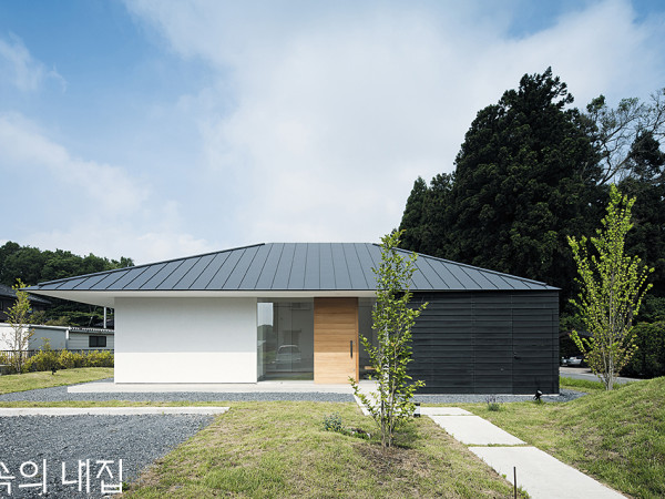 HOUSE PLANLocation : Ibaraki, Japan | Principal Use : Private House Building Area : 114.56㎡ | Total Floor Area : 133.27㎡ Structure : Timber | Photography : Hiroshi Ueda Architect : Naoi Architecture & Design Office www.naoi-a.com이 프로젝트는 일본의 농촌마을인 이바라키(Ibaraki)현에 위치한, 부부를 위해 지어진 주거건물이다. 방대한 크기의 땅으로 둘러싸인 이곳은 육중한 건물도, 시끄러운 소음과 범죄의 위험 및 도시와 관련된 어떤 스트레스도 존재하지 않는 조용하고 사생활이 보호된 지역이다. 주택이 들어서게 될 장소는 밭과 집들이 섞여 서로의 경계가 명확하지 않은 다수의 사이트 중 한 구획이었다. 이러한 대지의 조건을 확인한 후, 우리는 ‘경계가 모호한 열린 공간’이 될 집을 만들기로 마음의 결정을 했다.자로 잰 듯, 정확하게 경계를 나누기보다는 느슨한 방식으로 주택의 가장자리를 정해보았다. 이를 위해 나뭇잎과 제방으로 대지 주변을 에워싸는 작업을 시작했고, 그 결과 가려질 곳과 숨겨질 곳이 적절히 조화를 이룬 단층 주택을 완성할 수 있었다. 이러한 방법은 내부와 외부 또는 건축물과 주변 환경 사이를 특별히 구분 짓지 않도록 하는 사이트 구축에도 도움이 되었다. 특히, 제방은 외부에서 보는 시각적 효과뿐 아니라 내부에서 바라보는 풍경의 변화 역시 만들어 내는 촉매와 같은 역할을 해준다.집 안에 놓인 중정이 내부 공간의 깊이와 가변성의 센세이션(Sensation)을 생산하는 동안, 수평으로 평탄한 사이트의 표면은 주택의 실용적인 공간배치(Functional Layout)를 가능케 했다. 지붕의 중심으로부터 약간의 간격을 두고 놓인 중정과 천장의 기울기 변화, 실들의 배열 또한 주택의 전반적인 공간적 특성을 미묘하게 발생시키는 요인이 된다.내부와 외부 사이에서 이뤄지는 교감은 태양빛과 바람이 통과하는 지붕의 처마 아래 다양한 공간과 중정에서 반복된다. 또한 안과 밖의 경계를 나타내는 적절한 수단으로 처마와 바닥을 이용했다. 지붕의 지원 기능과 모든 슬라이딩 도어 및 기타 설비시설들을 완전히 오픈하여 강조함으로써, 주택 내부는 강한 인상을 남긴다. 반면 외관은 광범위한 덮개가 집 전체를 감싼 듯한 결과를 낳았고, 이 모든 계획들로 인해 자연과 건축이 동등한 가치를 지니는 편안한 주거공간이 완성될 수 있었다.주택을 작업을 마무리하며, 앞으로 모든 최신 건축기법과 기계 및 장치에 의존하지 않고 자연과 공생관계를 유지하며 사계절의 변화와 기상이변, 시간의 흐름을 적극적으로 대응할 수 있는 간단한 기술이 개발되어, 고급스러움과 편안함을 갖춘 집들이 계속해서 지어지길 희망해본다.<글·Naoi Architecture & Design Office>건축가_Katsutoshi Naoi & Noriko NaoiNaoi Architecture & Design Office는 일본 도쿄(Tokyo)에 기반을 두고 있는 건축사무소다. 동경대학교(Tokyo University)에서 건축을 전공한 Katsutoshi Naoi와 동경가정학원대학(Tokyo Kasei Gakuin University)을 졸업한 Noriko Naoi가 2001년부터 이끌어 오고 있다.취재_김연정 | 사진_Hiroshi Uedaⓒ 월간 전원속의 내집www.uujj.co.kr