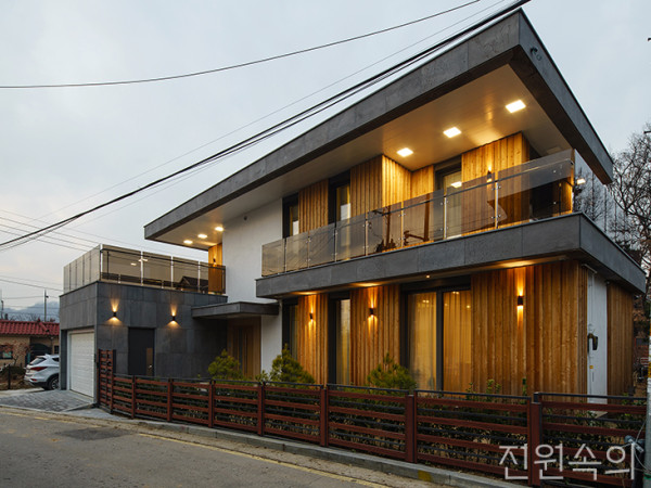 우리는 이 공간의 이름을 애둘러 표현하지 않고 직설적으로 시그니처 하우스라 정했다. 강렬했던 첫 만남의 인상을 가감 없이 드러냈기 때문이다.취재 김연정 사진 김재윤▶ 외부 정면 모습▶ 인상적인 거실 앞 데크전체 60평의 이 공간은 사업가 부부가 훗날 노년을 보내기 위해 설계를 의뢰했다. 대화를 이어가면서 그들의 생각(집에 대한 의견들과 취향)을 이해하는 과정은 그들이 사는 모습 자체가 이 집의 형식을 구성하는 결정적인 단서가 되도록 했다. 단순함의 무게를 갖되 그 안에 온기를 품고 있는 공간이어야 했다.▶ 주택의 후면부 ▶ 단단하게 응집된 형상의 외관밀집된 아파트 단지 사이, 숨구멍처럼 낮은 산으로 둘러싸인 마을에 위치한 대지는 마을 안쪽을 향한 남서쪽은 빛을 받기 좋고 마을 바깥쪽으로 향한 북동쪽은 근경으로 녹지를 조망할 수 있는 형태의 땅이었다. 대지를 경계로 마을 안쪽과 바깥쪽의 높이 차가 약 5미터, 지하층을 두어 마을 안쪽의 집들보다 높은 대지레벨을 계획할 수 있어 시각적 확장을 얻을 수 있는 조건이었다.HOUSE PLAN대지위치 : 경기도 용인시 | 대지면적 : 233㎡ | 건물규모 : 311.87㎡ | 건축면적 110.19㎡ | 연면적 : 전체 311.87㎡, 지하층-112.20㎡, 1층-108.49㎡, 2층-91.18㎡ | 건폐율 47.29% | 용적률 51.36% | 주차대수 4대 | 최고높이 9.488m 구조 : 기초-철근콘크리트 매트기초, 지상-철근콘크리트, 지붕-철근콘크리트 위 무근콘크리트 위 우레탄방수 | 단열재 : 수성연질폼 120㎜ 발포 | 외부마감재 : 노출콘크리트 위 발수코팅, 멀바우 데크재, 테라코사하라 | 창호재 : 이플러스 시스템창호 43mm 삼중유리 전기·기계 : 한얼 건축사사무소 | 설비 : 한얼 건축사사무소 | 토목 : 한얼 건축사사무소 | 구조설계(내진) : 한얼 건축사사무소 | 시공 : 100A associates | 설계 : 100A associates▶ 외부 정면 디테일과 주택의 입구▶ 현관부 모습마을에 진입하여 마주하는 건축의 지하층에 해당하는 매스는 나란히 나열된 이웃집들과 위화감 없이 어우러지게 하되, 마을의 바깥쪽에서 마주하는 건축의 형태는 될수록 단순하게 하여 콘크리트의 무게만을 두어 주위와 대립시켰다.디테일 단면도▶ 채광 좋은 거실▶ 단 차이를 둬 배치한 거실과 주방 겸 식당INTERIOR SOURCE내부마감재 : 벽-도장, 무늬목 / 바닥-포세린타일, 원목마루 / 천장 : 도장 | 욕실 및 주방 타일 : vista 수입타일 | 수전 등 욕실기기 : Treemme, Kartell, 아메리칸스탠다드, 대림바스 | 주방가구 : 현장제작 MDF 위 도장 | 조명 : 테크노전기, Flos 계단재, 난간 : 포세린타일, 도장 | 현관문 : 이플리스 시스템도어 | 중문 : 현장제작(금속자재 위 도장마감 + 강화유리) | 방문. 붙박이장 : 현장제작 MDF 위 도장 | 데크재 : 멀바우 19㎜▶ 주방에서 본 거실과 현관 쪽 전경 ▶ 2층으로 오르는 계단실▶ 1층 파우더룸으로 연결되는 공간▶ ‘ㄱ’자 창이 설치된 정갈한 1층 침실앞마당의 면적을 최대로 확보하기 위해 내부공간을 뒤로 물리고 높은 벽 사이의 좁은 계단을 통해 진입하도록 하여 전이공간으로서 심리적 긴장감을 갖도록 했다. 이 긴장감을 안고 내부공간에 들어섰을 때 마주하는 농밀한 온기는 심리적 안정감을 준다. 공간과 공간의 조직을 가능한 단순하게 하고 크고 작은 프레임을 통해 다시 공간의 흐름을 갖게 함으로써 섬세한 균형을 이루는 공간이 되도록 했다. 결과적으로 이 공간은 주인으로부터 얻은 단서를 표면으로 드러내는 과정을 통해서 외강내유(外剛內柔)한 공간으로 구축된 셈이다.▶ 계단실▶ 깔끔하게 마감된 계단실 공간▶ 2층 복도 끝에 놓인 마스터룸▶ 2층 욕실과 베란다▶ 2층 침실▶ 침실과 연결되는 서재 공간주거공간은 결국 공간과 그곳에서 삶을 영위해 나아갈 사람만 남는다. 흥미로운 것은 그들의 사고와 삶의 방식을 이해하고 그것들을 공간에 담았을 때 비로서 그들의 삶이 담기어지기 시작한다는 것이다. 이 공간 또한 앞으로 그들의 삶이 축적되어 그들이 사는 모습 자체의 공간이 되길 바란다. <글ㆍ100A associate>건축가_ 100A associate [백에이어소시에이츠]1부터 시작해서 가까스로 98을 지나고, 99를 거쳐 드디어 다 다르게 되는 100. 百이라는 것은 하루 낮과 밤, 지구 1년 사시의 생장영장을 상징하는 수이며, 천지의 모든 이치를 상징하는 수이다. 수로서 낱낱이 셈하는 百 그보다 더한 의미를 갖고 있으며 수이상의 것으로 하나의 상징성을 갖는다. 100 A는 시간과 장소를 초월하는 ‘순수성’_천지의 모든 이치, 100을 대하는 우리의 미학적 의견과 태도, 그리고 그것과의 소통을 통한 정리와 해답을 통한 인문학적 기록을 남기고자 한다. 02-919-9135, www.100a-associates.comⓒ 월간 전원속의 내집 www.uujj.co.kr※ 월간 <전원속의 내집> www.uujj.co.kr 본 콘텐츠의 저작권은 (주)주택문화사에 있으며, 이를 무단 이용하는 경우 저작권법 등에 따라 법적책임을 질 수 있습니다.