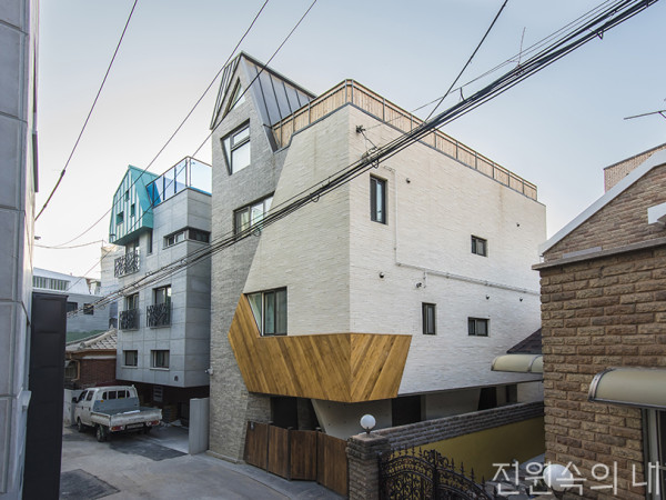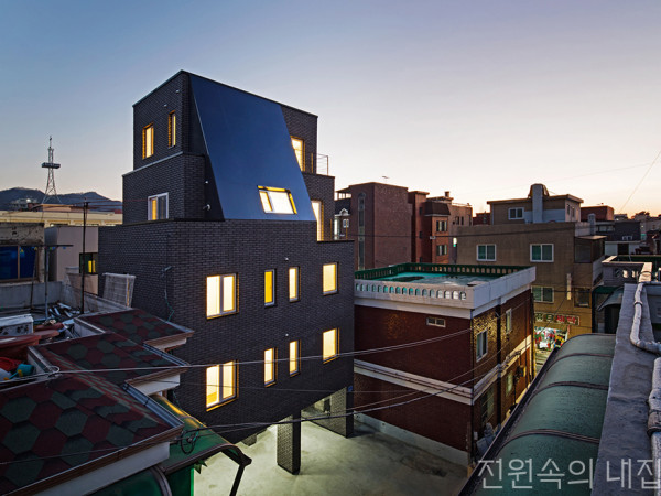 사무실에 찾아온 건축주는 부모님을 모시는 언니 가족과, 곧 결혼을 앞둔 예비 신부인 여동생 가족이 함께 모여 꾸려나갈 다가구 주택을 머릿속에 두고 있었다. 공사비는 두 자매가 반반 부담한다는 계획도 이미 세웠다. 글 오문석 | 사진 이강석가까운 지인끼리 동호인 주택을 짓기 위해 공사비를 공동 부담하는 경우는 가끔 있지만, 자매가 함께 공사비를 부담하여 집을 짓는다는 것이 무척이나 ‘합리적이다’라고 느껴졌고, 부럽기까지 했다.그렇게 설계는 시작되었고, 매주 언니 부부 그리고 여동생 부부와의 미팅을 통해 건축 계획이 진행되었다.3대가 함께하는 두 가족을 위한 주택이었지만, 의외로 계획 설계는 한 달여 만에 완성했다. 이미 건축 상담 이전에 토지의 활용 방안에 대해 많은 고민을 해왔던 건축주라, 필요한 공간을 배치하는 것이나 동선을 풀어가는 과정에 있어 특별한 이견 없이 시간을 축약해 사용할 수 있었던 것 같다.작업실을 선호했던 여동생 가족은 1층의 근린생활시설과 2층의 단독주택을, 3층과 4층의 복층 단독주택은 부모님과 언니 가족이 사용하도록 나뉘어 계획되어졌다.1층의 근린생활시설에는 언제든 조밀하게 지어질 이웃 건물들로 인하여, 자칫 채광에 불리해지거나 외부공간을 누리기 힘들어지지 않도록 중앙부에 중정을 두었고, 이는 1층 작업실의 숨통을 틔어주는 공간이 되었다.건축개요대지위치 : 서울시 마포구 대지면적 : 127.43㎡(38.54평)건물규모 : 지상 4층건축면적 : 75.95㎡(22.97평)연면적 : 210.25㎡(63.60평)건폐율 : 59.60%용적률 : 164.99%주차대수 : 2대최고높이 : 11.8m구조 : 기초 – 철근콘크리트 매트기초 / 벽 – 철근콘크리트 / 지붕 – 철근콘크리트단열재 : 150㎜ 경질우레탄폼보온판(지붕), 85㎜ 경질우레탄폼보온판(벽체), 120㎜ 경질우레탄폼보온판(필로티천장),175㎜ 압출법보온판(지상1층바닥)외부마감재 : 외벽 – T15백고벽돌타일, T10 천연라임스톤타일, T20 애쉬탄화목, 본덱스 오일스테인(투명) / 지붕 – 컬러강판 돌출이음 / 필로티천장 – T15적삼목판재 / 본덱스 오일스테인(돗토리)담장재 : 콘크리트 기초 + 시멘트벽돌 / 시멘트모르타르 / 외부용수성페인트창호재 : LG PVC 이중창호(245㎜) 및 고정 창호(이중고정창, 245㎜) + 22㎜ 로이복층유리에너지원 : 도시가스시공 : HP건축(한승우 대표)설계팀 : 이경훈설계 : 건축사사무소 오파드건축연구소 오문석 http://blog.naver.com/opad_oms 070-8600-0463인테리어소스내부마감재 : 공용부 벽체 – 친환경페인트(국산) / 방 벽체 – 실크벽지(개나리벽지) / 바닥 – 원목마루(피어리스), 포세린타일(이태리산)욕실 및 주방타일 : 포세린타일(중국산)수전 및 위생기구 : 대림바스주방가구 : 한샘(2층), 한샘 키친바흐(3층)조명 : 공간조명, 프로라이팅계단재 : 애쉬집성목 + 평철난간현관문 : 주현관도어 – 금속망입 힌지도어 / 세대현관문 - 단열스틸도어방문 : 영림도어(MDF+필름지)붙박이장 및 신발장 : 아론가구데크재 : T19 라취목 데크재 / 본덱스 오일스테인(돗토리)1층 및 2층 평면도3층 및 4층 평면도4층의 테라스는 가족 모두가 모여서 소통하는 공간이자 방문한 손님들의 마음을 가장 많이 빼앗는 ‘명당’이 되었다. 유일한 다락 공간은 그 크기와 위치에 있어, 언니네 자녀를 위해 특별하게 제공되었으며, ‘소유재’의 가장 좋은 전망을 선물해주는 곳이기도 하다.‘웃음과 넉넉한 여유로움이 넘쳐나라’ 라는 의미로, 건축주가 직접 지어준 ‘소유재’라는 이름처럼, 소유재에 모여 사는 온 가족의 웃음소리가 집 안 구석구석 끊이질 않기를 바란다.<글 오문석>건축가 오문석한양대학교 공과대학 건축학과를 졸업하고, 삼정건축, 원일건축, 양진석건축연구소 등에서 실무를 쌓았다. 일본의 I.C.D.건축설계사무소의 서울지사인 I.C.D.건축연구소에서 소장을 역임했으며, 2008년부터 현재까지 오파드(OpAD)건축연구소를 운영해오고 있다. 평소 협소한 규모의 주거 형태에 대해 고민해오던 중에 진행했던 ‘과천 협소주택 윤집’으로 2014년 ‘경향신문사 상반기 신지식 혁신인’에 선정된 바 있다. 주요작품으로는 명동 메트로호텔 리노베이션(2004년,2014년), ㈜did벽지 진천공장(1,2차), 과천 협소주택 윤집, 광주 원당리 보리네집, 길음동 해솔이네, 도림동 다가구주택, 상도동 쉐어하우스 ‘우주인’ 등이 있다. 현재 동소문동 오피스텔, 신당동 협소주택, 정릉동 협소주택, 마천동 다가구주택, 남양주 수동면 단독주택, 세종시 근린생활시설, 일산 성석동 타운하우스 등을 진행 중이다.※ 월간 <전원속의 내집> www.uujj.co.kr 본 콘텐츠의 저작권은 (주)주택문화사에 있으며, 이를 무단 이용하는 경우 저작권법 등에 따라 법적책임을 질 수 있습니다.