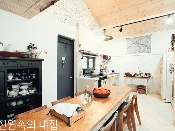 경기도 파주의 작은 마을, 오래된 빈집이 새 주인을 만났다. 아담한 박공지붕 집에 놓인 손때 묻은 고가구와 소품들이 낡은 이야기에 온기를 더한다.취재 조고은 사진 변종석손님과 담소를 나누곤 하는 주방. 간소한 싱크대와 피자팬으로 만든 조명, 직접 만든 그릇 등 소품 하나하나가 멋스럽다.경기도 파주시 탄현면 한 마을에서 인테리어 디자이너 김혜정 씨를 만났다. 그녀가 반겨준 곳은 지난겨울 취재했던 중정이 있는 목조주택이 아닌, 그 근처의 오래된 단독주택이었다. 같은 형태의 박공지붕 집들이 줄이어 서 있는 이 작은 마을은 35년도 더 전에 대북선전 마을로 계획된 곳이라고 했다. 지난 세월의 흔적이 낭랑히 감도는 이곳이 좋았던 그녀는 운 좋게도 시세보다 훨씬 저렴한 1억7천만원에 주택을 매입했다. 19평 남짓한 크기에 보일러도 없는, 낡은 빈집이었다.“처음엔 정말 곰곰이 생각했어요. 방 두 개에 거실, 주방……. 도대체 세수는 어디서 했던 걸까? 사람이 살지 않는 집이었어도 가끔 들러 지내다 갔다고 들었거든요. 집 뒷마당에 비닐천막과 외부수도가 있었는데, 여기서 씻으셨나 보다 했어요. 화장실이야 당연히 밖에 있었죠.”집은 보일러, 화장실 등 설비부터 새로 시공해야 했다. 계획된 마을이라 오·폐수 처리장으로 바로 연결되는 정화시설이 갖춰져 있던 것이 그나마 다행이었다. 오렌지색 지붕은 전 주인이 수리한 것을 그대로 두었고, 주택 건물에 딸려 있던 가건물들은 모두 철거해 최대한 본래의 형태를 되찾는 데 집중했다. 천장을 높게 튼 거실. 모던한 가구와 고가구의 어울림이 자유로우면서도 균형감 있다.낮은 천장을 트고 보니 오래된 나무 질감이 멋스러운 속살이 드러났다. 마음 같아선 그대로 두고 싶었지만, 살림집임을 생각하면 단열을 포기할 순 없었다. 대신 시멘트 벽돌의 내벽은 울퉁불퉁한 표면을 그대로 살려 페인트칠만 했다. 박공지붕의 천장은 지붕 면에 따라 자작합판, 미송합판 등 목재 종류를 달리해 변화와 재미를 주었다. 야간에도 조용조용 쉬지 않고 작업했더니 걸린 시간은 고작 2주, 리모델링 비용은 7천만원이 채 되지 않는다. 안방이 있던 곳은 벽을 터서 널찍한 주방이 되었고, 높은 천장의 거실과 다락, 아늑한 침실과 욕실까지 꼭 필요한 공간만 모아둔 집이 탄생했다. 특히 다락 건너편 창을 통해 보이는 해 질 녘 풍경은 일상의 고단함을 한순간에 잊게 해줄 만큼 근사하다.알록달록 새옷을 입은 주택 외관. 앞집, 뒷집과 똑같은 형태를 그대로 살렸다.이 집의 유일한 방인 침실. 책 조명은 일본 의류매장에서 우연히 본 것을 응용하여 제작한 것이다.욕실에서 주방으로 지나는 복도. 프라이버시를 고려해 불투명 유리 파티션을 두었다. / 욕실 거울은 오래된 나무 문짝을 활용해 만들었다.Remodeling Source외벽 마감재 : 삼화페인트내벽 마감재 : 삼화페인트, 자작·미송 합판, 삼나무·미송 루버창호재 : 공간 시스템창호바닥재 : 레몬트리(독일 수입 원목마루 메이플)욕실·주방 타일 : 을지로 성문타일욕실기기 : 아메리칸스탠다드, 대림주방 가구 : 아트주방주방 블라인드 : 타공 알루미늄 블라인드조명 : 을지로 제이제이라이팅, 이태원 씨앗커튼 : 까사미아 린넨 커튼 리폼금속 : 을지금속 제작문손잡이·레일 : 을지로 반도철물식탁·소파 : 이태원 엔틱 스토리다락으로 오르는 계단. 빈티지TV는 4년간 창고에 있던 것을 친분이 있는 작가에게 부탁해 오디오로 만든 것이다.주방에서 바라본 현관의 모습거실 창에는 린넨 커튼을 사다가 손수 뜨개질한 패브릭을 덧대어 리폼해 달았다.“이번 집의 콘셉트는 ‘창고에 있던 것 다 쓰자’예요(웃음). 새집 지을 때보다 더 마음 편하게, 하고 싶은 대로 작업했어요.”오랜 경력의 인테리어 디자이너답게 그녀의 집엔 늘 예사롭지 않은 감각의 빈티지 가구나 소품들이 가득하다. 이번엔 소장품을 최대한 활용해 한국 고가구와 외국의 빈티지 가구, 소품들을 손 가는 대로 놓았다. 곳곳에 적절히 믹스매치한 철제 TV장이나 주방의 블랙 알루미늄 블라인드 등은 빈티지와 모던함 사이의 중심을 잡아준다.다락 맞은편 창에는 그림 같은 풍경이 담긴다. 보를 건너 창문을 열면 작은 테라스로 나갈 수 있다.나만의 아지트 같은 다락 공간작은 집의 단점을 해결하기 위해 내부는 자작합판과 미송합판, 미송 루버, 삼나무 루버 등 주로 밝은 재료들을 선택했다. 특히 눈에 띄는 자재는 환하고 따뜻한 느낌을 주는 메이플 원목 바닥재. 비싸고 긁히기 쉬운 재료 아니냐는 물음에, 그녀는 “원래 예쁜 것들은 조심조심 다뤄줘야 한다”며 “내 집이기도 하고 마침 면적도 작아 과감하게 써봤다”고 농담 섞인 대답을 한다. 집들이 옹기종기 모여 있는 마을의 다정한 모습을 오래도록 간직할 수 있었으면 좋겠다는 그녀. 내년 봄 소담한 꽃들이 피어날 이 마당에서 꼭 다시 보자던 그 말에, 발길을 돌리며 남은 겨울을 벌써 헤아려본다.인테리어•K-STYLING www.kstyling.netⓒ 월간 전원속의 내집