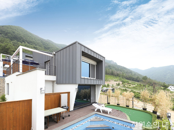 고개를 돌리는 곳 어디든지, 또 언제든지 즐거움이 발견되는 곳, 전남 담양. 그곳에 문을 연 수피오레 펜션은 아름다운 풍경 속에서 머무는 매 순간을 기대감으로 설레게 한다.천 년의 역사를 가진 고장, 담양. 그중에서도 담양 최북단에 자리한 용면(龍面)은 아름다운 무등산과 주변 산세가 어우러져 도심 속 지친 이들의 편안한 휴식처가 되어 주는 곳이다. 담양에서 나고 자란 본토박이 장규호 씨가 이곳에 펜션을 짓게 된 이유도 바로 거기에 있었다. 담양을 찾은 이방인들이 내 집과 같은 편안함으로 자연에 머무는 호사를 누릴 수 있길. 작은 바람으로 시작된 일은 풍수학적으로도 훌륭하다는 대지 위에 현실이 되어, 지난 10월 ‘수피오레’란 이름의 펜션으로 첫 손님을 맞이했다.SECTION ①현관 ②침실 ③욕실 ④보일러실 ⑤주방/식당 ⑥거실 ⑦노천탕 ⑧데크 ⑨야외 수영장 - 경사지 위에 펜션 세 동이 일렬로 놓였다. 맑은 날엔 멀리 무등산이 한눈에 들어온다. - 같은 형태와 마감재로 통일감을 준 외관 / 스터코와 컬러강판, 적삼목이 조화롭게 어우러져 세련된 자태를 뽐낸다.설계 기간만 석 달이 걸렸을 만큼 그는 어느 것 하나 허투루 하지 않았다. 첫 삽을 뜰 때부터 마지막 마감 작업까지 꼼꼼하게 신경 쓰다 보니 봄에 시작한 공사는 한여름이 되어서야 끝이 났고, 300여 평의 경사지에 세 동의 건물이 오밀조밀 차례로 놓였다. 하나의 마을을 이룬 듯, 통일감을 살려 세 동 모두 동일한 모습으로 설계했다. 하얀 스터코 외벽에 회색빛의 컬러강판과 적삼목을 더한 외관은 주변 풍광 속에 자연스레 녹아들어 이상적인 조화를 보여준다.- 건물의 정면 모습- 건물 앞에 마련된 넓은 수영장과 미니 골프장. 바비큐 그릴도 객실마다 배치해 펜션으로서의 완성도와 손님들의 만족도를 높였다. HOUSE PLAN대지위치 ▶ 전라남도 담양군 | 대지면적 ▶ 990㎡ (299.48평) | 건물규모 ▶ 지상 2층(펜션 3동 + 관리동 1동) | 건축면적 ▶ 199.65㎡ (60.39평) | 연면적 ▶ 224.01㎡ (67.76평) | 건폐율 ▶ 19.86% | 용적률 ▶ 22.63% | 주차대수 ▶ 3대 | 최고높이 ▶ 7.62m 구조 ▶ 기초 – 철근콘크리트 매트기초 / 지상 – 철근콘크리트 | 단열재 ▶ 그라스울 24K, 비드법단열재 2종 3호 120mm, 수성연질폼 200mm 발포 | 외부마감재 ▶ 스터코, 무절적삼목, 컬러강판 | 담장재 ▶ 평철 난간 위 문주등 설치 | 창호재 ▶ 이건창호 72mm PVC 이중창호 | 에너지원 ▶ LPG | 조경석 ▶ 화강암 판석 조경 ▶ 나라 건축조경 | 전기·기계 ▶ 엔지니어링전기 | 설비 ▶ 나라 설비 | 토목 ▶ 유진 보강토 | 시공 ▶ 나라 건축 진덕준 | 설계 ▶ 엠제이건축사무소- 객실 전경. 크고 작은 창이 주변의 자연을 액자처럼 담아내 볼거리를 더한다. - 실내는 높은 층고를 바탕으로 모던하면서도 세련된 공간으로 꾸몄다.여러모로 고심한 흔적은 내부 인테리어를 통해서도 여실히 드러난다. 입구를 통해 객실로 들어서면 외부에서는 제대로 확인할 수 없었던 특별한 공간이 곳곳에 자리하고 있다. 가장 먼저 마주하게 되는 곳은 2층까지 활짝 열린 높은 층고의 실내. 거실 앞으로 둔 큰 유리창이 막힘없이 탁 트인 전망을 선사한다. 특히 창 너머 야외 공간은 누구에게도 방해받지 않고 자연을 벗 삼아 휴식을 취할 수 있는 최적의 장소이자 수피오레 펜션만의 차별화가 느껴지는 곳이다.- 계단실 옆 주방에는 간단한 요리를 할 수 있도록 주방 가전과 도구들을 잘 갖춰두었다. PLAN ①현관 ②침실 ③욕실 ④보일러실 ⑤주방/식당 ⑥거실 ⑦노천탕 ⑧데크 ⑨야외 수영장POINT 1 - 숨겨진 노천탕수영장만큼 단숨에 시선을 집중시키는 것은 바로 노천탕이다. 산 그림자 내려앉은 저녁, 노천탕에 몸을 담그면 평화로운 공기가 따뜻한 입김이 되어 온몸을 감싼다.POINT 2 - 침실 앞 테라스객실마다 마련된 테라스. 낮에는 아름다운 풍경을 느끼며, 밤에는 밤하늘에 수놓은 멋진 별들을 바라보며 여유로운 시간을 보낼 수 있다.POINT 3 - 소소한 배려, 텃밭각 동 앞에는 유기농 채소가 심어진 조그마한 텃밭이 마련되어 있다. 바비큐 파티를 하며 손님들이 필요한 만큼 가져다 먹을 수 있도록 한 세심함이 묻어난다.- 1층 침실과 별도로 2층 복층 공간에도 안락한 잠자리를 마련했다. 침구 역시 꼼꼼하게 비교하며 최고급으로 선택해 이곳을 찾는 이를 위한 작은 부분도 놓치지 않았다. 풀빌라 형태의 모든 객실에는 한 가족이 다 함께 즐길 수 있는 넓은 수영장과 미니 골프장을 마련해 마치 자연 속으로 들어온 듯 색다른 분위기를 경험할 수 있게 한다. 게다가 바로 옆에는 노천탕을 갖춰 물놀이 후 욕조 속에 몸을 담그고 여행에서 쌓인 피로를 풀 수 있게 배려했다.INTERIOR SOURCE내부마감재 ▶ 벽 – 친환경 석고보드 위 핸디코트 + 노루표 친환경 페인트 도장, 고재세상 고재 집성판 / 바닥 – 폴리싱 타일, 포세린 타일 | 바닥재 ▶ 이건 강마루 | 욕실 및 주방 타일 ▶ 이정세라믹스 | 수전 등 욕실기기 ▶ 아메리칸스탠다드, 이정세라믹스 | 주방 가구 ▶ 영선 주방 가구 조명 ▶ 광주 신창종합전기 LED 조명, 서울전기조명 등 | 계단재·난간 ▶ 멀바우 + 평철 환봉 난간, 우드존 계단판(집성 멀바우 레이저 철판 가공) | 현관문 
