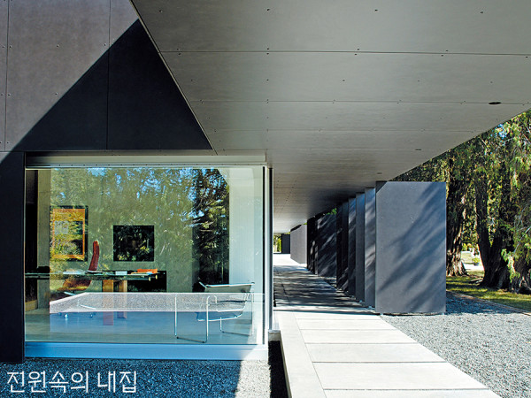 건축의 가치는 건물 자체의 겉모습이 아닌 그 속에 내포된 건축가의 고민을 통해 투영된다. 기존 조건을 극복하면서 더 나은 기능의 건물로 완성되기까지, 공간에 대한 건축가의 새로운 해석은 여전히 진행 중이다. 취재 김연정 | 사진 James Dow SITE 주택은 캐나다 브리티시컬럼비아 주(州)의 밴쿠버 섬과 본토의 태평양 연안 사이 조지아해협 내 솔트스프링 섬(Salt Spring Island)에 위치한다. 16에이커(16acre=약 64,700㎡)에 달하는 넓은 농장에 자리한 이곳에는 잘 자란 전나무(Douglas Fir Tree)들이 동쪽에서 서쪽으로 나눠 길게 줄지어 서 있으며, 사이트를 가로지르는 완만한 경사가 남쪽에서 북쪽으로 형성되어 있다. 사유지의 남쪽 절반은 가지각색의 과실수로 조성된 과수원이 차지하고 있으며, 반면 북측 절반은 건초지이다. 대지 위에는 오래 전에 지어진 오두막 한 채가 있었는데, 매각되어 인근의 한 땅으로 장소를 옮겼다. 따라서 남아 있는 건 기존의 헛간과 차고, 스튜디오 건물들이다. 신축 주택은 전나무들의 남쪽 변을 따라 직선으로 276피트(276feet=약 84m)만큼 뻗어 있다. 과수원은 더 많은 과일나무들을 심어 균형 있는 모습을 이루었고, 이로써 주택의 남쪽으로는 문화적 풍경이, 북쪽으로는 자연경관이 위치하는 명확한 구분이 생겼다. HOUSE PLAN 대지위치 : British Columbia, Canada 구조설계 : Read Jones Christoffersen Ltd. 시공팀 : G.Speed Construction Ltd. 디자인팀 : Greg Boothroyd, Christina Gray, Steffen Knab, Hiro Kurozumi, Renee Martin, John Patkau, Patricia Patkau, Peter Suter 설계 : Patkau Architects(John & Patricia Patkau) www.patkau.ca PLAN 이 신축 주택은 옥외통로를 통해 하나의 주된 주거영역과 방문객을 위한 영역들로 세분화된다. 차콜 컬러(Charcoal-colored)의 섬유 시멘트 외장패널들과 짙은 초록색의 무성한 나뭇잎을 가진 전나무 덕분에 이 주택은 거의 눈에 띄지 않는다. 내부를 묘사하는 것은 반투명 아크릴 패널들로 만든 선형조명이다. 낮에는 40개가 넘는 천창들이 지붕 및 벽체들로 햇빛을 투과해 내부 선형조명이 부드러운 빛을 발할 수 있지만, 밤에는 천창 내부에 장착된 형광등을 통해 안으로부터 빛이 퍼진다. 전반적으로 밝은 분위기 속의 실내 영역들은 철근콘크리트로 된 벽난로 매스와 목재 캐비닛 같은 서비스 공간들로 구획을정리한다. 창문 개구부에는 최대 78피트(78feet=약 23.7m)에 달하는 유리를 끼웠다. 이는 탈착이 가능하기 때문에, 솔트스프링 섬의 날씨가 장기간에 걸쳐 좋을 때 이 주택을 하나의 노천 구조물로 변화시킬 수 있다. <글·Patkau Architects> 건축그룹_ Patkau Architects 건축가 John Patkau와 Patricia Patkau가 설립한, 캐나다 밴쿠버에 기반을 둔 건축사무소이다. 캐나다와 미국 등지에서 작은 주거공간뿐 아니라 공공시설까지 다양한 스케일의 건축 작업을 30여년 이상 진행해오고 있으며, 현재도 활발히 세계 각지의 작품 활동에 매진 중이다.※ 월간 <전원속의 내집> www.uujj.co.kr 본 콘텐츠의 저작권은 (주)주택문화사에 있으며, 이를 무단 이용하는 경우 저작권법 등에 따라 법적책임을 질 수 있습니다.