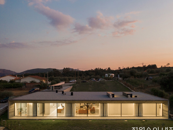 다양한 세계 주택 만나보기 23탄 Tojal House 경사진 대지에 자리 잡은 포르투갈의 단조로운 단층집. 파노라마처럼 펼쳐진 파사드를 통해 햇빛과 자연의 풍경이 자유로이 순환한다. 포르투갈 중부 지방의 한 도시. 가파른 경사를 품은 대지 위에 L자 모양의 단층집이 단정하고 견고한 모습으로 땅을 딛고 서 있다. 두 개의 콘크리트 매스로 분리된 구조는 수평과 수직으로 뻗어나가며 지형과 밀접한 관계를 형성하고, 공간의 일부인 듯 자연스럽게 스며든다. 경사를 활용해 땅속에서 나온 듯한 모양을 하는 건물은 차고로, 다른 하나는 생활 공간으로 구성했다. 가로로 긴 생활 공간은 평지의 대부분을 차지하지만, 전면과 후면에 유리를 적용해 시선이 투과하면서 대지와의 연속성을 이어 나갈 수 있게 계획했다. 집은 ‘태양의 방향’과 가장 좋은 경치를 담을 수 있는 ‘프레임’, 그리고 가족의 ‘루틴’이 자연스럽게 순환할 수 있는 구조에 대한 고민으로 완성되었다. 중앙공간을 중심으로 남쪽과 북쪽에 평행선처럼 조성된 복도는 외부와의 연결고리 역할을 한다. 복도 전체에 쏟아지는 태양 빛으로 충분한 채광을 확보하고, 직사각형의 집 내부 곳곳에 균등하게 빛을 분배한다. 처마의 각도를 세워 빛을 최대한으로 끌어들일 수 있게 디테일을 추가했다. 또한 파노라마처럼 넓게 트인 유리창은 대지 주변의 자연을 넉넉하게 담아내고, 경사 마당의 베란다와의 연결성도 높여 단조로운 집에 자연스러운 방법으로 역동성을 높인다. 공용공간인 주방과 거실은 집의 중심에 넓게 자리하고, 양옆으로 침실과 서재 등 개인적인 공간들이 펼쳐진다. 공용공간은 남쪽과 북쪽의 풍경이 직접적으로 만나는 지점이기에 활짝 열어두어 공간이 순환할 수 있도록 계획하고, 사적공간은 벽을 두어 시선을 차단했다. 화이트와 우드로 단정하게 꾸며진 내부는 깔끔하고 깨끗한 외관과 연결된다. 경사진 마당과 베란다가 있는 남쪽에는 유리창 중간중간 각기 다른 너비의 나무 기둥을 설치했다. 콘크리트와 대비되면서 인상적인 외관을 만들고, 동시에 침실이나 서재 등의 개인 공간 앞에서 약간의 차폐 효과도 얻는다. 대지와 햇빛 등 자연의 요소를 세련된 형태로 적용한 집이다. HOUSE PLAN LOCATION ≫ Porto de Mós, Portugal COMPLETION YEAR ≫ 2019 GROSS BUILT AREA ≫ 569.50㎡ ARCHITECTs ≫ Contaminar Arquitectos, https://contaminar.pt Lead Architects ≫ Joel Esperança Simões, Ruben Vaz and Eurico Sousa hotography ≫ Fernando Guerra (FG+SG), https://ultimasreportagens.com CONTENTS COLLABORATION ≫ NemoFactory(Korea) www.nemofactory.net 건축사사무소 CONTAMINAR ARQUITETOS 2005년 포르투갈 Leiria 지역에서 시작된 건축사사무소. 건축가 Joel Esperança, Ruben Vaz, Eurico Sousa 그리고 Joaquim Duarte가 팀으로 활동하고 있다. 여러 분야에 걸쳐 다양한 규모의 프로젝트를 진행한다. 특히 현대 주거 분야에 관심을 두고 수많은 가능성을 탐구하고 연구한다. 취재_조재희| 사진_Fernando Guerra(FG+SG) ⓒ 월간 전원속의 내집/ Vol.280 www.uujj.co.kr 월간 <전원속의 내집>의 기사 저작권은 (주)주택문화사에 있습니다. 무단전재, 복사, 배포는 저작권법에 위배되오니 자제해주시기 바랍니다.