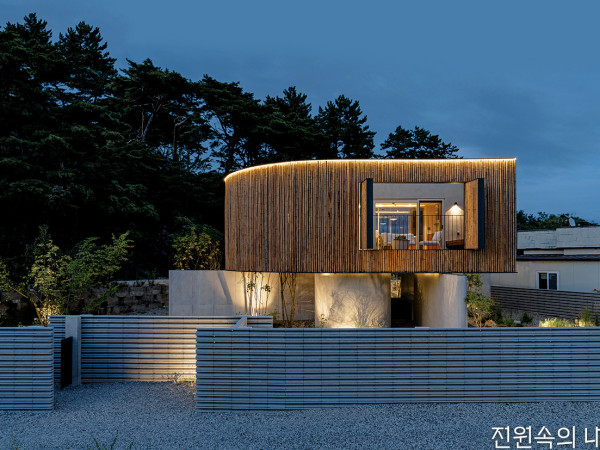 정갈하게 세워진 대나무 루버 사이로 따스하고 아늑한 스테이 공간이 엿보인다. 자연의 물성으로 감싼 입면과 자연과의 조우를 꾀한 내부 포인트가 매력적인 공간.구운 대나무 루버로 만들어 낸 프라이버시와 독특한 질감의 입면대나무 벽으로 둘러싸인 정갈한 요새가 자연 속을 부유하듯 조용히 떠 있다. 기둥처럼 받쳐 주고 있는 노출콘크리트의 물성이 구운 대나무와 만나 신비로운 균형감을 만들어 낸다.포항시 흥해읍, 논과 밭의 풍경을 배경으로 안고 있는 스테이 ‘흥해랑’. 프로젝트를 진행한 ‘포머티브 건축사사무소’는 둑과 면해 있는 낮고 오목하게 패인 대지의 특성상 전면의 도로와 주택의 상호관계 설정이 매우 중요한 포인트였다고 말한다. 특히 도로 측으로부터 발생할 수 있는 소음을 방지하고 프라이버시를 확보하는 것이 관건이었다. 단순하게 벽이라는 가림막으로 시선을 차단하는 일차원적인 방식보다는 다른 방식을 찾고자 했고, 그렇게 선택한 것이 대나무였다. 지역에서 쉽게 구할 수 있는 대나무를 구워 내식성과 내구성을 확보하여 건축물의 주된 입면을 구성할 수 있도록 했다.HOUSE PLAN & INTERIOR SOURCE대지위치 : 경상북도 포항시 건물규모 : 지상 2층 대지면적 : 438㎡(132.50평) 건축면적 : 72.54㎡(21.94평) 연면적 : 99.6㎡(30.13평) 건폐율 : 16.52% 용적률 : 22.65% 주차대수 : 1대 외부마감재 : 콘크리트 노출마감, 담양 구운 대나무 루버 내부마감재 : 바닥 – 수입타일 / 벽·천장 – 테라코트 마감 욕실 및 주방 타일 : 대선세라믹 수입타일 수전 등 욕실기기 : 아메리칸스탠다드, 더죤테크 주방 가구 : 무늬목 마감 제작가구 조명 : 수입조명 현관문 : 이건창호 방문 : 합판 포켓도어, 테라코트 마감 데크제 : 방킬라이 19mm 조경석 : 사비석 잔다듬 조경 : 연일숲 전기·기계·설비 : 지엠이엠씨 구조설계(내진) : 드림구조 시공 : 하우스에이 설계·감리 : 포머티브 건축사사무소“동네가 가지고 있는 여러 자연적인 물성과 하늘 그리고 야산의 소나무 군집을 활용해 건축물과 자연의 관계를 만들어 가야만 했다.” 포머티브는 스테이 곳곳에 외부와의 연결 고리를 조성했다. 현관의 전창을 통해 낮게 깔린 외부 정원을 담고, 계단실에는 둥근 천창을 열어 시간에 따라 각기 다른 각도와 빛깔로 쏟아지는 햇빛을 느낄 수 있도록 했다.계단실 위의 둥근 천창으로 빛의 궤적을 담고, 자연과의 조우를 유도했다. (건축가 제공)침실 공간에는 단이 있어 거실을 향해 걸터 앉을 수 있고 커튼을 통해 공간 구획이 가능하도록 했다.(위, 아래) 곡면 창호를 활용하여 독특한 공간감을 만들었다. 창을 통해 보이는 자연요소가 내부를 더욱 다채롭게 만들어 준다. 외부 데크로 열린 창을 통해 원경으로 시선이 확장된다. (아래 사진: 건축가 제공)PLAN2층의 둥근 코너부는 오픈 부위로 구성되어 있다. 1층의 조경 요소가 하늘까지 뻗어 올라가는 모습을 내부에서도 감상하며 땅부터 하늘까지 이어지는 시선의 확장을 돕는다. 2층은 주방과 식당, 거실이 하나로 열린 스튜디오 타입 방식으로 계획되었다. 외부 데크와 자쿠지 공간은 창으로 열려 있어 그 모습을 내부에서도 그대로 담는다.1층 현관에 진입하면 캔틸레버 구조의 철재계단과 창을 통해 시선이 열린 후정을 맞이하게 된다.2층 외부 데크는 일광욕을 즐길 수 있는 넉넉한 공간과 함께 온수풀을 두었다.2층 건식 세면 공간. 타일, 패브릭, 세면 가구 등의 색감과 텍스처의 조화가 편안함과 따뜻함을 자아낸다.INTERVIEW : 흥해랑 손종태 대표포항 흥해를 선택한 이유는 포항시 흥해읍은 땅이 끝까지 이어지다가 바다로 막힌 지역으로 물고기와 소금이 풍부하고, 토질이 기름져서 생활에 이로움이 많은 곳입니다. 제가 태어나고 자란 곳이기도 하며, 손님들이 좋은 기운 속에서 휴식을 갖기를 바라는 마음으로 준비하였습니다.가장 공들인 공간은 아무래도 숙소 주변 소나무 경관과 잘 어우러지는 구운 대나무 외관이 아닐까, 싶습니다. 담양의 구운 대나무를 가져와 하나하나 오일 작업을 하고, 길이를 맞추고, 사람이 직접 꽂아 시공하였습니다. 오랜 시간을 투자해서 정성 들여 만들어지는 공간에 감탄하게 되는 시간이었습니다.내부 콘셉트와 스테이를 잘 즐기는 방법 흥해랑을 건축하면서 처음부터 생각한 이미지는 고급 호텔의 서비스 이미지였습니다. 고급 호텔에서 누릴 수 있는 특별함과 편안함을 흥해랑만의 분위기로 나타내고자 했습니다. 내부 공간은 현대적이고 모던한 콘셉트로 진행했습니다. 침실과 욕실로 구성된 1층은 휴식에 집중하도록, 야외 테라스와 함께 수영장이 배치된 2층은 자연경관을 한껏 느낄 수 있도록 계획했습니다. 날이 어둑해지면 짙은 노을을 감상하며 야외 족욕탕을 이용하고, 넓은 마당의 자연 속에서 ‘불멍’을 즐길 수도 있습니다.스테이에 특별한 아이템이 있다면 모던한 공간을 위해 ‘비트라’, ‘오도코펜하겐’ 등 덴마크 디자인 가구들을 배치했습니다. 실용적이며 편한 동시에 미적 감각까지 느껴지는, 매력적인 공간을 즐기시기를 원하는 바람이 담겼습니다.숙소 주변에 추천하고 싶은 장소 도보로 약 5분 이내에 있는 ‘솔마루 생