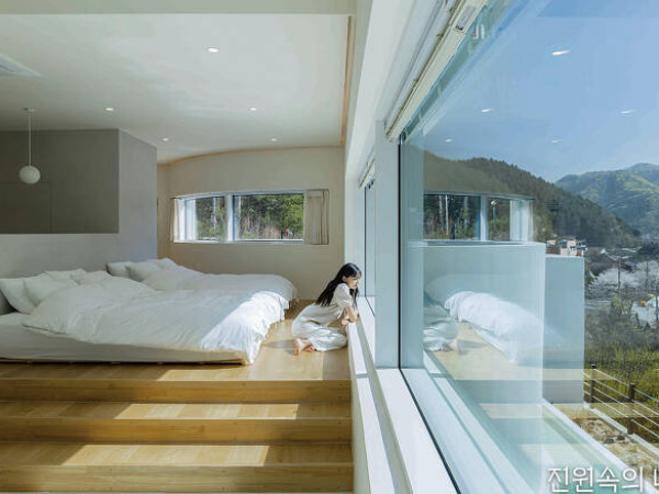 번역 설정글씨크기 조절하기숲 사이로 산세를 따라 그려진 하얀색의 건축물.각각의 도형이 만나 서로의 방식으로 주변의 자연을 받아들이는,특별한 오늘의 여유를 담는 공간이다.HOUSE PLAN & INTERIOR SOURCE대지위치 : 강원도 홍천군대지면적 : 931㎡(281.63평)건물규모 : 지상 2층건축면적 : 246.35㎡(74.52평)연면적 : 317㎡(96.05평)건폐율 : 26.46%용적률 : 34.11%주차대수 : 2대외부마감재 : 외벽 - 테라코트 TK-500 / 지붕 - 우레탄 도장 화이트 / 바닥 - 콘크리트 폴리싱내부마감재 : 테라코트 TK, 우레탄 도장 화이트, 페인트 마감욕실 및 주방 타일 : 아메리칸스탠다드방문 : 예림도어 ABS도어, 도장 및 필름마감, 현장제작시공 : 오운아파트먼트감리 : 건축사사무소 더문설계 : 라이프이즈로맨스단순한 형태의 도형들이 만나 만드는풍성한 매스감을 가진 프라이빗 스테이계곡의 아래쪽, 정남향으로 뻗은 예각의 삼각형 모양 대지. 끝자락에 서면 산과 계곡의 열린 풍경을 바라보고, 삼각형의 긴 변을 따라서는 능선 너머의 푸른 풍경이 이어지는 막힘없는 조건을 가진 이 곳에, 독특한 형태감을 지닌 건축물이 세워졌다. 각각의 수영장을 갖는 두 채의 프라이빗한 공간을 가진 숙소 ‘오유원’은 다양한 도형이 겹쳐지며 공간을 완성하는 콘셉트의 스테이다.대형 리조트처럼 편안한 서비스를 갖추면서도 각각의 숙박객들이 프라이빗한 시간을 가질 수 있어야 하는 것이 오유원 프로젝트의 기본 목표였다.Space U는 보다 높은 곳에서 계곡의 풍경을 내려다보는 뷰포인트 확보에 더 주안점을 뒀다.원형계단 등의 굵직한 공간 포인트 외에는 다른 소품이 없이 공간 자체의 감각만으로 인테리어가 완성된다.두 개의 동은 단순히 분리된 것 뿐만이 아닌 서로 다른 콘셉트를 가지고 있다. ‘Space U’라는 이름의 북측동은 주변의 풍경을 바라볼 수 있는 전망을 갖춘 복층 규모의 객실이다. 1층은 울창한 숲을 바라보고 외부의 풀장과 이어진 홈바, 여유로운 아웃도어 면적의 놀이 공간이 조성되었다. 2층은 와이드한 창과 바로 마주보게 침대를 배치해 자연경관을 막힘없이 볼 수 있다.Space O는 단층이지만 대지의 형태를 따라 길게 펼쳐진 수영장을 가진다. 원형 기둥이 받치고 있는 처마가 이 동의 시그니처 포인트.곡선 벽을 따라 아늑하게 구성된 침실은 슬라이딩 도어를 닫아 완전히 분리될 수 있다.‘Space O’로 명명된 남측동은 단층 구조 속에 침실과 거실, 다이닝, 수영장 등이 자연스럽고 직관적으로 연결되며 외부의 자연경관을 실내로 연결시키는 것에 집중한 공간이다. 실내의 모든 공간과 뻗어져 나가는 듯한 야외 풀에서 필지가 가진 탁월한 자연경관을 바라보며 느리게 흘러가는 시간을 갖는 것이 이 공간의 의의이다.오유원은 하늘에서 바라보면 동그라미와 세모, 네모가 함께 겹쳐지며 매스를 구성하는 형태이다. 길다란 대지의 형태에 맞게, 동시에 주변의 조건과도 조응하면서 온전한 휴식의 시간과 행복한 기억을 여행객에게 제공하기 위한 아이디어가 곳곳에 담겨 있다.Space U는 로비에서 사적인 야외 공간을 한번 더 거쳐 진입한다. 디딤석 길을 걸으면 왼편으로 수영자과 산의 풍경이 나타난다.SPACE POINT : 환대의 공간, 라운지오유원은 두 개의 전혀 다른 형태의 숙소로 나뉘어지지만, 인테리어의 콘셉트나 온도는 따스한 느낌의 백색과 조명, 우드 등으로 통일되어 있다. 그리고 그 중심에 동그란 형태의 라운지 공간이 있다. 회전문을 열고 들어간 라운지에는 카운터 역할을 하는 테이블 외에는 곡선 형태의 창으로 보이는 풍경만이 존재한다. 각각의 문이 아닌 라운지를 통해 각 동으로 갈라지며 숙소로 진입하는 동선을 가지며 여행객은 환대를 받는 경험을 주게 된다. 동시에 사용자가 공간의 형태를 직접 느끼며 오유원이 가진 조형감과 매스의 조화를 알아차리게 만드는 역할을 한다.INTERVIEW : 라이프이즈로맨스 허슬기 대표1층 처마 안으로 설치된 매립형 조명이 수영장의 조명과 함께 Space O의 밤 풍경을 더욱 특별하게 만들어준다.오유원이라는 이름의 의미는오늘의 여유를 담는 공간이라는 뜻입니다. 동시에 여기서부터 각 동의 이름인 O와 U가 지어지기도 했습니다.건축주의 가장 주된 요청은각각의 수영장을 갖는 두 채의 프라이빗 스테이가 기본 요청 사항이었습니다. 또 대지가 있는 홍천 근방에는 유명 스키 리조트가 있습니다. 그렇기 때문에 자연스럽게 대지가 가진 장점을 이용해 스키 리조트보다도 더 행복한 기억을 담아갈 수 있는 공간을 만드는 것이 가장 주된 계획이 됐습니다.가장 주된 콘셉트와 실현 방안은외부에서는 다양한 매스감을 가지고, 내부로 들어설때는 이 공간이 어떻게 만들어졌는지가 드러나는 것이 중요했습니다. 그렇기에 오유원의 진입은 궁금증을 유발하게 만들죠. 내부를 전혀 예측할 수 없는 외관을 지나 둥근 벽으로 들어가면 라운지 공간을 만나고, 각기 다른 공간이 어떻게 자연으로 열려있는지 ‘직접 경험하는 공간’이라는 것이 가장 큰 포인트가 되는 것 같습니다.높은 곡선형 벽으로 연출된 오유원의 외관과 디딤석 길은 지나는 이들로 하여금 건축물 자체에 호기심을 갖게 만들어 준다.