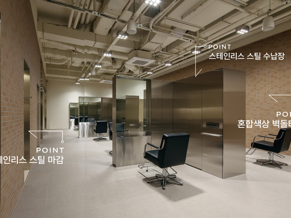 집에 응용하고 싶은 리테일 인테리어 아이디어_ 34탄가장 트렌디하고 감각적인 인테리어의 최전선. 다채로운 상업 공간의 설계와 스타일링 중 주택에 적용할 만한 사례를 꼽아 디테일을 들여다본다. 서른네 번째 장소는 경기도 부천시에 위치한 미용실 ‘팔레트에이치(Palette H)’다.외부와 연결되는 카운터와 대기 공간은 시술실과는 다른 소재의 바닥재를 사용했다.이동만으로도 변화하는분위기가 있는 공간미용실은 변화를 위한 공간이다. 또 각자의 구획된 공간을 점유하기도 하고, 공유하기도 하는 디자이너들의 움직임이 있는 곳이다. 이런 특성들을 담아내기 위해 제작 가구가 활용됐다. 스테인리스 스틸 소재의 가구들은 최소한의 공간을 나누는 파티션이자 카운터나 벽면 등 현장 곳곳에 배치되어 소재 자체로 빛을 반사해 시선을 갈무리시키는 역할을 한다. 주로 따뜻하고 아늑한 색감이 사용되는 주거용 인테리어에 차가운 느낌을 내는 스테인리스 스틸 가구가 더해지면 색다른 중화 작용이 될 수 있다. 또한 손님이 더 큰 변화의 경험을 할 수 있도록 외부 대기공간과 내부 미용 공간을 복도로 분리하고, 바닥 소재에 차이를 두어 분위기의 차이를 뒀다.(위, 아래) 불규칙적인 바닥의 타일 컬러는 시술실로 진입하기 전까지 이어진다. 진입로의 벽부터는 가구에 사용된 스테인리스 스틸 소재가 똑같이 적용되어 표면에 반사된 빛을 따라 하나의 길을 만든다.벽면과 바닥에 활용된 벽돌 타일은 조금씩 다른 색들로 배치해 길과 같은 느낌을 자아낸다. 또 타일 벽면과 바닥에 작은 조명들이 파편처럼 내장되어 더욱 풍부한 공간감을 만든다. 손님은 대기 공간에서부터 뻗어 나온 다소 어두운 타일 복도를 지남으로서 변화의 경험을 하게 된다. 이런 마감재 통일을 통한 분위기 전환의 공간은 욕실 전의 전실 등에 적용되면 이동 자체로도 흥미로운 생활공간이 될 것이다.DETAIL_벽돌 타일들 사이에는 매립 조명과 거울, 스테인리스 스틸 소재가 조화롭게 배치되어 색다른 공간감을 이끌어낸다인테리어 설계_STUDIO FRAGMENT02-6010-8910 | http://frgmnt.kr취재협조_팔레트에이치(Palette H)경기도 부천시 신흥로 190-1구성_손준우| 사진_홍기웅ⓒ월간 전원속의 내집/ Vol.284 www.uujj.co.kr월간 <전원속의 내집>의 기사 저작권은 (주)주택문화사에 있습니다. 무단전재, 복사, 배포는 저작권법에 위배되오니 자제해주시기 바랍니다.