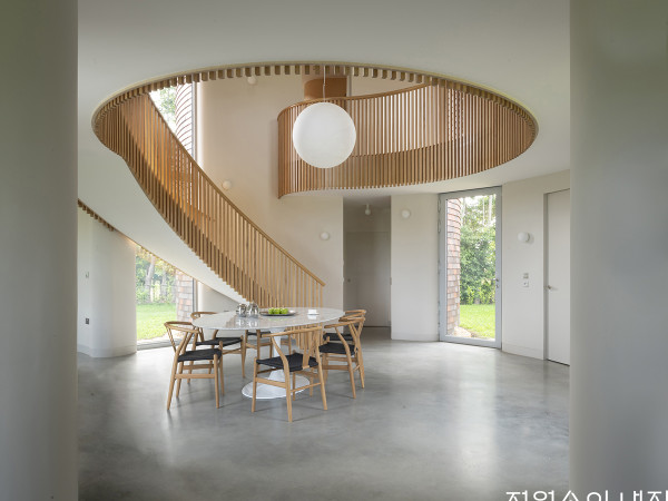 옮기는 걸음마다 중첩된 풍경 사이로 자연을 느낄 수 있는 곳. 높이차가 큰 경사지 위 지어진, 도예가 부부의 집과 작업실이다.오랜 시간 독일에서 생활하며 작업을 하다 돌아온 작가 부부. 두 사람은 부모님과 함께 거주할, 작업실 겸 주택을 건축하기로 하고 사무소를 찾아왔다. 정말 여러 건축사무소와 상담을 하였다는 그들의 이야기에서 집에 대한 소중한 이상과 바람을 느낄 수 있었고, 인연이 닿는다면 더욱 마음을 써야겠다고 속으로 생각했던 듯하다. 그렇게 감사한 인연이 되어 같은 곳을 바라보며, 같은 마음으로 건축의 태어남을 이끌었다.도예 작업을 하는 건축주 부부 내외는 예술가로서 그들의 삶과 작업이 적절히 분리되어 있되, 또 한편 자연스럽게 연결되어 흐르길 원했다. 4m 이상의 높이차가 심한 경사지 특성상 지하를 활용하여 스튜디오 겸 쇼룸을, 지상층은 주거층을 두자는 계획이었다. 다만 스튜디오 공간과 주거공간은 심리적으로 분리감과 전이성을 느낄 수 있는 분명한 변화가 계획된, 차별화된 공간이길 바랐다.내부 동선은 서로 연결되어 있으며, 외부에서는 지하층과 지상층 각각 분리된 진입 동선이 이루어져야 했다. 따라서 지하층은 땅의 흐름을 읽어내고 해석하여 자연스럽게 주차공간과 스튜디오, 쇼룸이 연결된 동선으로 배치되었고 건축의 진입을 이끌고 시퀀스를 부여하도록 계획되었다. 그 모습은 자연과 동화된 땅으로부터의 건축을 이야기하며, 단순한 기하학이 아니라 주변 풍경에 순응하여 자신의 존재를 드러내는 의미를 지닌다.위에서 내려다본 주택의 전경. 부유하는 나선형 계단과 축벽의 중첩이 다양하고 새로운 풍경의 전개를 이끌어 색다른 건축적 경험을 선사한다.크고 작은 창의 배치 디자인이 ㄷ자 형태의 중정을 품은 주택 후면에도 그대로 이어진다.경사지인 대지는 물리적 환경상 건축설계에 난이도를 부여한다. 동시에 평탄화된 대지에서는 표현되기 어려운 차별화된 시퀀스와 독창성을 자연스럽게 제공하는 단초가 되어준다. 설계할 때 쉽고 예측이 가능한 디자인보다 이토록 다양한 변수와 해석이 가능한 조건의 디자인이 오히려 매력적인 것은, 여전히 이 일에 대한 열정으로 가득 차 있기 때문이 아닐까.SECTION1층 현관으로 이어지는 계단. 거친 물성의 노출콘크리트는 대지의 흙을 상징하는 재료다.지하 주차장과 스튜디오&쇼룸의 진입부. 공중에 떠 있는 나선형 계단과 건축물 사이 열린 하늘로 비와 바람, 빛이 내려앉는다.도예 작가 부부의 지하 쇼룸. 창밖, 곡선으로 잘려 오픈된 옹벽의 틈은 계단의 조형미와 어우러져 여백의 풍경이 된다. 이는 건축주의 도예 작품 콘셉트를 형상화한 표현이기도 하다.HOUSE PLAN대지위치 ≫경기도 용인시 수지구 대지면적 ≫375㎡(113.44평) 건물규모 ≫지하 1층, 지상 2층 거주인원 ≫4명(부모님 + 부부) 건축면적 ≫74.91㎡(22.66평) 연면적 ≫282.75㎡(85.53평) 건폐율 ≫19.98%(법정 20%) 용적률 ≫39.95%(법정 80%) 주차대수 ≫2대 최고높이 ≫10.15m 구조 ≫기초 - 철근콘크리트 매트기초 / 지상 - 철근콘크리트 단열재 ≫벽 - 비드법보온판 2종2호 180T / 최상층 천장 - 압출법보온판 1호 220T 외부마감재 ≫벽 - 노출콘크리트 위 발수 코팅 + 스터코 아쿠아솔(미국산) / 지붕 및 두겁 - 0.7T 알루미늄 징크 담장재 ≫산석 쌓기, 조경석 쌓기, 에메랄드그린 + 대나무 식재 창호재 ≫공간시스템 알루미늄 단열창호 97mm AL, 35mm 로이 3중유리 열회수환기장치 ≫말레이(독일제) 벽부형 에너지원 ≫LPG 조경석 ≫자연석(발파석) 조경 ≫조경상회(시공 - 주원조경), 한아름조경 전기·기계·설비 ≫㈜덕수이엔지 구조설계(내진) ≫SDM구조기술사사무소 설계 ≫아키텍츠601 시공 ≫아키텍츠601 × 제이아키브건폐율이 20%밖에 되지 않는 대지 조건을 활용해 지하층을 최대로 계획하고 작은 볼륨의 지상층을 감싸 안는 듯한 형상의 유기적인 곡선의 형태를 만들어냈다. 그것은 건축적 조형미로서의 의미도 갖지만, 건축주인 작가 부부의 도예 작업에서 받은 영감이 크게 작용했다. 단순함 가운데 한국적인 선의 흐름, 중첩의 미학이 현대적인 감성으로 완결된 도예 작품이 건축의 표상이 되어 본 주택의 정신으로서 담긴 것이다. 또한, 작은 볼륨의 지상층 주거공간은 공간과 공간 사이에 켜의 볼륨인 ‘중정’을 삽입했다. 덕분에 내부와 외부가 자연스럽게 흘러 답답하지 않은 자연에 머무르는 풍경으로 거주자를 인도한다.대나무 정원의 차경이 정서적 평온함을 안겨주는 스튜디오 내부. 지상층인 주거공간으로 향하는 진입 계단은 쇼룸과 스튜디오의 경계 사이 좁고 긴 동선으로 공간의 전이가 이루어지도록 계획되었다.중첩, 틈, 선, 켜 등의 디자인 언어들이 전시 작품과 긴밀히 호흡하는 쇼룸 전경. 작품이 지닌 감각적이고 동양적인 선과 색이 콘크리트의 미감, 원목의 온기와 어우러져 아늑하고 정적인 분위기를 이룬다.구조는 기초와 지상층 모두 콘크리트 구조로 계획되었으며, 인접한 산과 환경적 영향으로부터 내밀성, 내구성을 더해주도록 설계되었다. 외장재는 훨씬 안정적인 자정 성능을 자랑하는 ‘아쿠아솔’이라는 미국산 스터코 제품을 선택해 유지