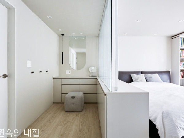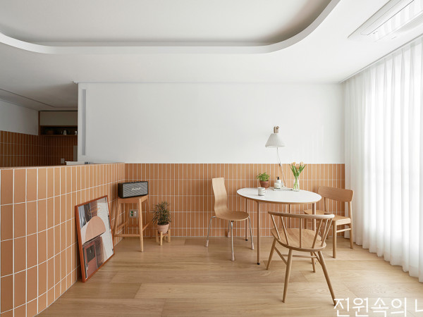 사는 이의 가치관과 삶의 흔적이 고스란히 기록되는 공간, 집. 깨끗한 도화지 같은 바탕에 곡선과 은은한 조명이 어우러져 따스한 분위기를 낸다.사랑스러운 두 딸과 엄마, 아빠가 함께 따스한 일상을 만들어가는 새 보금자리. 1층과 2층, 다락으로 구성된 타운하우스 주택은 가족의 삶과 취향을 담아 보드랍고 포근한 공간을 이룬다. 1층에는 주방과 다이닝, 거실, 욕실, 아이방이, 2층에는 갤러리 같은 소거실과 안방, 욕실과 드레스룸, 작은방이 놓였다. 다락으로 오르면 나지막한 박공지붕의 놀이 공간, 넉넉한 수납공간과 테라스가 자리한다. 구조 변경은 거의 없었지만 군더더기 없는 새하얀 여백에 곡선과 간접 조명, 생활을 고려한 편의 요소들이 더해진, 가족에게 꼭 맞춘 집이다.현관에서 거실로 이어지는 복도를 따라 주방과 다이닝룸, 계단실과 욕실이 있다.복도의 회색 벽면은 핑크 톤 욕실이 대비를 이루며 포인트가 되어준다. 곡면 처리한 코너 덕분에 동선이 자연스럽다.널찍한 아일랜드 키친은 대리석 패턴의 박판 타일로 마감했다. 주방을 지나 집 모양 창을 낸 문이 있는 곳이 아이방이다.안으로 들어와 가장 먼저 마주하게 되는 현관은 이 집의 축소판과도 같다. 흰색이지만 따뜻한 톤의 마감재와 신발장이 있는 아치문, 천장의 곡면 디테일 등이 인테리어 콘셉트를 함축적으로 보여준다. 중문을 열고 곡면의 코너를 자연스럽게 돌아서면 긴 복도를 따라 널찍한 주방이 나타난다. 맞은편의 회색 벽면은 마이너스 메지로 면을 분할해 단조롭게 느껴지지 않도록 했으며, 분할된 면에 맞게 계획된 문 뒤로 핑크빛 욕실이 숨어 있다.화이트&우드 조합의 다이닝룸. 벽에 원형 매립 선반을 만들어 취향에 따른 디스플레이 연출이 가능하다.주방에서 연결되는 세탁실. 넉넉한 수납이 가능한 팬트리가 숨어있는 곳이기도 하다.주방에는 요리를 좋아하는 엄마의 특별 요청으로 2,800×1,100(mm) 크기의 아일랜드 키친을 만들고, 대형 박판 타일을 적용해 이음매 없이 매끈하게 마감했다. 널찍한 아일랜드가 장 본 물건들을 정리하기에도 편리하다고. 이어지는 동선의 다이닝은 우드와 화이트가 어우러진 심플한 공간으로, 벽에 원형의 무늬목 매립 선반을 배치해 카페 같은 분위기를 물씬 풍긴다.시원한 공간감의 거실. 아트월 좌측 코너를 곡면으로 처리해 커튼을 걷었을 때 숨길 수 있는 커튼 박스를 만들었다.POINTPOINT 1_현관 신발장내부 디자인을 함축적으로 보여주는 현관. 밖으로는 벤치형 수납장만 하나 두고, 아치형 출입구에 미닫이문을 설치하여 숨은 신발장을 마련했다.POINT 2_자매를 위한 벙커룸놀이방으로 활용할 아이방은 계단과 사다리가 있는 벙커룸으로 구성했다. 복층 공간은 퀸사이즈 매트리스 크기를 기준으로 하여 침대로도 쓸 수 있다.POINT 3_다락 테라스집 안에 머무는 시간이 많은 요즘, 더욱 소중해진 다락 테라스에는 개방감 있는 폴딩도어를 설치했다. 마당을 대신해줄 프라이빗한 야외 공간이다.거실은 이 집의 하이라이트. 무려 5.3m에 달하는 천장고의 시원한 공간감을 자랑한다. 리모델링을 맡은 그루아키텍츠는 이 개방감을 극대화하기 위해 기존 몰딩과 단차를 정리해 미니멀한 벽면과 천장을 완성했다. 곡선 디자인의 천장 간접 조명에서는 빛이 부드럽게 퍼지고, 시원하게 트인 전면 창에는 싱그러운 바깥 풍경이 가득 담긴다. 아트월 창가 측에는 커튼을 걷어 숨길 수 있는 곡면 벽을 만들어 자연스럽게 커튼 박스를 만들어주었다. 창문 맞은편 벽면은 테라코트 슈퍼화인으로 마감하여 벽면에 노을빛이 비칠 때, 밤에는 업라이트 간접 조명을 받을 때 특유의 텍스처가 살아난다.하나의 방 안에서도 다양한 공간을 넘나들며 재미있게 놀 수 있는 아이방. 자매를 위한 아지트가 되어줄 벙커룸이다.벙커 계단 하부는 옷장과 선반을 만들어 활용했다. 방문에 낸 창은 부모가 아이들이 놀이하는 모습을 언제든 확인할 수 있게 해준다.자매의 놀이방으로 사용되는 아이방은 거실 반대편 끝에 자리한다. 벙커룸, 박공지붕 출입구, 계단과 사다리 등 다양한 공간 요소가 모여 있어 키즈 카페 못지않은 곳이다. 벙커룸 2층 공간에서 아이들은 크고 작게 열린 창 너머로 다양한 시선을 경험할 수 있으며, 간접 조명을 설치해 천장고를 최대한 확보하고 눈부심을 예방하는 배려도 잊지 않았다. 특히 퀸사이즈 매트리스 크기에 맞춰 디자인, 제작하여 아직 어린 아이들이 좀 더 자라면 방을 분리해 침대로 활용할 수 있게 한 점이 인상적이다.INTERIOR SOURCE대지위치 ≫경기도 김포시 거주인원 ≫4명(부부 + 자녀 2) 연면적 ≫226.46㎡(68.50평, 다락 및 테라스 65㎡ 포함) 내부마감재 ≫벽 - 벤자민무어 스카프엑스, 테라코 테라코트 슈퍼화인 스프레이 / 바닥 - 세림세라믹 수입 포세린 타일, 구정마루 스웨디시화이트(셰브런), 구정마루 브러쉬 골드 티크스카치(셰브런) / 천장 - 벤자민무어 울트라스펙 욕실 및 주방 타일 ≫세림세라믹 수입타일 수전 등 욕실기기 ≫더죤테크, 아메리칸스탠다드, 퓨로 양변기, 세면대·수건장 –자체 제작 주방 가구 ≫자체 제작(살리체 하드웨어, 리얼스톤 빅슬랩 타일 상판), 한스그로헤 