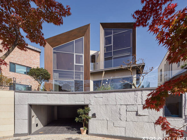 <단란한 네 식구. 삶의 가치와 취향을 고스란히 녹여낸 집>SECTION ① AV룸 ② 알파룸 ③ 창고 ④ 주차장 ⑤ 썬큰 ⑥ 현관 ⑦ 거실 ⑧ 주방 ⑨ 보조주방 ⑩ 놀이방 ⑪ 욕실 ⑫ 반려견 화장실 ⑬ 안방 ⑭ 드레스룸 ⑮ 방 서재 테라스 세탁실 보일러실수완동 주택은 사다리꼴 대지의 형상에 맞게 건물을 배치했다. 대지 특성상 주차장 이 있는 지하층이 1층처럼 보인다.주택 생활을 꿈꾸는 건축주는 대부분 층간소음 등의 이유로 아파트 탈출을 꿈꾸며 우리를 찾아온다. 처음 접하는 건축설계 과정의 ‘낯섦과 막연함’으로 본인의 생각을 말로 전달하는 과정을 어려워하는 것이 일반적이다. 우리는 그들이 하는 말을 잘 경청해서 원하는 바를 건축에 녹여내기 위해 많은 시간을 할애한다. 수차례의 미팅, 여러 질문을 통해 스무고개를 하듯 설계의 방향성을 맞춰나간다. 이런 시간이 축적되어 건축주는 자신의 건축에 익숙해지고, 긴 여정을 거쳐 준공단계에 이르면 우리 못지않은 전문가가 되어 있다.앞서 설명한 방식이 보통의 설계과정이라면 수완동 주택은 조금 달랐다. 건축주는 이미 지어진 단독주택을 매입하여 거주 경험을 충분히 가졌고, 덕분에 가족에게 적합한 집의 방향성을 정확히 알고 있었다. 건축주는 단순히 거주하는 기능을 넘어 오랜 시간 머무르며 다양한 이벤트가 일어날 수 있는 집을 원했다. 어린 막내딸을 어렵지 않게 어르고 능숙하게 재우는 아빠 건축주의 모습을 보며 그 이유를 짐작했다. 엄마와 아빠, 두 딸까지, 단란한 네 식구를 위한 집. 함께하는 시간이 삶의 중심인 가족인 것이다.지하층의 멀티룸. 손님과 가벼운 미팅은 주 생활공간으로 진입하지 않고 이곳에서 이루어진다.습기에 약한 지하 공간에는 썬큰을 계획하여 환기에 용이하도록 했다.HOUSE PLAN대지위치 ≫ 광주광역시 광산구 대지면적 ≫ 323.20m2(97.77평) 건물규모 ≫ 지하 1층, 지상 3층 거주인원 ≫ 4명(부부 + 자녀 2) 건축면적 ≫ 152.21m2(46.04평) | 연면적 ≫ 476.93m2(144.27평) 건폐율 ≫ 47.09% | 용적률 ≫ 94.77% 주차대수 ≫ 3대 | 최고높이 ≫ 12.05m 구조 ≫ 기초 –철근콘크리트 매트기초 / 지상 – 철근콘크리트 단열재 ≫ 경질우레탄단열재 150mm, 압출법특호 120mm, 150mm 외부마감재 ≫ 벽 – Thk20 대리석(가스콘블루-브러쉬 천연석재), 우드패널(우드테크놀로지) / 지붕 –컬러강판(마름모 이음) 창호재 ≫ 알루미늄 시스템창호(이건창호 43mm 3중유리) 에너지원 ≫ 도시가스 목공 ≫ 김석태 목공방 조경 ≫ 수창농원 전기·통신 ≫ 주식회사 투라인 설비 ≫ 팔마이엔지 | 구조설계(내진) ≫ ㈜에이펙스 인테리어 ≫ 오렌지 유동균 시공 ≫ ㈜이산건설 설계 ≫ 사계절프로젝트 건축사사무소집에서 다양한 취미 활동을 할 수 있길 원했던 건축주의 바람을 담은 지하층의 AV룸주택의 대지는 타운하우스 단지 내에 자리한다. 3면이 땅에 묻혀 있는 부채꼴 모양의 대지로, 법규상 지하에 있는 주차장 진입로와 대문이 건축 정면에서는 지상 1층으로 읽힌다는 이점이 있었다. 이러한 특성을 살려 대지 형태에 맞게 2개의 사각형 매스를 벌려 배치하고, 벌어진 틈에 다양한 반 외부 공간을 조성했다. 지하층에는 도로에서 바로 진입 가능한 주차장과 취미 활동이 가능한 멀티룸을 두고, 매스가 벌어진 틈에 썬큰(sunken)을 계획하여 지하의 채광과 환기 문제를 해결했다. 또한, 가능한 큰 개구부를 계획하는 동시에 구획된 공간의 모든 문을 열면 하나로 막힘없이 이어지는 동선이 생기도록 설계했다. 이는 습기에 약한 지하 공간의 바람길을 열어주어 통풍에 이로운 역할을 한다.주택 1층으로의 진입은 지하층 내부를 통해서도 가능하지만, 대문을 통과해 외부 진입로를 따라 1층 현관문으로도 이어진다. 현관문을 열고 들어서면 건축주가 원했던 넓은 현관 공간이 나타난다. 어린 자녀가 두 명이기에 아이들의 자전거, 유모차를 보관하는 등 다양한 기능을 수행할 수 있도록 면적을 충분히 확보했다. 거실과 주방은 나란히 배치하여 엄마가 주방에서 요리를 하더라도 아이들의 활동에 잠깐씩 참여하거나 관찰이 가능하도록 했다.가족이 집에 돌아왔을 때 처음 접하는 공간이다. 대문에서 현관으로 향하는 계단부는 벽을 부드러운 곡면으로 계획하여 편안하고 따뜻한 분위기를 연출했다.1층 실내로 들어오면 가장 먼저 마주하는 장면. 거실과 주방을 함께 배치했다.주방 팬트리 옆에는 자녀들의 놀이방을 두었다. 이곳은 아이들의 놀이방인 동시에 놀잇감을 정리·보관하는 공간이기도 하다. 보통 어린아이가 있는 가정은 거실이 온갖 장난감과 책으로 채워지기 마련인데, 설계단계에서 수납영역을 공간으로 구획하면 거실이 부모와 자녀 모두를 위한 공간이 된다.부부침실과 자녀방이 있는 2층은 가족의 사적인 영역이다. 처음부터 부부와 자녀의 영역을 완벽히 분리하여 두 딸이 성장한 후에도 사적 영역을 같은 층에서 공유하는 데 불편함이 없도록 했다. 3층은 부부만을 위한 여가 공간과 2층과 다른 방향의 넓은 테라스를 계획했다. 주택 내에서 크기와 방향을 달리한 테라스를 통해 다양한 경험을 할 수 있기를 바라는 의도에서다. 넓은 테라스 옆에는 야외활동을 