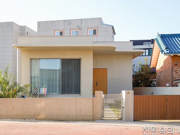 무채색의 돌담 사이로 피어난 주황색 빛깔. 바위와 나무, 설악산의 정취가 자연스럽게 묻어나는 '주황집'에서 평범한 일상을 벗어나 주황빛 에너지를 충전한다.자연 환경과의 긴밀한 관계 속 흥미로운 시각적 공간의 탄생주변의 자연과 어우러지며 튀지 않는 인상으로 우두커니 서 있는 돌담집 하나. 방향을 조금 틀어 들어가니 강렬한 인상의 주황색 빛깔이 돌담 사이로 번쩍하고 그 존재감을 내비친다. 덤덤한 건축물처럼 보이지만, 미세하게 기울어져 내려오는 지붕 선과 파사드로 인해 보는 각도마다 형태가 조금씩 달라지는 묘미가 있다.벽 마감부터 바닥과 아웃도어 의자까지, 주황색으로 물든 중정 공간에서 하늘을 바라보며 사색하는 시간을 가져본다.앞쪽의 돌마당은 기존 구옥에 있던 돌들과 토목 공사를 진행하면서 모아둔 돌들을 자연스럽게 배치했다.HOUSE PLAN & INTERIOR SOURCE대지위치 : 강원도 속초시 건물규모 : 지상 1층 대지면적 : 467.16㎡(141.32평) 건축면적 : 87.67㎡(26.52평) 연면적 : 87.67㎡(26.52평) 건폐율 : 18.77% 용적률 : 18.77% 주차대수 : 2대 외부마감재 : 종석 긁기 내부마감재 : 노출콘크리트, 종석 긁기, 마이크로토핑 욕실 및 주방 타일 : Studio GDB 커스텀 타일 수전 등 욕실기기 : Vola 주방 가구 : Post Standards 조명 : Flos 조경 : 4t 구조설계(내진) : 아르스미국기술사사무소 시공 : 경도건설 설계·감리 : 원애프터 one-aftr“단순한 주거 공간을 넘어 건축물, 사람 그리고 식물 등 다양한 생명체가 공존할 수 있는 하나의 매개체를 상상했습니다.” 프로젝트를 진행한 ‘원애프터 one-aftr’는 ‘주황집’을 둘러싸고 있는 자연환경의 특성을 디자인에 반영했다. 설악산 산지의 특징인 돌산의 이미지를 외관에 담았고, 대지 주변으로 형성된 바위와 계절에 따른 나무의 변화로부터 영감을 얻었다. 갈라진 돌 속에서 광물이 나오는 것과 같이 외관이 파여져 노출되는 표면들은 단풍색과 같은 주황색으로 공간을 감싸주어 스테이의 아이덴티티를 나타내고 있다.노출콘크리트와 주황색 포인트 요소들, 그리고 은은하게 공간을 밝혀주는 조명이 주황집 특유의 분위기를 만든다.맑은 날에는 키친 아일랜드 뒤의 폴딩 창과 게이트, 그리고 뒷마당 쪽 슬라이딩 창호를 열어 건물 전체를 주변 자연과 연결할 수 있다.침실 공간은 단차를 낮추어 공간감을 분리하고 가구를 통해 시야를 차단해 주었다.PLAN‘주황집’은 들어서는 길에서 보이는 건축물의 벽을 담으로 구성해 대지의 경계가 자연스럽게 건축물로 흐르도록 하면서, 동시에 주황색 게이트를 통해 대지와 명확한 경계를 조성했다. 게스트는 문을 여닫을 때마다 경계의 다양성을 경험할 수 있다.스테이 내부 공간은 4m 폭의 칸 6개로 구성되어 있는데, 기본적으로 하나의 공간으로 연결되면서도 각각의 칸마다 주거에 필요한 역할을 한다. 남동쪽에 위치한 두 개의 칸은 중정과 야외 데크로 조성해 담 너머로 보이는 주변 나무를 내외부 모두에서 느낄 수 있도록 했다. 북쪽으로 열린 큰 창을 통해 설악산의 전경을 담아내며 채광과 자연스러운 공기의 순환을 확보하는 공간을 만들었다.해가 주황색 중정과 벽면에 반사될 때는 집 내부도 주황빛으로 물든다.(위, 아래) 나무숲의 풍경이 펼쳐지는 뒷마당. 기존에 자리하고 있던 나무들이 설악산의 풍경을 프라이빗하게 만든다.INTERVIEW : 주황집 김성열 대표속초에 숙소를 오픈하게 된 계기는 속초는 제가 태어나고 자란 고향입니다. 호텔업을 하시는 아버지의 영향 때문인지 호텔 비즈니스에 대한 의지를 마음 한편에 가지고 있었고, 호텔을 만들기 전에 먼저 작은 집을 사람들에게 보여보자고 생각했습니다. 그리고 내가 가장 잘 아는 도시에서 시작해 보는 것이 좋겠다고 생각했습니다.프로젝트 콘셉트의 시작은 비행기를 타고 제주도를 가던 도중 창밖으로 보이는 제주도 구옥들의 알록달록한 지붕을 마주했습니다. 회색 지붕 아래의 사람들보다 빨간 지붕 아래에서 사는 사람들이 더 활력 있어 보인다는 상상을 했습니다. 공간을 구성할 때 모양과 물성보다 컬러에 집중해서 구현해 보면, 각자의 경험을 기반으로 그 공간의 아이덴티티를 다양하게 상상하는 기회가 될 것이라고 생각했습니다. 그래서 몇 가지 컬러의 집을 시리즈로 구현하는 프로젝트, ‘수집’을 기획했습니다. ‘수집’ 프로젝트의 첫 번째 집이 ‘주황집’입니다. 이후 수영장이 있는 ‘파랑집’과 와인을 판매하는 ‘포도집’을 준비하고 있습니다.포인트 컬러로 주황색을 선택한 이유 ‘수집’ 프로젝트의 첫 번째 집을 짓기 위해 속초와 고성의 땅은 다 보러 다녔던 것 같습니다. 마침내 설악산 아래 장재터 마을에 있는 150평 남짓한 땅을 찾게 되었습니다. 설악산과 동해 사이를 잇는 쌍천 옆에 위치한 마을로 큼지막한 돌들이 많기로 유명합니다. 우연히 어느 땅에 놓여 있는 깨진 돌을 발견하게 되었습니다. 깨진 돌 사이를 보니 철분 때문인지 주황색의 선들이 있었는데 회색의 돌과 주황색의 선들이 매우 조화롭게 보였습니다. 그래서 이 땅에 짓는 집은 주황색과 회색의 조합이어야 가장 자연스럽겠다고 생각했습니다.스테이 내 애정하는 소품은