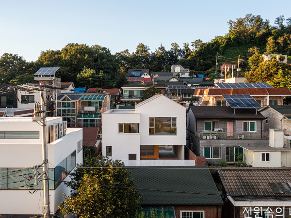 판교 햇살 · 마당 · 풍경 깊은 집 맥락과 조건 68평 남짓한 판교의 단독주택 필지이다. 북서쪽으로 도로를 두고 있어 필지의 3면이 인접 필지에 접하고 있다. 어린 아들과 딸을 둔 젊은 부부로 남편은 IT 회사를 아내는 변호사 사무실을 다니는 부부이다. 남쪽 방향으로 사방이 인접필지인 조건이기에 햇빛이 잘 들고 마당을 통한 일상 생활을 원했다. 부모님이 오셔서 육아를 도와주시기에 어머님을 배려한 공간과 아이들이 좋아하는 공간을 만들고 싶어 했다. 집에서 재테크 근무도 자주 있기에 일상의 집과 독립된 업무공간도 필요했다. 햇살 마당 풍경 깊은 집 북쪽 진입의 3면이 인접 필지인 조건에서 필지의 동서 폭을 조정하면서 마당은 남쪽에 만들어진다. 마당을 배치하면서 실들은 ㄱ자집으로 남북으로 깊이가 생기는 집이 된다. 마당을 중심으로 1층은 거실과 사랑방, 주방이 접한다. 2층은 테라스 마당까지 계획하여 안방과 가족실 아이방들이 외부공간을 자유롭게 접할 수 있게 계획되었다. 이러한 1, 2층 마당들은 햇살을 깊이 있게 들이는 역할과 함께 내부 방들과 연계되어 주변 환경을 편하게 경험하게 된다. 채광을 위해 1층 북쪽 주방의 천창과 계단실 창을 계획하여 깊이 있게 햇살이 들어오는 집이 되도록 했다. 여기서 마당은 가족들 방들의 관계를 만들면서 스스로 풍경이 되는 장소가 되고 있다. 다락은 별도로 독립되게 계획되어 부부의 재테크 근무 공간이면서 옥상마당으로 연계되는 휴식 장소가 된다. 건축개요 건축물 주소 : 경기도 성남시 분당구 판교동 용도지역 : 도시지역, 제2종 일반주거지역 주용도 : 제1종전용주거지역, 지구단위계획구역(판교) 대지면적 : 227.00㎡ 건축면적 : 110.90㎡ | 연면적 : 194.84㎡ 건폐율 : 48.85%(법정 50%) | 용적률 : 85.83%(법정 90%) 층수 : 지상 2층 구조 : 철근콘크리트구조 마감 : 외장 – 모노타일 / 내부 - 석고보드 위 수성페인트 또는 지정벽지 시공 : 본집 설계 : ㈜리슈건축사사무소 홍만식https://blog.naver.com/richuehong2/222766448150 설계팀 : ㈜리슈건축사사무소 백민호(BAEK MIN-HO) 02-790-6404 육아를 고려한 아이들이기억하게 될 집 아이들의 육아를 위한 공간은 1층과 2층으로 나눠 계획되었다. 육아를 위해 오시는 어머니 방은 1층에 독립되게 마당과 접하게 계획하여 편히 지낼 수 있게 하였다. 1층은 거실과 주방 영역이 마당과 연계되는데 비 맞지 않는 큰 마루 영역을 만들어 마당과 거실을 잇는 반 외부공간이 된다. 거실과 주방 마당과 마루공간이 서로 연계되면서 아이들의 자유로운 놀이 장소가 되는 것이다. 2층은 테라스 마당을 중심으로 아이들 방과 안방이 구성되는데, 아이방 하나는 가족실과 테라스 마당을 한 공간처럼 개방되게 이용할 수 있게 가변적인 문과 창호로 계획되었다. 다른 한 아이방은 책을 좋아하는 아이기에 윈도우 벤치로 테라스 마당을 접할 수 있게 했다. 이처럼 유연한 공간의 가변성과 내 외부를 자유롭고 중첩되게 경험할 수 마당 집 아이들이 커가면서 기억하게 될 장소가 될 것이다. 건축가홍만식_ ㈜리슈건축사사무소 서울시립대학교 건축학과를 졸업하고 동대학원에서 석사를 마친 후, 원도시건축과 구간건축, 에이텍건축에서 실무를 쌓았다. 2006년 디자인과 디벨럽(Design & Develop)이 합쳐진 리슈건축을 설립하였다. 현재까지 ‘공존을 위한 병치’, ‘사이존재로서의 건축’ 등의 질문을 던지며 디자인 작업하고 있다. 서울시립대학교 건축학부 겸임교수(2012~2017)로도 역임했고, 2013 대한민국 신인건축사 대상 최우수상, 2018 서울시 건축상 우수상, 2019 경기도 건축문화상 동상 등을 수상했다. 주요작품으로는 청라커낼큐브(근린생활시설), KSL사옥, 성수동 THE GROUND, 동교동 UFO, 양재 보이드라인, 판교 햇살 깊은 마당집, 청주 비담집, 양평 필경재, 거제 아침고요마을, 거제 스톤힐, 통영 지그재그 하우스 외 다수가 있다. /네이버블로그_ 리슈건축이야기 구성_이준희| 사진_김재윤 ⓒ월간 전원속의 내집 / www.uujj.co.kr 월간 <전원속의 내집>의 기사 저작권은 (주)주택문화사에 있습니다. 무단전재, 복사, 배포는 저작권법에 위배되오니 자제해주시기 바랍니다.