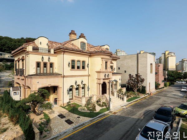 THE CLASSICAL MANSION미국 유명 고전 저택을 보는 듯한 품위가 느껴지는 집.보이는 모습 뿐만 아니라 내실까지사는 이의 자긍심을 담아냈다.둥글게 입체감 있는 전면은 유럽의 성채와 같은 든든함을 느끼게 한다.1층 홀의 모습. 왼쪽 서측에는 식당과 주방이, 오른쪽 동측에는 응접실이 자리한다.고급주택들이 즐비한 판교, 그중에서도 여유로운 곳으로 통하는 분당 운중동에서도 돋보이는 주택을 만났다. 보는 이를 압도하는 클래식한 주택은 두 필지를 합한 대지에 들어선 만큼 면적이 넉넉했다. 대지는 단지 내에서 제일 높은 레벨이어서 전망도 좋고, 도로가 전면으로 뻗어 시야에 막힘이 없다. 건축주 부부는 자녀들과 편안한 생활을 할 수 있는 지중해풍 클래식 스타일의 주택을 원했다. 또한 넓은 대지를 충분히 활용해 미국 대저택의 느낌을 누릴 수 있기를 희망했다. 이를 제대로 구현하기 위해 모양만이 아닌 오리지널 자재를 해외에서 수급하다 보니 공기가 예상보다 늘어졌다.HOUSE PLAN대지위치 ≫ 경기도 성남시 분당구대지면적 ≫ 461.20㎡(139.51평)건축면적 ≫ 219.44㎡(66.38평)연면적 ≫ 327.78㎡(99.15평)건폐율 ≫ 48.03%용적률 ≫ 71.07%주차대수 ≫ 2대최고높이 ≫ 12.99m구조 ≫ 기초 –철근콘크리트조 / 지상 – 경량목구조 2×6 구조목재(미국산 더글러스, 아이조이스트, 공학목재 빔, 미국 CDX 천연합판)단열재 ≫ 미국산 에코단열재(벽-R19 / 지붕-R37)외부마감재 ≫ 외벽 –미국식 시멘트 스터코 베리언스 마감, 수입라임스톤 / 외단열 –스카이텍(미국 CDX 천연합판) / 지붕 – 스페니쉬 유형기와 5단 쌓기담장재 ≫ 에메랄드그린창호재 ≫ 미국 앤더슨 창호철물하드웨어 ≫ 심슨스트롱 타이, 탐린, 메가타이열회수환기장치 ≫ 미국산 열교환장치에너지원 ≫ 도시가스, 태양광 패널조경석 ≫ 사비석설계 ≫ 네이처스페이스 010-2022-5209 https://naturespace2022.com벽을 따라 둥글게 올라가는 계단, 그 중심에 자리한 샹들리에가 우아함을 뽐낸다.미국식 친환경 주택을 기본 콘셉트로 삼았고, 단열 성능이 좋은 북미 창호를 사용하였다. 해당 주택은 그 외관만으로도 마치 지중해에서 그대로 옮겨온 듯한 느낌이다. 외장은 스터코플렉스를 사용하였고, 지붕에 지중해풍 기와가 겹겹이 쌓여 중후한 느낌이다. 현관에 설치된 커다란 라임스톤 기둥은 흡사 미국의 대저택 입구를 연상케하며 안정감을 선사한다. 현관으로 이어지는 아치형 계단은 사비석 판재로 마감하였고, 양측으로 라임스톤 기둥이 방문객의 동선을 안내한다.현관에서 실내로 들어올 때 맞아주는 기둥들은 실외와 실내의 분위기를 부드럽게 전환해준다.식당 반대편에 위치한 응접실. 한켠에 자리한 벽난로가 아늑한 대화를 돕는다.가족 모두의 라이프스타일을 녹여낼 수 있는 여유가족 구성원에게는 개별적으로 각자의 침실이 배치되었는데, 그에 딸린 화장실과 거실이 각각 존재한다. 자녀의 프라이버시와 라이프스타일을 존중하고, 개인별 생활에 집중할 수 있도록 배려한 설계 의도가 반영되었다. 1층에는 게스트룸과 화장실, 그리고 커다란 거실과 다이닝룸을 두었다. 현관으로 들어오자마자 맞이하는 큰 기둥 8개로 인해 이국적인 분위기가 물씬 풍긴다. 입구에서 정면으로 보이는 아치형 계단은 2층에서 당장이라도 어느 왕국의 공주가 걸어 내려올 듯하다. 널찍한 거실은 큰 파티를 열어도 무리가 없을 정도로 여유롭다. 현관과 거실, 주방까지 하나의 동선상에 막힘없이 이어지는 공간은 일체감이 느껴진다. 헤링본 스타일의 원목 마루와 따뜻한 느낌을 전하는 실내의 아이보리 페인팅, 그리고 이를 비추는 조명이 어우러져 실내가 한결 고급스럽다.마스터룸과 아이방 앞에 자리한 홀에서는 간단한 대화나 쉼이 이어진다.마스터룸은 취침을 위한 침대공간과 일상을 보내는 전실로 구분되었다.럭셔리한 공간과 품격있는 일상거실에는 멋들어진 벽난로와 사방을 감싸고 있는 커다란 창호들이 인상적이다. 덕분에 채광이 좋고 환기 역시 손쉽다. 대리석으로 마감된 벽난로는 매립하여 공간 활용도를 높였고, 벽난로 위 멋진 거울과 크리스털 장식들이 럭셔리하게 보인다. 추운 겨울 벽난로에 모닥불을 피워놓고 가족들과 도톰한 카펫 위에서 담소도 나누며 소위 ‘불멍’을 즐긴다면 먼 외국까지 갈 필요가 있을까 싶다. 메인 주방은 시공사에서 디자인하고 제작 발주한 가구들로 클래식하게 꾸며졌다. 메인 주방 바로 옆으로 보조주방을 배치하여 각종 수납이 편리하고 여유롭다. 세탁기나 건조기를 별도로 배치하지 않고 보조주방 테이블에 매립하여 실내 공간의 낭비를 줄였다.건축가의 설계가 반영된 오더메이드 가구와 브라질산 심해석 상판이 인상적인 주방.욕실과 바로 이어지는 드레스룸 겸 파우더룸. 욕실 가구와 컬러 톤을 맞춰 연속성을 부여했다.건식으로 활용하는 2층 메인 욕실. 세면대에는 볼을 두 개 설치해 분주한 아침에도 공간만큼 여유롭다.INTERIOR SOURCE내부마감재 ≫ 내부 전체 –미국산 던 에드워드 천연페인트 / 바닥 –수입 티크 원목마루(헤링본) / 타일 – 이탈리아 타일욕실 및 주방 타일 ≫ 이태리 타일수전 등 욕실기기 ≫ 수전 - 미국, 이탈
