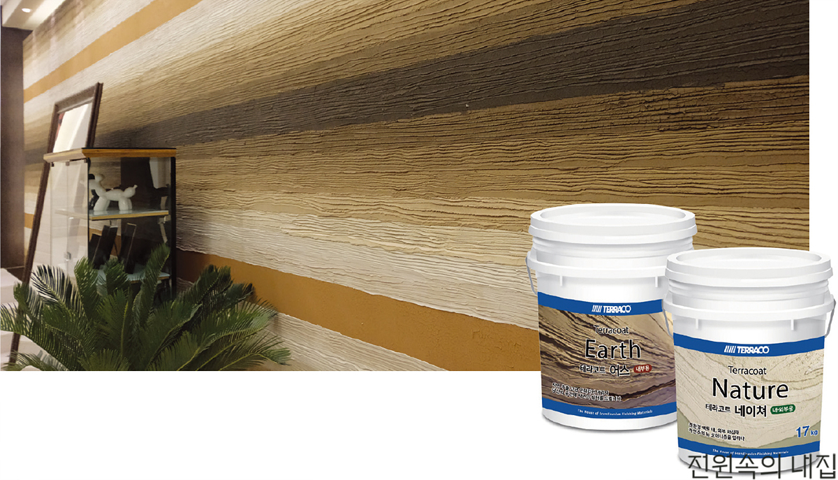 ‘테라코트 어스(Earth)’는 자연에서 추출한 10여 가지의 순수한 흙에 허브, 편백, 쪽, 옥, 숯 등 천연원료를 첨가한 내부용 천연 벽면 마감재이다. 자연의 색과 특유의 아트패턴을 구현할 뿐만 아니라, 쾌적하고 건강한 실내 환경을 제공하며, 콘크리트 위, 석고보드, 합판, 벽지 등 평활한 실내 면에 시공이 가능하다. ‘테라코트 네이쳐(Nature)’는 친환경 백토와 천연 라임을 주원료로 한 내외부 고급 마감재로, 쉽고 빠르게 시공할 수 있고 벽면의 장식 효과가 뛰어나 아름다운 외관 연출에 효과적이다. ▶ ㈜테라코코리아 www.terraco.co.kr