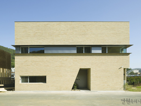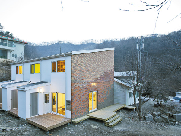 전북 진안에 위치한 깊은 산속 대안학교. 그곳에 세 명의 선생님이 가족들과 함께 거주하게 될 아담한 보금자리가 완성되었다. 공간의 제약을 극복하고, 따로 또 같이 살아가는 그들의 집을 소개한다. 구성 김연정 사진 황효철 ▲ 세 명의 선생님 가족들이 함께 거주할 대안학교 사택의 외부 ▲ 세 집의 거실을 관통해 남측 외부공간까지 연결되는 터널을 만들었다. ELEVATION ▲ 크지 않은 면적을 효율적으로 활용하기 위해 집을 세로로 분할했다. ◀ 대지와 접한 세 집은 각각 개인적인 마당과 독립된 입구를 가진다. ▶ 남측에서 바라본 건물. 색이 다른 벽돌로 은은한 문양을 만들었다. 이 공간은 함께 사는 선생님들이 서로 쉽게 만날 수 있는 통로가 되고, 선생님과 아이들이 더 쉽게 접할 수 있는 모임의 공간이 된다. 또한 기능적으로 ‘작은 집’의 한계를 극복해 ‘큰 공간’으로도 사용할 수 있는 장점을 가진다. 이 세대 간의 과감한 연결은 이곳에 함께 사는 대안학교의 선생님들이 집을 개인적인 공간으로서 뿐만 아니라 학교와 아이들과 더 많이 접촉하기 위한 ‘열린 공간’으로 인식하고 있기 때문에 가능한 일이었다. 전라북도 진안, 그중에서도 모랫재 고개를 넘어 산길을 구불구불 돌아서 도착해야 하는 산속에 십수 명의 선생님과 수십 명의 아이들이 가족과 같은 공동체를 이루며 가르치고 배우는 대안학교가 있다. Three.one House는 이곳의 선생님들을 위한 사택을 짓는 프로젝트이다. 집의 이름에서 알 수 있듯, 이 집은 세 분의 선생님 가족들을 위한 곳이다. 하지만 대지에서 건물을 지을 수 있는 건축면적이 약 32평 정도로 두 개 층으로 하더라도 총 64평밖에 되지 않았다. 따라서 한 집당 약 21평의 공간으로 어떻게 집을 나누느냐가 첫 번째 고민이었다. 이에 우리가 선택한 방법은 세 집을 세로로 나누는 방식이다. 우선 각 집이 균질하게 개인적인 마당을 가질 수 있고 통풍과 환기에 유리하며 구조 및 단열에도 장점이 있기 때문이다. 다음으로 고민한 것은 작은 집이 가지고 있는 공간의 한계를 어떻게 극복해서 더 넓게 사용할 수 있게 하느냐에 있었다. 이곳에 사는 선생님들은 이 집을 단순히 개인적인 공간으로서만 인식하는 것이 아니라 아이들을 비롯한 학교 안의 구성원들과 더 많이 만나고 접촉할 수 있는 열린 공간이 되기를 바랐다. 따라서 물리적·심리적으로 더 넓은 공간, 열린 집이 필요했다. 집과 집 사이에는 가변적 벽체를 두어, 필요에 따라 열린 공간으로 사용 가능하다. SECTION HOUSE PLAN 대지위치 : 전라남도 진안군 부귀면 지역지구 : 보전관리지역, 생산관리지역 대지면적 : 532㎡(160.93평) 건물규모 : 지상 2층 건축면적 : 106.09㎡(32.09평) 연면적 : 197.92㎡(59.87평) 건폐율 : 19.94% 용적률 : 37.20% 최고높이 : 8.14m 공법 : 경량목구조 구조재 : SPF 구조목 지붕재 : 아스팔트싱글 단열재 : 유리섬유 R19 + 38㎜ 에너지세이버 외벽마감재 : 벽돌 + 스타코플렉스 내벽마감재 : 도장(던에드워드) 창호재 : PVC system 창호 시공 : Max Min House(원오연빌더 http://blog.naver.com/wonbuilder) 설계 : JYA-RCHITECTS 070-8658-9912 www.jyarchitects.com건축비 : 3.3㎡(1평)당 400만원(다락 포함) ◀ 2층으로 올라가는 계단실의 심플한 모습 ▶ 방과 욕실로 구성된 2층은 지극히 사적인 공간이다. PROCESS◀ 각 선생님의 취향에 따른 컬러를 집안 곳곳에 반영하였다. ▶ 개방감이 느껴지는 1층 내부 전경 PLAN – ATTIC / PLAN- 2F / PLAN – 1F INTERIOR SOURCES 바닥재 : 동화 크로젠 강화마루 욕실 및 주방타일 : 한양타일 수전 등 욕실기기 : 대림바스 주방가구 : 한샘 조명 : SAMIL / LIMAS 데크재 : 하드우드(멀바우) ▲ 지붕의 높이를 조정한 덕분에 각 집에는 다락공간이 마련되었다. 우선 개인적인 공간인 침실과 방과 욕실을 2층으로 올리고, 상대적으로 개방적인 공간인 거실과 주방을 1층에 배치하였다. 그리곤 이 세 집의 거실을 관통해서 남쪽의 외부공간까지 연결시키는 터널(Tunnel)을 만들었다. 이 터널 공간은 집과 집사이의 가변적인 벽체를 통해 만들어지며, 함께 사는 선생님들이 서로 쉽게 만날 수 있는 통로가 될 뿐만 아니라 선생님과 아이들이 모일 수 있는 모임공간이 된다. 이로써 작은 집의 한계를 극복하고 필요에 따라 큰 거실공간을 만들어 낼 수 있었다. 물론 이 열리는 벽을 닫았을 때 발생할 수 있는 세대 간 소음을 최대한 차단하기 위해 문틀에 차음용 고무패드를 시공하고, 차음제가 들어간 문을 이중으로 설치하였다. 즉, 인접한 두 세대가 함께 문을 열어야만 비로소 두 집사이의 벽이 열린다. 세 집은 모두 같은 구조를 가지고 있다. 하지만 세 선생님들은 취향이 확연하게 달랐다. 덕분에 각각 다른 색과 아기자기함으로 채워지고 있다. 마치 흰 종이에 서로 다른 그림을 그려가듯이 그렇게 집이 완성되어가는 것이다. 결국 이 집은 세 개이기도 하지만 하나가 되기도 하는, 그런 집이 되었다. <글 _ 원유민> 건축가 집단 JYA-RCHITECTS원유민<span lang="EN-US" style='letter-spacing: 0pt; font-family: "나눔고딕",NanumGothic,Sans-serif; mso-fareast-font-family