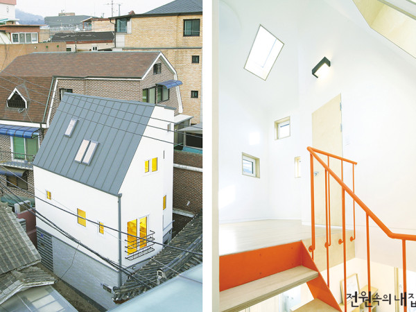 작은 땅에 지어지는 작은 집은 더 치밀한 설계 아이디어와 시공 디테일을 요구한다. 건축가 권현효의 말처럼, 사는 이가 면적이 아닌 공간을 누리며 산다고 느낄 수 있도록 깊은 고찰을 더해 지어야 하는 것이다. 이런 진심을 담은 프로젝트가 서촌마을 한 귀퉁이에서 방금 마무리되었다. 취재 이세정 사진 변종석, 건축사사무소 삼간일목 제공 ▲ 수직적 공간감을 극대화한 3층. 추후 다락방을 설치해 가변적으로 활용할 수 있다. ▲1층은 창이 없되, 2층과 3층은 채광과 전망을 위해 적절하게 창을 배치했다. HOUSE PLAN 대지위치 : 서울시 종로구 대지면적 : 48.95㎡(14.83평) 건물규모 : 지상 3층 건축면적 : 27.60㎡(8.36평) 연면적 : 73.42㎡(22.24평) 건폐율 : 56.38% 용적률 : 149.99% 최고높이 : 9.56m 공법 : 기초 – 철근콘크리트조, 1층 - 철근콘크리트조, 2~3층 – 경량목구조 지붕재 : 리얼징크 단열재 : 1층 외벽 - T90 압출법보온판, 1층 바닥 - T90 비드법보온판2~3층 벽 - 25K 그라스울, 지붕 - T240 연질우레탄 외벽마감재 : 1층 - 모노타일, 2~3층 – 스타코플렉스 창호재 : T39 로이 3중유리 / PVC시스템창호(엔썸) 내벽마감재 : 친환경수성페인트 바닥재 : 온돌마루 설계 : 건축사사무소 삼간일목(권현효) 02-6338-3131 www.sgim.co.kr시공 : KS HOUSING(케이에스하우징) ▲ 오래된 도심 풍경 속 작고 높은 집이 눈에 띈다. ▲ SECTION 서울 도심에서 자연의 풍경과 역사의 흔적을 생활의 일부로 느끼며 사는 동네는 흔치 않다. 낡은 것이 편하고 불편함에 익숙해진 사람들의 여유가 묻어나는 서촌 작은 골목길 한구석, 삼단고음집이 소박하게 자리 잡았다. 두 자녀를 둔 젊은 부부을 위해 근린생활시설( ‘건축법’에 의해 나누어지는 건축물의 용도 중 하나로 도보로 쉽게 접근이 가능한 보통 일상생활에 필요한 시설을 말한다. 줄여서 ‘근생’이라 부르기도 하고 슈퍼마켓, 제과점 등이 이에 속한다.)이 포함된 주택을 설계하면서, 소형주거의 물리적 크기의 한계보다 삶의 방식에 대한 고찰을 공간에 담아내는 것이 더 큰 숙제였다. 각층에 담긴 소리는 다르지만 하모니를 이루려는 노력으로 4개월의 설계와 4개월의 시공을 거쳐 소담하고 다채로운 ‘작은 집’을 완성했다. 토지대장상 부지면적은 18평이지만 전면도로의 폭을 확보하고 인접한 한옥이 점유한 부분을 제외하면, 가용면적은 14평에 불과했다. 실제건물이 지어질 수 있는 건축면적은 8평, 연면적은 22평인 작은 땅이다. 부지의 남쪽으로 한옥이 있고 북측과 동측으로는 3층 건물이, 2m 폭의 도로 건너편 서측에는 1층 주택이 자리해 1층의 네 면은 모두 막혀 있었다. 다만, 2층과 3층에는 남쪽으로 빛이 들어오고 서측으로 인왕산 조망이 가능했다. 대지의 형상은 오래된 동네가 그러하듯 정형화되지 않은 형태에 남북방향으로 경사까지 있는 까다로운 조건이었다. 내진설계를 위해 1층은 콘크리트구조, 2, 3층은 경량목구조를 택했다. 워낙 작은 골목이라 차량 진입이 어려워 외부에서 목구조 골조 전체를 제작한 뒤 해체하여 현장에서 재조립하는 방식으로 시공했다. 이로써 협소한 부지의 한계와 겨울철 공사의 어려움을 동시에 해결하였다. 건물의 주된 외벽은 스타코플렉스마감이지만, 콘크리트 구조의 1층 외벽은 모노타일로 계획하여, 자연스러운 재질감을 드러내면서도 주변 한옥 및 작은 건물들과의 조화를 고려하였다. ▲ 2층은 가족들의 공용 공간으로 다양한 용도로 쓰인다. 1층의 근린생활시설은 내부지향적인 7평짜리 하나의 공간으로 구성하고, 2층과 3층에 주택 15평을 설계하였다. 주생활 공간은 2층이며 조망과 채광을 최대한 확보하면서 계단과 오픈된 공간이 포인트가 되도록 계획했다. 2층에는 안방과 서재를 배치하고 남측으로 밝은 화장실이 위치한다. 2~3층 사이 계단 옆으로 작은 보이드 공간을 두어 개방감을 높이고, 전체 연면적의 한계(대지가 워낙 협소하여 주택면적이 15평 이하로 계획되어야 주차장을 설치하지 않을 수 있으며, 1층 공간은 주차장 대신 근린생활시설을 두었다)를 공간으로 확보하였으며, 이로써 모든 공간이 시각적으로 연결될 수 있도록 하였다. 2층은 가족 간의 이야기가 넘쳐나는 즐거운 장소로 계획했다. 거실과 주방, 복도, 계단실이 경계 없이 열려 있고, 동선의 시선 방향에 창을 두어 답답함을 최소화하였다. 이곳에서 남편은 맞벌이로 늦는 아내를 대신해 요리하면서 아이들을 돌보고, 아이들은 인왕산을 보면서 책을 보고 계단을 오르내리며 장난을 친다. 음향감독을 하는 남편의 음악실 겸 휴식공간으로도 쓰인다. 개방적 공간을 살리기 위해 기능시설은 바깥쪽으로 배치하고 최대한 간결하게 디자인했다. 2층 공간의 중심에 있는 계단과 보이드 공간을 개성 있는 디자인요소로 계획하여 공간의 다채로운 변화를 꾀하였다. 열린 공간을 통해 거실에서 서재 쪽을 올려다보면 3층과 소통할 수 있고, 천창을 통해 따스한 빛을 깊숙이 받는다. ▲ 1층은 임대를 위한 근린생활시설로 구성했다. ▲ 계단 곁으로 보이드 공간을 두어 각 층은 소통하며 개방감을 갖는다. ◀ 방에서 바라본 서재 뷰 ■ 방에는 붙박이장과 다락방으로 오르는 접이식 계단이 있다. ▶ 지