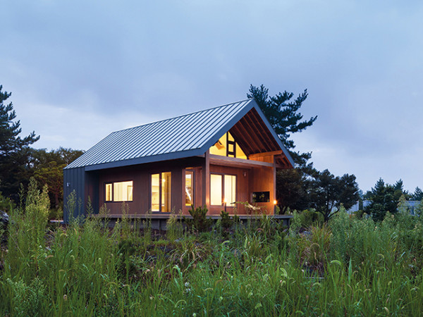 바쁜 일상 속 쉼표 같은 하루를 위해 방과 부엌, 욕실 한 칸씩이면 충분했다. 간소하지만 사방으로 열린 이 작은 나무집은 저 멀리 보이는 풍경까지 모두 끌어안는다. 취재 조고은 사진 박영채 ▲ 스치는 바람 소리만이 적막함을 덜어줄 것 같은 이곳. 해가 저물자 단아한 선의 박공지붕 집이 환하게 불을 밝힌다 . 쉴 틈 없이 돌아가는 일상이 당연해져버린 오늘, 사람들은 저마다 가슴 한구석에 휴식과 사색의 섬을 하나씩 품고 산다. 자신을 옭아매는 도시의 흔적들을 모두 벗어던지고, 최소한의 생활 속에서 생의 의미를 발견해가는 삶. 건축주 부부에게 제주는 이를 실현할 수 있는 곳이었다. 두 사람은 일주일에 단 이틀, 주말에라도 이곳에서 혹사당했던 몸과 마음을 한없이 풀어놓을 수 있기를 꿈꿨다. 집은 아주 작아도 상관없었다. 방 한 칸에 욕실 하나, 거실의 역할을 겸하는 작은 부엌 하나, 그리고 더 욕심을 내자면 다락방이면 충분했다. 건축가이자 시인인 함성호의 책 『아무것도 하지 않는 즐거움』에서는 삶의 최소주의에 대해 말하며 조선시대 사대부들의 ‘삼간지제(三間之制)’를 예로 든다. ‘집은 세 칸을 넘지 말아야 한다’는 덕목이다. 그러면서도 창을 통해 들어오는 풍경에 대해서는 인색하지 않았다는 얘기도 전한다. 실내면적 15평, 처마로 나간 대청까지 합쳐야 18평 남짓한 크기의 이 나무집은 있는 그대로의 나 자신, 그리고 산과 들, 바람을 만나기 위해 지어졌다. 현대적으로 재해석된 삼간지제의 뜻이 간소한 모양새에 고스란히 녹아 있는 집이다. ▲고요한 제주 풍경 속 자리 잡은 집. 사진은 아직 물부엌의 벽체와 지붕이 생기기 전의 모습이다. 마을 끝자락에 있는 대지는 동북쪽으로 오름이 있고, 서남쪽으로 빌레(넓고 평평한 큰 돌인 너럭바위를 제주 방언으로 ‘빌레’라 한다)가 엎드려 있는 너른 땅이다. 박공지붕의 선이 돋보이는 집은 빌레를 따라 살짝 경사진 땅의 형세를 거슬러 누마루를 올려 앉혀 지었다. 높다란 누마루에 올라 눈앞에 펼쳐지는 주변 경치는 잘생긴 소나무가 담긴 한 폭의 수묵화를 연상케 한다.HOUSE PLAN 대지위치 제주특별자치도 제주시 조천읍대지면적 456㎡(137.94평)건물규모 지상 1층, 다락건축면적 60.31㎡(18.24평)연면적 60.31㎡(18.24평)건폐율 13.23%용적률 13.23%최고높이 6.4m공법 기초 - 철근콘크리트 매트기초 / 지상 - 경골목구조 + 중목구조 혼합구조재 벽 - 외벽 2×6 구조목 + 내벽 S.P.F 구조목 / 지붕 - 2×12 구조목지붕마감재 컬러강판단열재 수성연질폼(천장 150㎜, 벽체 90㎜ 발포)외벽마감재 무절 제주산 적삼목 사이딩, 컬러강판, 회색 고벽돌창호재 알파칸창호 70㎜ PVC 시스템창호(창호등급 1등급)설계저작권자 ㈜하우스스타일 김주원리빙큐브 매니저 ㈜하우스스타일 김주원설계팀 ㈜하우스스타일 최범순, 김보경 시공 서울목재 064-784-8566▲ PLAN 1/2층 산·들·바람집은 현관으로 들어서기 전, 복층유리로 벽과 지붕을 구성한 옥외공간을 먼저 만날 수 있다. 벽난로와 개수대, 바깥 화장실을 둔 마당 공간인데 제주에서는 이런 다목적 옥외공간을 ‘물부엌’이라 부른다. 부엌 혹은 다용도실과 비슷하나 바닥에 물을 마음대로 뿌릴 수 있다는 데서 유래한 제주도 지역의 용어다. 건축적으로는 제주도의 세찬 바람을 막아주는 장치가 되어주고, 날씨, 계절과 관계없이 바깥 생활을 마음껏 즐길 수 있어 더 좋은 공간이다. 사다리를 오르면 원두막 같은 바깥 다락과도 연결된다. ▲ 제주도 다목적 공간, 물부엌을 현대적으로 재현했다.▲ 다락방에서는 창을 통해 제주의 오름이 한아름 담긴다.▲ 작은 툇마루가 있는, 이 집의 유일한 방에서 바라 본 부엌안으로 들어서면 이 집의 중심이 되는 부엌과 식당 공간이 먼저 나타난다. 유일한 방인 침실은 주방보다 30㎝ 정도 단을 높여 마루를 깔고 그 위에 앉혔다. 두 벽면에 한지 문을 달아 밖으로 낸 창까지 합치면 총 세 면이 열리고 닫히는 방이다. 침실 밖의 마루는 걸터앉을 수 있는 툇마루가 되어주는 한편, 회랑으로서 얇은 한지 문으로 구획된 방의 프라이버시를 확보하는 중간 영역이 된다. 또, 주방과 침실 사이의 계단을 오르면 세모난 전면 창으로 오름의 풍경을 담아내는 다락방이 자리한다. ......<더 많은 사진과 자료는 월간지를 통해 보실 수 있습니다>