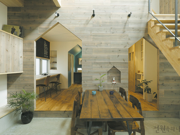 세상 어디에도 사연 없는 집은 없다. 유달리 따스한 이야기가 있는 정윤·윤아네 집에서 인생의 고단함과 피로를 씻어주는 쉘터로서의 집, 그 본질을 발견했다. 취재 정사은 사진 변종석 햇살이 유난히 따스한 어느 날, 그 볕보다 더 포근한 가족의 집짓기 이야기를 들으러 광주광역시로 향했다. 살아온 삶을 오롯이 반영하고 살아갈 삶을 준비하는 반석 같은 집. 젊은 부부와 두 아이가 사는 정윤·윤아네 집이다. 예전 이 자리에 있던 낡은 벽돌집은 어둡고 환기가 어려워 곰팡이가 슬기 일쑤였다. 네 살 난 정윤이는 아토피에 걸렸고, 이제 막 태어난 윤아의 건강도 염려되는 상황이었다. 겨울에는 방 하나만 보일러를 돌려도 난방비가 40만원을 넘기 일쑤고 여름 냉방비도 30만원이 훌쩍 넘었다. 신혼부터 둘째 아이 출생까지 그곳에서 보내고 나니 ‘평생 살 집을 짓자’는 쪽으로 부부의 의견이 모아졌다. 부부가 가진 돈은 2억원 남짓. 꼭 큰 면적을 원하는 것은 아니었지만, 모서리에 면한 땅에 남향의 볕이 잘 드는 대지 조건을 최대한 살리고 싶었다. 집은 가족의 꿈과 성향, 라이프스타일을 반영하는 것이 중요한 과제였다. 남편은 유지보수가 크게 필요치 않은 집을, 아내는 따뜻하고 볕이 잘 들며 간결한 동선의 집을 원했다. 두 아이가 마음껏 뛰어놀고 사색할 수 있는 집이여야 함은 물론이었다. 남편의 꿈인 번듯한 가게가 1층에 위치하고, 아내가 아이들을 모아 공부방을 열 수 있는 공간까지 확보된다면 금상첨화였다. 헌데 집을 짓는 과정은 시작부터 난관에 봉착했다. 한 철근콘크리트 전문 시공사와 계약하기 전날, 아내가 갑자기 반대하고 나선 것이다. 그녀는 판에 박힌 상가주택 대신 따뜻한 분위기가 풍기는 목조주택을 짓고 싶다고 남편을 설득했고, 부부는 다시 한 번 의견을 모아 목조회사를 찾아 다녔다. ▲ 그늘이 들지 않는 코너 땅에 지어진 남향 집 HOUSE PLAN 대지위치: 광주광역시 남구 대지면적: 142㎡(42.96평) 건물규모: 지상 3층 건축면적: 70.57㎡(21.35평) 연면적: 211.71㎡(64.04평) 건폐율: 49.7% 용적률: 149.09% 주차대수: 2대 최고높이: 11.4m 공법: 기초 - 철근콘크리트 매트기초, 지상 - 1, 2층 – 철골조 2층 - 벽체 목조 / 3층, 다락 – 경량목구조 지붕재: 이중 그림자싱글 단열재: 내단열 – 그라스울, 외단열 - 50T EPS패널 외벽마감재: 스타코플렉스 창호재: 미국식 시스템창호 / 천창 – 벨룩스 설계: 건축사사무소 광야 062-361-9745 시공: 꿈꾸는목수 1599-1723 www.woodenhouse.kr◀ 주택 전경 ▶ 거실에서 단란한 시간을 보낼 수 있다.◀ 북측 출입구로 들어서면 곧바로 계단이 나온다. ▶ 3층까지 올라가는 계단실의 난간부를 나무책장으로 짜넣었다. 이 집에 있는 책은 5만권에 달한다. ◀ 거실 한 켠에 위치한 주방과 식당에서는 2층 전체가 한눈에 들어와 아이들을 살피기 좋다. 사실, 부부에게 이 집은 특별한 의미가 있다. 초등학교 동창이었던 두 사람은 서로의 상황과 속사정을 너무나 잘 알기에 마음 속 이야기를 털어놓으며 연인이 될 수 있었다. 친구처럼, 또 연인처럼 서로를 보듬을 줄 아는 두 사람이 만나 아이들을 낳아 키우며, 자녀들에게는 자신들이 겪은 어려움을 물려주고 싶지 않다는 생각이 강하게 들었고, 이것이 집을 짓기로 결심한 가장 큰 이유가 되었다. 그때, ‘꿈꾸는 목수’ 소태웅 대표를 만났다. 건축 예산과 원하는 집의 모습, 그리고 아이들을 행복하게 키우기 위해 집을 지으려는 부부의 속사정을 경청한 소 대표는 이 모든 내용을 기억하고는 설계와 시공에 꼼꼼히 반영했다. 오히려 건축주에게 “이 집에서 어떤 꿈을 이루고 싶나요?”라고 반문하며 이들이 생각지도 못했던 공간까지 구현해냈다. 그렇기에 이 집에 이유 없는 공간과 디자인은 없다. INTERIOR SOURCES 바닥재: 2층 - 한솔참마루 락(그레이오크) / 3층 - 한솔참마루 락(에코오크) 욕실 및 주방 타일: 대보 바이오 타일 수전 등 욕실기기: 계림 욕실기구 주방 가구: 에넥스 조명: 순천광장조명 계단재: 라디에이타파인 집성판재 TFJ 현관문: 부성금속 단열도어 방문: 영림도어 붙박이장: 에넥스 데크재: 레드파인 방부데크제 건물을 지을 수 있는 건축면적은 70㎡(약 21평)가량. 가족이 두 개 층을 사용하고 당분간 1층을 상가로 임대한다면 주택건축자금을 일부 대출받더라도 이자 걱정은 없었다. 하지만 목구조로 층수를 높일 때 가장 큰 문제는 구조의 안전성과 층간소음이었다. 이때, 건물 구조를 철골조와 목조의 하이브리드(Hybrid)로 제안한 것은 소 대표의 아이디어였다. 건물의 뼈대는 H빔 철골로 세우고 그 사이 벽체를 목구조로 채워넣는다면 이 두 가지 문제에서 벗어날 수 있다는 판단이었다. 또, 철골구조의 장점으로 장스팬(Long-span)을 실현할 수 있기 때문에 거실과 어린이공부방으로도 사용할 2층에 기둥 없는 너른 공간을 만들 수 있게 된 것이다. 프라이버시 문제도 2층은 거실과 주방이 있는 공용 공간, 3층은 부부와 아이들 방, 그리고 작은 가족실과 다락까지 갖춘 가족만의 아지트로 구분해 해결했다. 두 공간을 분리하기 위해 건물을 수직으로 관통하는 계단실도 분리 시공해 미닫이문을 설치했다. 시공팀은 철골조와 목조의 