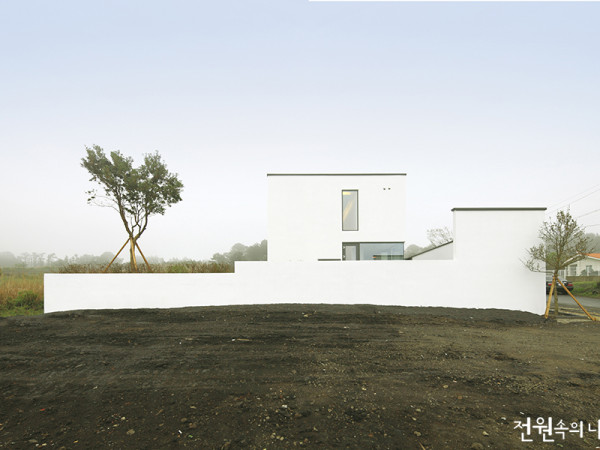 자연과 어우러진 수묵화처럼 보고 있으면 가만히 마음이 정화되는 집. 흰 바탕에 검은 선, 수풀을 여백 삼아 지어진 집은 제주 유수암의 경치와 어울려 짙은 감동을 준다. 취재 이세정 사진 변종석 ▲ 주택의 우측면에서 바라 본 외관 ▲높은 하얀색 담 안으로 들어서면 크지 않은 마당과 낮은 데크를 가진 단순한 집을 만난다. 한라산 능선에 위치한 유수암은 제주에서도 시골로 치는 인적 드문 곳이다. 해발이 높고 주변은 온통 풀숲 천지였던 이곳에, 최근 한두 채씩 집들이 지어지며 마을이 형성되고 있다. 간간히 들리는 망치 소리에 사람들의 목소리가 섞이면서, 초록의 생기도 더욱 짙어져 간다. 온통 자연뿐이던 이곳이 마을로 바뀐 건 새하얀 집이 들어서고부터다. 삼면이 하얀 벽으로 둘러싸여 호기심을 자극하는 이 집은 디자인 잇츠의 김동표, 유경미 부부 디자이너의 첫 제주 작업물이다. 신라호텔, 하얏트호텔 등 최고급 인테리어 디자인을 맡아 온 이들은 지난해 서울을 등지고 고향 제주로 내려 왔다. 그리고 유수암에서 집을 지으며 이제 막, 두번째 여름을 기다린다. “마을 전체가 숲과 억새에 둘러싸여, 여기 있으면 마음이 정화되는 것 같아요. 최대한 자연에 방해되지 않는 집을 짓고자 했고, 창과 흰 벽만을 이용해 주변 풍광 속에 건축이 스며드는 디자인을 구상했지요.” 집을 에워싼 흰 벽에는 시간과 날씨, 계절에 따라 매일 다른 그림자가 새겨진다. 고정되지 않은 이미지는 어쩌면 정처 없기도 하지만, 자연이 그리는 수묵화처럼 눈에 거슬리지 않는다. 단단한 벽은 제주의 유별난 바람으로부터 집을 보호하는 장치이기도 하다. 예부터 제주에는 초가지붕 위에 짚으로 띠를 만들어 동여 맬 만큼 바람과 비에 관한 채비가 엄격했다. 벽을 세워 거센 비바람을 막고 프라이버시까지 보호해, 마당을 한결 호젓하게 누릴 수 있다. HOUSE PLAN대지위치 제주특별자치도 제주시 대지면적 495㎡(149.74평) 건물규모 1층 - 97.39㎡(29.46평),2층 - 60.75㎡(18.37평) 건축면적 97.50㎡(29.49평) 연면적 158.14㎡(47.83평) 건폐율 19.70% 용적률 31.95% 주차대수 1대 최고높이 6.7m 공법 기초 - 줄기초 위 매트기초,지상 - 철근콘크리트조 구조재 벽 - 철근콘크리트조,지붕 - 철근콘크리트조, 평슬라브 지붕재 징크, 시멘트몰탈 단열재 120㎜ 비드법단열재 외벽마감재 슈퍼화인, 컬러강판 창호재 이건창호내벽마감재 벤자민 무어 친환경도장 바닥재 THK 15㎜ 원목마루 계획 및 실시설계 디자인 잇츠 유경미, 김동표 인허가 대행 건축사사무소 정우 시공 디자인 잇츠 070-4114-2152 http://blog.naver.com/design_its▲ 주택의 주출입구. 시간과 계절, 날씨에 따라 한 그루의 나무가 빚어내는 다양한 그림자들이 벽에 그려진다.▲제주는 암반이 많아 매트 기초를 주로 하지만, 이 집은 줄기초 위에 잡석을 다지고 추가 매트 기초를 하는 방식으로 토대를 잡았다. ▲ 광활한 구릉을 향해 열려 있는 거실창. 홍동희 작가의 조명 작품을 중심으로 자연과 조화를 이룬 인테리어가 백미다. ▲ 욕실 앞쪽으로 나무를 심어 자연과 조우하는 시간을 누릴 수 있게 했다.◀ 수공간은 집의 진입부와 주방을 감싸 안는 멋진 배경이 되어 준다. / ▶ 널찍한 아일랜드 테이블이 있는 주방 앞으로 큰 창을 배치했다.마당은 처음부터 세컨하우스를 염두에 두고 기획했다. 관리가 어렵지 않게 잔디와 수목은 최소한으로 식재하고 나머지는 미니멀한 건물에 어울리는 판재와 낮은 목재 데크로 구성했다. 주방 앞쪽 마련한 수공간은 계절마다 그 쓰임이 다르다. 여름에는 아이들을 위한 수영장이 되고, 다른 계절은 물의 수위를 낮춰 수공간으로 활용한다. 유아풀을 위한 데크까지 따로 마련해 둔 세심함이 눈에 띈다. 내부 인테리어는 안과 밖이 하나되는 공간을 주 콘셉트로 잡았다. 창에 담기는 외부 풍경이 실내 연출의 한 축을 담당하도록 거실 한 면을 전면창으로 제작했다. 여기에 주방과 욕실, 메인 침실까지 넉넉한 창을 통해 내외부 경계가 허물어진다. 물론 이처럼 자유로운 디자인은 외부 담장으로 얻은 독립성 덕분이다. 1층은 거실과 주방의 열린 공간, 메인 침실과 욕실로 구성하고 2층은 침실과 욕실의 사적 공간으로 구분했다. 2층 복도 한 가운데 위치한 중정은 외기를 면하는 동시에 여러 각도에서 보이는 풍경을 다채롭게 만들고 있다. “자연에서 접하는 물, 바람, 공기, 나무, 돌을 가장 근접하게 느끼고 경험할 수 있는 집을 만들고자 했어요. 세련된 동선 속에서도 풋풋함이 묻어날 수 있는 형태들을 고려했습니다.” 부부가 밝힌 인테리어 철학은 자칫 스쳐 지날 수 있는 작은 요소들에서도 찾을 수 있다. 도어와 벽난로 등 무게 있는 제품부터 콘센트나 손잡이, 경첩 등 디테일한 부분까지 예민하게 작업했다. 대문은 외부에서 잠금 해제 후 도어 전체를 밀며 진입하고, 좌측의 고정 도어는 로비폰이나 우편함 역할을 하며 필요할 때는 전면 개방도 가능하다. 현관문 역시 일체의 군더더기 없이 원형 아이콘 하나로 개폐할 수 있어 사용자에게 색다른 경험을 선사한다. ◀ 욕실창 밖으로 보이는 흰 벽은 프라이버시를 지키는 방패막이다.▶ 1층에 자리한 메인 침실의 전경. PLAN