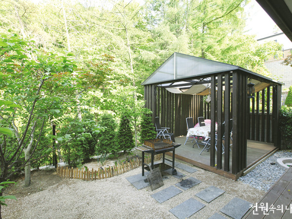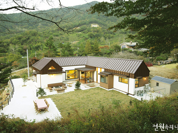 마당을 한가운데 두고 ‘ㄷ’자 형태로 둘러싼 건물, 마치 한옥의 배치를 닮은 듯한 집이 광양 산기슭에 들어섰다. 땅이 가진 단점을 건물의 배치와 설계로 극복한 이 시대 새로운 유형의 디자인 주택이다. 취재 편집부 사진 변종석 ▲재미난 요소들이 많은 마당. 설계에서부터 야외 화덕을 계획했다. ▲주방과 가까운 곳에 위치한 파고라와 미니 수영장 능선을 따라 집이 드문드문 자리해 호젓한 분위기를 풍기는 광양의 어느 산자락. 이곳에 포근한 중정을 가진 디자인 주택 한 채를 찾았다. 구석구석 신경 쓴 설계와 꼼꼼한 시공, 그리고 원하는 바가 확실했던 건축주가 함께 만들어 낸 결과물이다. 건축주는 집짓기 예산에 설계비와 감리비까지 포함해 두었을 정도로 설계의 중요성을 알고 있었다. 인생에서 제일 즐거운 집짓기가 되기 위해 그 과정까지 즐기고 싶었던 건축주는 고민 끝에 홈스타일토토의 임병훈 건축가를 찾았다. “어른도 잘 놀 수 있는 집을 지어달라”는 말과 “광양에서 제일 예쁜 집을 만들어달라” 는 전언을 붙여. HOUSE PLAN 대지위치 전남 광양시 대지면적 708.72㎡(214.39평) 건축면적 130.58㎡(39.5평) 1층 - 130.58㎡(39.5평) 2층 - 23.66㎡(7.16평) 연면적 154.24㎡(46.66평) 건폐율 18.42% 용적률 21.76% 구조 경량목구조 외장재 아연도 컬러강판, 테라코 수퍼화인 플렉스 내장재 석고보드 위 지정색 페인트 공법 기초 - 매트기초 지상 - 경량목구조 단열 연질수성폼 + 30T 비드법 1종2호단열재 창호재 삼익 스윙(독일식 시스템창호) 주차대수 자주식 1대 최고높이 5.6m 디자인 홈스타일토토 임병훈, 정신애 www.homestyletoto.com 시공 JCON www.jconhousing.com 주택은 마당을 중심으로 전개된다. 실내 어디서든 마당이 한눈에 들어오며, 물리적으로도 심리적으로도 자유롭게 접근할 수 있다. “마당 때문에 집을 지었다”고 단언할 정도로 건축주는 설계 단계부터 이곳에 재미난 요소들을 심었다. 화덕이 있는 파티 공간을 따로 만들고 중정 내부에 파고라와 미니 수영장을 설치해 마당생활을 더욱 풍요롭게 했다. 여럿이 바비큐 파티를 열어도 외부에서는 집 안에서 무슨 일이 일어나는지 알 도리가 없을 정도로 프라이빗한 공간이다. ▲ 소파 뒤로는 반투명 미닫이 도어를 설치해 간이 서재를 만들었다. ▲ 주방 배치를 11자 형으로 하여 횡으로는 응접실에서 보조주방까지 트인 동선으로 개방감을 줬으며, 종으로는 뒷산과 마당 안쪽을 볼 수 있게 오픈했다. ◀ 주방 안쪽에 숨어 있지만 마당으로 시선이 열린 응접실 ▶ 복도 한쪽 코지공간에 마련한 런닝 머신 ◀ 푸른 타일로 마감한 두 자녀의 화장실 ▶폭이 좁은 거실이라 큰 소파 대신 분위기에 맞는 1인용 체어를 배치했으며, 창가를 포켓 벤치로 만들어 독서공간으로 연출했다.INTERIOR SOURCES 실내페인트 KCC 숲으로 마루재 동화자연마루 도어래핑 LG 인테리어필름 타일 이누스 & 루코세라믹 조명 메가룩스 & 룩스몰 사실 이 곳이 단점없는 완벽한 땅은 아니었다. 시골에서는 다소 작다고 느껴질 만한 200평 대지에 남쪽에는 언덕이, 북쪽으로는 조망이 펼쳐진 불리한 조건이었다. 북쪽으로 열자니 조망은 좋지만 단열을 걱정해야 하는 상황이었고, 남쪽으로 펼쳐놓기에는 언덕이 있어 충분한 일사량을 받을 수 없을 뿐만 아니라 조망을 포기해야 하는 상황이었다. 여러 차례의 수정을 거쳐 완성된 디자인은 집과 마당의 유기적인 관계에 최대한 초점이 맞춰졌다. 마당은 집 안으로 적극 들어와 중정이 되고, 40평의 연면적은 땅에 자연스럽게 펼쳐졌다. 설계를 맡은 임병훈 소장은 “일반적인 방식처럼 대지 한편에 최대한 건물을 붙여 지었다면 오히려 마당은 덩그러니 빈터로 남았을 것”이라며 “땅이 좁을수록 최대한 그 땅을 거닐수 있게 하는 게, 집 전체를 넓게 쓰고 넓게 느끼게 하는 방법”이라고 설명했다. 타인의 시선에 구애받지 않고 마당을 편안하게 누리고자 한 건축주의 처음 생각과도 잘 맞아 떨어지는 배치였다. 산 방향으로 집의 정면을 열고 실내에서 원경을 볼 수 있게 조망도 적극 확보했다. ▲ 높은 층고의 안방. 자그마한 포켓벤치로 멋진 조망을 감상할 수 있게 했다. ▶ 안방의 다락은 서재로 꾸몄고, 그 하단은 욕실과 드레스룸 등의 유틸리티 공간을 배치했다. 실내는 거실과 주방을 중심에 두고 양 날개에 안방과 자녀방을 만들었다. 각각의 공간은 다락을 두어 아지트로 삼았다. 각 실에 필요한 코지 공간과 공부방, 서재 등은 그 안에서 오밀조밀하게 배치해 해결했다. 창틀 밑에는 포켓 벤치를 설치해 햇살을 받으며 독서할 수 있는 보너스 공간도 있다. ‘ㄷ’자 형태이기에 실내 폭이 다소 좁은 단점은 가구와 수납, 동선과 각 실 면적의 유기적인 조합으로 해결하려 노력했다. 또, 공용공간은 어디 하나 닫혀있는 곳 없이 연결되어 있되, 적절한 파티션과 컬러로 구분한 센스도 보인다. 가구 또한 웅장하거나 부피가 커보이는 디자인 대신 작지만 포근함을 주는 패브릭 위주로 배치했으며, 원색 포인트컬러와 함께 매치해 산뜻함을 더했다. 임 소장은 “형태는 폐쇄적이지만 실제 사용하는 사람들에게는 시선과 움직임이 자유로운 아늑한 공간으로 만드는 데 