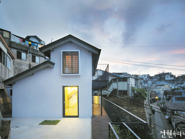집으로 숲을 이룬 마을 중턱, 목멱산과 인왕산이 바라다보여 이름 지어진 목인헌이 있다. 과거와 현재가 소통하는 그곳에는, 오늘도 다양한 풍경이 일상이 되어 공존한다. 취재 김연정 사진 노경 ▲ 리노베이션 전 목인헌의 내·외부 모습목멱과 인왕이 보이는 내사산의 응봉자락, 마치 집으로 숲을 이루고 있는 것 같은 풍경의 중간허리쯤에 목인헌이 위치한다. 성곽 아래 동네에 숨은 듯, 목인헌은 그곳의 일상 그리고 풍경처럼 스며들어 있다. 이 높이에서 바라보는 서울의 경관은 좌측 목멱의 길게 누운 듯한 모습과 우측의 인왕의 당당한 기세를 길게 펼쳐볼 수 있는, 매우 드문 체험을 제공한다. 비슷한 규모의 집들이 불법으로 증축한 혹들을 달고 층층이 겹치고 쌓이면서 시간과 함께 만들어 낸 마을의 모습은 이제 서울에서도 보기 드문 풍경이다. ▲ 꽃 그림 계단 골목과 새 옷을 입은 목인헌이 조화를 이룬다. HOUSE PLAN 대지위치 : 서울시 종로구 이화동 지역지구 : 2종 일반주거지역, 정비(재개발)구역, 문화재(서울 성곽)보존영향검토구역 대지면적 : 151.8㎡(45.91평) 건물규모 : 지상 2층 건축면적 : 51.3㎡(15.51평) 연면적 : 75.6㎡(22.86평) 건폐율 : 33.8% 용적률 : 49.8% 구조재 : 조적조, 목조 외부마감 : 드라이비트 외단열, 아스팔트싱글 지붕 시공 : 이안건축 설계 : 이충기 02-3461-3841 cklee@uos.ac.kr 총 공사비 : 6,000만원 ▲ 경사지의 다양한 레벨과 시간, 사람들이 만들어낸 일상적 풍경 1958년, 일제강점에서 해방된 후 낙산 성곽과 이화장 사이의 서쪽 사면에 수십 채의 현대식 타운하우스가 들어섰다. 지역의 역사를 일상으로 담고 있는 서울 성곽 아랫동네는 뜨거운 서향 햇빛이 수평으로 그림자를 드리우는 고도에 30~45도의 경사지. 사람이 살기조차 어려워 보였으나, 주택영단(주택공사의 전신)의 주도하에 우리 기술로 지은 신식 2층 집이 새로운 역사와 일상을 시작했다. 작은 집들은 가파른 산지에 높은 축대와 골목을 형성하면서 층층으로 풍경을 만들며 배치되었다. 그렇게 시작한 낙산 성곽아래 이화동 마을은 수도와 연탄 보급이 어려운 산동네의 특성을 보이며 경제적으로 어려운 사람들이 모이는 동네로 바뀌어 갔다. 면적과 높이를 임의로 확장하고 증축하면서 독특한 형태의 마을로 진화하였다. 법과 제도가 제대로 정비되지 않았던 당시, 필요에 의해 너도나도 처마 밑을 확장하고 2층 외부를 방으로 만들면서 골목을 제외하고는 빈 땅이 없을 정도로 거의 모든 집들이 확장되고 팽창되었던 것이다. 지금의 이화동은 벽화마을로 더 많이 알려진 동네다. 이곳의 시공간은 지금도 1960년 정도쯤에 멈추어 있다. 2006년, 낙후된 마을 분위기를 바꾸려 시작한 공공디자인사업으로 낡고 퇴색한 마을의 골목과 담에 진한 화장이 입혀졌다. 예쁘라고 그린 형형색색의 그림들로 무엇을 감출 수 있을까? 이곳에는 그림으로 덮을 수 없는 사람들의 일상이 있었고, 산동네가 만든 독특한 풍경이 있었다. 골목과 사람, 마을이 원래 가지고 있었던 생명력, 그것이 마을을 유지하는 힘이었다. 그로부터 수년이 지나 시간의 마술이 다시 한 번 작동하면서 골목과 벽화도 어느덧 일상처럼 마을의 한 풍경으로 자리 잡았다(요즈음은 이곳에 외국관광객까지 줄을 서서 사진을 찍으며 그들의 추억을 남긴다). 뉴타운의 광풍이 불어 재개발 조합까지 결성된 이 마을에, 2012년부터 뜻있는 사람들이 마을가꾸기에 나섰다. 주민과 함께 천천히 발전되어가는 마을, 필요에 따라 조금씩 변화하는 마을, 현재의 골목 일상과 마을풍경이 유지되는 마을을 꿈꾸는 일이 시작되었다. ▲ 60여 년간 견뎌온 어진 나무의 흔적. 그리고 철거 전 나온 철재 못과 애자. ▲ 1층 출입구 홀 전경. 지붕과 콘크리트 벽체 부분은 기존 재료를 노출했다. ▲ 2층에 위치한 방 ▲ 창을 통해 바라본 인왕산의 경치 ◀ 2층으로 오르는 단정한 계단실 ▶ 곳곳에서 옛것과 새것의 조화가 엿보인다. ▲ 발코니에서 바라본 난간 너머 도시의 파노라마 건축가의 디자인이 매순간 무엇인가를 선택하는 것으로 결정되는 것이라면, 목인헌의 리노베이션은 현장에서 이루어지는 설계의 비중이 크고, 기존 공간을 들어내고 덧붙이는 선택과 결정이 많이 필요했던 과정이었다. 먼저 60여 년 동안 임의로 진행된 증축공간을 들어내고 1958년에 지었던 원형을 확인하고자 했다. 새것과 옛것의 표현, 즉 시간 표현을 위한 마감 재료와 색, 새로운 기능의 추가, 도시를 바라보는 경관, 마을을 구성하는 풍경인자로서의 자세와 대응에 대해 고민해야 했다. 그것은 일상으로서의 풍경과 물리적 실체로서의 건축에 대한 표현을 어느 수준으로 할 것이며, 건축가로서 어느 정도의 깊이로 개입할 것인가에 대한 질문이기도 하였다. 마을의 다른 집과 마찬가지로 마당이나 외부공간을 모두 증축하여 방으로 사용하고 있었던 집 목인헌은 1층 30㎡, 2층 15㎡의 2층 구조에 단열 없이 6인치 블록 한 장으로 벽을 쌓고 ‘⊥’자형 지붕틀에 박공지붕이 올려져 있었다. 이화동 마을의 집들은 증축으로 외형이 바뀌는 과정에서도 이 집은 초기에 지은 2층 주택의 원형을 그대로 유지하고 있었다. 목인헌 내부는 1958