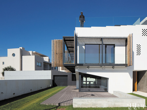 하얀 외벽에 나무 옷을 입혔다. 필요에 따라 시시각각 변화하는 모습은 지나가는 이의 발걸음을 멈추게 한다. 하나하나 왜 필요한지 마땅한 이유를 고민하며 공간을 그려낸 집을 찾았다. 취재 김연정 사진 Jose Campos ▲ 너른 데크와 심플한 화이트 외벽이 조화를 이룬 주택 모습 ▲ 접이식 나무 셔터는 이 집의 정체성을 잘 드러내는 장치다. ▲ 블랙 컬러로 마감한 펜트하우스가 멀리서도 눈길을 끈다. ◀ ‘ㄱ’자 모양으로 2층 발코니를 둘러싼 나무 셔터 ▶ 차고로 사용되는 부속건물과 연결된 북서측 전경 HOUSE PLAN 대지위치 Miramar, Portugal 총면적 275㎡(83.18평) 기술 Hugo Pinheiro 기술협력 Luis Maio 시공 JOALJO CONSTRUCOES, LDA 감리 Antonio Castro, Nuno Pinheiro, Antonio Teixeira 설계 e|348 Arquitectura(Nuno Pinheiro, Antonio Teixeira) http://e348.blogspot.com ▲ 큰 창과 나무 셔터 사이로 새어나오는 불빛이 아늑하게 느껴진다. ▲ 슬라이딩 도어를 설치하여 내·외부를 자연스럽게 연결하였다. 포르투갈 빌라노바드가이아(Vila Nova de Gaia)에 위치한 한적한 동네, 접이식 나무 셔터가 눈길을 끄는 주택이 있다. 2층 규모에 펜트하우스가 더해진 이곳은 젊은 부부와 어린 쌍둥이 자녀를 위해 설계된 집이다. 비록 겉보기에는 단단한 하나의 볼륨 덩어리로 보이는 집이지만, 집 안 곳곳을 비추는 자연광이 수평·수직으로 다양한 공간 구성을 만들며 내·외부를 유기적으로 연결한다. 건물을 이루고 있는 두 개의 볼륨, 즉 주거공간과 차고는 서로 인접하여 밀접한 관계를 유지하면서도 외관상으로는 분명한 차이를 보여준다. ◀ 입구에서 마주치게 되는 2층으로 올라가는 계단실 ▶ 높은 천장고는 공간을 더욱 넓어보이게 한다. ▲ 블랙 & 화이트로 깔끔하게 꾸민 주방 ▲ 2층은 3개의 침실만을 두어 가족만의 영역으로 꾸몄다. ▲ 펜트하우스 내부. 약간의 층고를 주어 두 공간으로 분리했다. 1층에는 공용공간과 휴게공간이 있고, 북서쪽에는 차고로 사용되는 부속건물이 있다. 북측에서 남측으로 열린 구조를 택하여 층 전체가 앞뒤로 개방된 모습이다. 세 개의 침실로 이루어진 2층은 발코니를 통해 외부로 연결되어 있다. 특히, 발코니에 설치된 접이식 나무 셔터(강구조에 의해 지탱)는 햇빛과 프라이버시를 조절하는 두 가지 역할을 한다. 마지막으로 펜트하우스에는 서재와 사무공간이 배치되었다. 서로 층이 져 있어 계단으로 이어진 두 공간은, 녹화된 옥상의 파노라마식 산책로를 통해서도 연결된다. 지붕에 태양 전지판을 두어 지속적인 온수 공급을 가능케 하였고, 발코니를 둘러싼 나무 셔터는 변화하는 계절의 특성에 적절히 대응하여 에너지 효율을 높였다. 건축집단 e|348 arquitectura포르투갈 포보아드바르징(Povoa de Varzim)에 기반을 두고 있는 건축사무소로, 건축과 관련된 다양한 분야의 작업을 진행하고 있다. 창의적이고 기술적인 프로젝트를 위해 디자인과 도시계획 등 다방면으로 노력 중이다. ※ 월간 <전원속의 내집> www.uujj.co.kr 본 콘텐츠의 저작권은 (주)주택문화사에 있으며, 이를 무단 이용하는 경우 저작권법 등에 따라 법적책임을 질 수 있습니다.