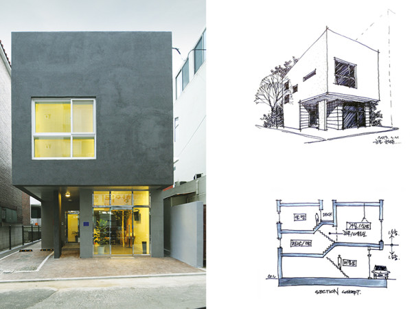 무슨 일이든 조건이 까다로울수록 고민의 흔적이 결과물 곳곳에 묻어난다. 이 집의 까다로운 조건은 작은 땅과 거주-상업용도의 혼재였다. 건축주와 건축가가 문제를 풀어내는 방식을 통해 도심 속 협소주택의 새로운 해답을 발견해 보자. 취재 정사은 사진 변종석 군포시 금정동, 골목 안 작은 대지에서 오랫동안 미용실을 운영하던 건축주는 기존에 있던 상가주택을 헐고 아들과 부부, 세 가족이 살 작은 집을 짓기로 했다. 27평 남짓한 작은 대지에 건축주가 운영하는 미용실과 주택이 함께 어우러지는 집을 원한 건축주는 1년 남짓 일본 협소주택과 작은 집 관련 서적들을 보면서 원하는 집의 이미지를 그려왔다. 간결한 박스 형태의 외관에 단정한 분위기를 원한 건축주가 이를 실현 시켜줄 건축가 이병익 소장을 찾는 데는 꽤 많은 노력과 시간이 들었다. 건축가와의 첫 미팅에서 건축주가 먼저 꺼내든 것은 직접 그린 평면도였다. 오랜 기간 집에 대해 고민해온 건축주였기에 가용 건축면적과 높이제한 등의 법규에도 해박했다. 고민의 흔적이 잔뜩 묻어나는 이 모눈종이를 지도 삼아 까다로운 조건을 해결하기 위한 건축가와 건축주의 고군분투가 시작됐다. ▲ 검은색 스톤코트로 마감된 주택은 골목 안에서 그 존재감을 발한다. ▲ 창문에서 새어 나오는 노란빛이 실내의 따뜻한 온기를 가늠하게 한다. HOUSE PLAN대지위치 : 경기도 군포시대지면적 : 91.4㎡(27.65평) 건물규모 : 지상 3층 건축면적 : 54.15% 연면적 : 125㎡(37.81평)주택 : 79.73㎡(24.12평)미용실 : 45.27㎡(13.69평) 건폐율 : 59.25% 용적률 : 136.76% 주차대수 : 법정 1대 (실제 2대 가능) 최고높이 : 8.35m 공법 : 기초 - MAT기초 지상 - 철근콘크리트구조 구조재 : 벽 - 콘크리트 옹벽 지붕 - 콘크리트 슬라브 지붕재 : 평 슬라브(우레탄방수) 단열재 : 비드법보온판 지붕 160㎜, 벽체 85㎜ 외벽마감재 스톤코트(흑색) 창호재 18㎜ 복층유리 복창내벽마감재 : 벽지 바닥재 강마루 설계 : 건축사사무소 이루건축 이병익 010-5289-5734 http://blog.naver.com/eruarchi11시공 : 포하우스 구민회 02-572-5870 http://4house.co.kr총공사비 : 1억7천만원(설계비 제외) 남북으로 길쭉한 대지에서 사용할 수 있는 건축면적은 16평 정도. 계단실을 제외하면는 전용면적을 13~14평가량 확보할 수 있었다. 건축가는 1층 미용실, 2~3층 주택이라는 판에 박힌 구분보다는 스킵 플로어(Skip floor) 형식으로 층을 나눈다면, 좁은 면적임에도 개방감까지 더할 수 있겠다고 판단했다. 그러면 자연스럽게 1층 미용실의 천장고가 1.5층으로 높아져 영업장의 실내외 개방감이 확보되고, 위층 거실도 1.5층 높이 천장고를 갖게 되어 작은 면적임에도 좁지 않은 실내가 될 것이라는 판단이었다. 20년 지기 미용실 단골을 위한 전용 주차장을 추가로 만들어 달라는 건축주의 요청은 1층 일부를 필로티로 만드는 것으로 간단히 해결할 수 있었다. 이러한 묘수는 처음 14평 주거 면적에서 세 가족의 공간을 모두 만들려던 건축주의 초기 아이디어에 약 6평 정도를 추가로 확보해주었다. ▲ 1층은 건축주가 운영하는 미용실로, 넓지 않은 면적임에도 천장고를 높여 답답하지 않다. ▲ 3층 안방에서 내려다 본 현관부와 거실. 천장에 달린 환기팬은 겨울철에도 공기를 순환시키는 역할을 한다. ◀평면과 구조가 그대로 프레임이 된다. 현관문을 들어서면 좌측에는 아들 방이, 다섯 계단 오르면 거실과 주방이 펼쳐진다. / ▶ 세 식구가 식사하기에 충분한 크기의 아일랜드 식탁과 콤팩트한 주방 ▲ 3층 안방 안쪽에는 드레스룸과 욕실이 별도로 마련되어 있다. ◀ 화이트톤의 간결한 욕실 / ▶현관 가림막은 TV를 설치하는 벽이자 현관에서 거실로의 시선을 적절히 차단해주는 역할을 한다. INTERIOR SOURCES 벽지 : LG 광폭합지 페인트 : 삼화수성페인트 및 다채무늬도료 몰딩 : 영림몰딩 주방벽면 마감재 : 수입타일 200×600 욕실 : 타일 동서, 삼현타일, 바닥타일 200×200, 벽체타일 250×400 수전 등 욕실기기 : 계림, 대림도기, 대림수전 조명 : 남광조명 바닥재 : 상가 - 투명 에폭시, 주택 - 이건 강마루 현관문 : 컬라무늬 강판 방화문 방문 : 영림목문 계단재 : 주택 내부 - 미송집성목 디딤판 아트월 : 미송루버 집을 지으며 주변의 우려도 참 많았다. 이웃한 집들이 대부분 4~5층 다세대주택이기에 유독 낮고 작아 보이는 크기 때문이었다. 하지만 자신들에게 필요한 것은 부담스러울 정도로 큰 집보다는 생활을 편리하게 하고, 꼭 필요한 공간만 알차게 배치된 실용적인 주택임을 누구보다 잘 알고 있었기 때문에, 건축주는 주변의 기우에도 미소로 침묵하며 소신을 지켜나갈 수 있었다. 준비된 예산 범위 내에서 과다한 재료를 사용하지 않는 것이 이 집을 만드는 원칙이었다. 건축주 역시 잘 짜인 설계와 제대로 된 시공만 있다면 건축 자체가 인테리어가 되리라 판단했기에 별도의 치장은 애초부터 예산 밖이었다. 스킵 플로어를 적용하기 위한 공법으로는 당연히 철근콘크리트구조가 적합했고, 외장재 역시 깔끔한 스톤코트로 마감하기로 했다. 좋은 건축이란 ‘기본에 충실한 건물을 짓는 것’이라는 소신을 가진 설계, 시공, 건축주 삼총사가 만든 집은 감동을 주는 공