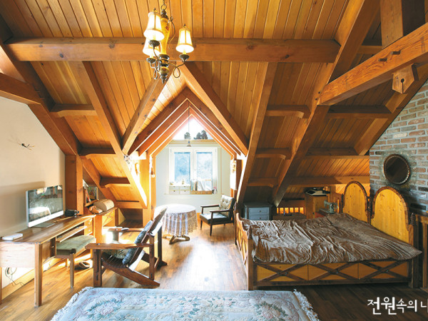 경기도 포천의 한 마을에 독일에서나 볼 법한 이국적인 집 한 채가 들어섰다. 분홍색 벽면과 나무 프레임이 예쁜 이 동화 같은 집은, 창옥 씨네 다섯 식구가 2년 6개월에 걸쳐 지은 패시브-팀버프레임 하우스다. 취재 조고은 | 사진 변종석 ▲ 다락의 부부 공간. 모든 가구는 창옥 씨 스튜디오에서 탄생했다. ▲ 이국적인 풍경을 자아내는 분홍집 목공스튜디오 ‘Kim&Kim Studio’를 운영하는 김창옥 씨는 서양화를 전공한 화가다. 영국에서 석사 과정을 마치고 약 10년 동안 교수 생활을 했던 그에게 목공은 가족과 떨어져 있던 외로운 마음을 달래준 취미생활이었다. 그러던 것이 어느덧 직업이 되어 ‘가구를 만드는 화가’가 되었고 2011년 여름, 땅을 보러 간다는 친구를 따라나섰다가 운명처럼 만난 이곳 경기도 포천에 집을 짓게 된다. “추운 지역이지만 햇볕이 잘 들고, 바람도 세지 않은 지형을 가진 곳이었어요. 보자마자 집 짓고 살기 딱 좋은 땅이라고 생각했죠.” 뜻이 맞는 지인들이 모여 1,500평 정도의 땅을 함께 샀고, 이중 그가 제일 먼저 집짓기에 나섰다. 집은 다른 사람의 힘을 빌리기보단 가족과 함께 직접 짓기로 했다. 그렇게 그와 목공스튜디오에서 같이 일하는 딸 눈이, 처조카 기웅이가 주축이 되고 아내 조경옥 씨, 아들 수로와 천둥이가 힘을 보태어 장장 2년 6개월의 좌충우돌 집짓기 여정이 시작되었다. ▲ 팀버프레임이 그대로 드러나 웅장하면서도 따뜻한 느낌의 주택 내부 창옥 씨는 약 20년 전, 독일계 프랑스 사람이 강연했던 한 국내 워크숍에서 팀버프레임에 관해 처음 접했다. 아무래도 예술, 창작과 관련한 직업이다 보니 목공이나 건축 관련 분야에 관심이 많았다. 국내에 통나무집 건축이 인기를 끌 때에는 통나무 건축 워크숍에 다녀왔고, 경복궁 복원 과정, 일반 목조주택 건축 과정에 참여했던 경험도 있다. “건축을 업으로 삼을 정도로 전문 교육을 받았던 건 아니에요. 언젠가 내 집을 짓기 위해 틈틈이 배워두었던 거지요.” 다양한 집짓기 공법을 경험해보니 저마다의 장단점이 있었지만, 그렇다고 모든 공법을 하나의 집에 쓸어 담을 수는 없었다. 가장 중심이 되는 공법을 선택해야 했는데, 그에게 가장 매력적으로 다가온 것이 바로 ‘팀버프레임’이다. 일부러 갖가지 장식을 하지 않아도 나무프레임 자체가 자연스러운 인테리어가 되는 점이 가장 마음에 들었다. 영국에서도 관련 교육 과정을 수강한 적이 있었는데, 이때 배웠던 것들을 확인해보고 싶은 마음도 컸다. 그런데 문제는 ‘단열’이었다. 짜맞춤 공법이 중심이 되는 팀버프레임이나 한옥은 기둥과 기둥을 끼워 벽체를 만들기 때문에 그 틈으로 찬 기운이 스며들 수밖에 없다. 이를 해결할 방법이 무엇일까 고심하던 그는 팀버프레임 구조에 패시브 하우스의 단열 공법을 더한 집을 지어보기로 했다. 아직 우리나라에서는 한 번도 행해진 적 없는 실험적인 집짓기였다. 가구를 만드는 일이나 집짓기나 모두 나무를 재료로 하는 일이지만, 생전 처음 하는 건축 과정이 쉬울 리는 없었다. 그런데 창옥 씨는 눈이와 기웅이를 데리고 아직 터도 잡혀 있지 않은 상태에서 치목을 하기 시작했다. 나무로 짓는 집은 잘 건조된 목재를 사용하는 것이 가장 중요한데, 우연치 않게 강원도 춘천의 한 건축 현장에 4년 동안 잘 건조된 목재 남은 것이 있어 얻어온 것이다. 치목, 골조 세우기, 기밀 및 단열 시공, 지붕 얹기 등의 집짓기의 주요 작업은 나무를 만지는 데 익숙한 목공 스튜디오 식구들이 맡고, 전기설비, 창호 설치 등은 전문기술자의 손에 맡겼다. 천장에 기밀 시공을 하거나 기와를 올릴 때는 암벽등반용 장비에 매달려 하루에 4~5시간씩 작업했다. “눈이는 그때의 후유증으로 얼마 전까지 허리 교정 치료를 받았어요. 한여름 땡볕에서 작업할 때는 저도 생전 처음 빈혈로 고생하기도 했죠.” 아내 경옥 씨는 작업으로 한창 지치는 시간이면 맛있는 새참을 내오거나 각종 행정 관리 업무를 도맡았다. 비싼 독일 패시브 하우스 자재를 사용하기도 했고 생각보다 공기가 많이 길어지는 바람에 지출 비용이 예산을 훨씬 초과했지만, 집이 끝까지 지어질 수 있었던 것은 묵묵히 응원하고 지원해준 아내 덕분이다. 아직 중학생인 두 아들도 자재를 옮기는 일이나 청소 등의 잡다한 일을 맡으며 집짓기에 참여했다. 그렇게 길고 길었던 초보 목수 가족의 고된 집짓기는 ‘동화 속 분홍집’으로 완성됐다. ▲ 다섯식구의 집짓기 여정 ▲ 아늑하고 편안한 딸 눈이의 공간 “실용적 성향이 강한 미국 사람들은 팀버프레임으로 집을 지을 때 골조를 세우고, 바깥을 냉장고처럼 스킨(Skin)으로 씌워 밀봉하는 방법으로 기밀성과 단열성을 강화합니다.” 미국의 팀버하우스는 기둥과 벽체 사이에 틈이 없어 유럽의 전통적 팀버하우스보다 훨씬 따뜻하고, 안으로 프레임이 더욱 튀어나와 내부에 볼륨감이 생긴다. 분홍집은 이런 방식을 적용해 지은 집으로, 바닥 난방 없이 벽난로만 하루에 두어 번 불을 피워도 종일 훈훈하다. 아무리 추운 겨울에도 한 달에 드는 난방비가 5만원이 채 되지 않는다니 놀라울 따름이다. 하지만 단열을 강화한 대신, 