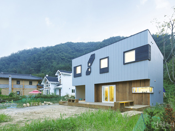 멋진 설계, 하자 없는 시공에 앞서 건축주들은 늘 건축비에 대한 고민을 먼저 갖고 있다. 설계ㆍ시공자가 그들의 가려운 데를 읽고 진정을 실어 지은 집이 경기도 양평에 지어졌다. 1억원이란 예산 안에서 건축의 한계를 껴안고, 이를 넘어서고자 했던 그들의 노력을 읽어본다. 취재 이세정 사진 변종석 ▲ 현관을 들어서면 거실 겸 주방의 공용 공간이 자리한다. 전면창을 통해 데크로 바로 나갈 수 있다. 작년 12월 초 어느 날, 건축비가 아주 적고 집의 규모도 작은데 설계가 가능하냐는 문의 전화를 받았다. 사정을 들어보니 동원할 수 있는 건축비용은 총 1억5백만원. 형질변경과 지하수 확보 등 건축에 필요한 제반사항을 포함한 금액이었다. 선뜻 하겠다는 말이 나오지 않았다. 나를 찾아 전화준 것만으로도 감사하여 어떻게 나를 알게 되었는지, 어떤 집을 원하는지 상투적인 질문을 했다. 그는 전화기 너머로 조심스럽게 자신이 살고 싶은 집에 대한 이야기를 시작했고, 내 마음은 조금씩 움직이기 시작했다. 건축주는 어린 아이 둘을 가진 젊은 부부로, 도시에서 벗어나 아이들을 자유롭게 키우고 싶어 전원생활을 결심했다. 그러나 의정부에 있는 작은 아파트를 팔아 그 돈으로 집을 지으려니 예산이 넉넉하지 않은 상황이었다. 비슷한 사례들을 찾던 중 ‘1억원대 집짓기(2012, 주택문화사 발행)’란 단행본에 소개된 ‘부래미 주택’을 보고 나를 찾게 되었다고 한다. 사실 부래미 주택은 6년 전에 지은 집이라 지금의 상황에서 비슷한 비용으로 집을 지을 수 있을지 자신이 없었다. 하지만 건축주는 화려하고 큰 집이 아니라, 가족의 행복을 키워갈 수 있는 작은 집이면 족하다고 거듭 말했고, ‘이런 집도 설계해주시나요’라고 조심스러운 청을 했다. 그동안 전국의 농촌 마을 만들기에 관계해 오며 적은 공사비와 그들에게는 비싸게 느껴질 법한 설계비 때문에 건축가들로부터 질 좋은 서비스를 제공받지 못하는 현실을 알기에 거절할 수는 없었다. 그런 연유로 가능한 방법을 찾아보자는 약속과 함께 이번 프로젝트가 시작되었다. ◀ 현관부는 브릿지 공간 아래 그늘을 만들어 물놀이와 휴식을 즐긴다. ▶ 창으로 자연의 풍광을 마주하는 아들의 방. 무한한 상상력을 갖고 크길 바라는 부모의 마음이 담겼다. ▲ 회색 포슬린타일과 어우러진 심플한 마감의 주방과 아일랜드 식탁. ㄱ자 창을 통해 마당에서 뛰노는 아이들을 한눈에 볼 수 있다. ◀ 2층으로 오르는 계단은 사용빈도가 높은 만큼, 멀바우와 자작나무 합판으로 견고하게 제작했다. ▶ 화려한 장식은 없지만 휴양지에 온 듯한 분위기를 선사하는 부부 침실 건축 공사비를 절감하기 위해서는 시공자와의 협업이 중요하다. 초기에 시공자를 정하고 재료의 선정과 공법에 대해 검토하면서 설계를 진행했다. 시공자가 공사비 범위 내에서 가능한 재료를 추천하면 이를 검토해서 설계에 반영하는 방식으로 예산을 넘어서지 않도록 신경 썼다.집의 구조는 공사기간을 줄이기 위해 경량목구조로 결정하였고, 결과적으로 2.5개월이라는 짧은 기간 안에 완공되었다. 30평 이하로 건축허가가 아닌 신고로 처리할 수 있었던 것도 공사기간 단축에 도움이 되었다. 건축 재료는 효율은 좋지만 상대적으로 가격 경쟁력이 있는 중소기업의 제품을 선택하고, 가장 물량이 많은 건물의 외관은 흔히 쓰이는 시멘트사이딩으로 마감하기로 하였다. 집이 지어지면서 가격이 저렴한 자재들로 인하여 혹 건물이 전체적으로 값싸 보이지는 않을까 하는 우려는 기우였다. 세워서 시공한 시멘트사이딩은 그 자체로 매력적인 색깔과 질감을 제공했다. 단지 누수가 우려되어 칠한 페인트의 컬러가 오히려 미감에 저해가 되었다. 목조로 구성된 벽체는 일부를 서가로 디자인하여 별도의 서가를 두지 않아도 많은 책을 꽂을 수 있게 하였다. 지붕은 건물 뒤쪽으로 경사를 주었는데 낙엽이 많은 주변 환경을 고려하여 선홈통을 두지 않고 바로 땅으로 떨어지게 했다. 덕분에 공사비도 절감하고 낙엽으로 홈통이 막혀 누수되는 하자도 피했다. 창문은 단열을 고려해 다소 비싼 로이유리를 사용하여 큰 창의 단점을 극복하였다. ▲ 자녀방은 부부 침실 곁에 나란히 자리해, 아직 어린 자녀들을 가까이서 보듬도록 했다. 건물의 형태는 외피면적이 가장 적은 박스형 2층으로 결정하였는데 주변건축물과 자연경관 사이에서 오히려 돋보이는 결과를 낳았다. 이 과정에서 건축주는 자신의 집이 어떻게 지어질 것인가를 수시로 확인하고 미리 의사결정에 참여할 수 있었다. 결국 공사 중에 재료를 바꾸는 일을 최소화하여 이중으로 경비가 낭비되지 않도록 원천적으로 막았다. 집은 약 30평 정도의 공간이 2개 층으로 나누어져 있다. 다소 좁게 느껴질 수 있는 문제는 1층 현관 입구에 진입공간을 넓게 확보하여 아이들의 놀이터로, 때로는 작업공간으로 활용하게 함으로써 심리적으로 집 전체에 여유가 느껴지게 하는 결과를 얻었다. 집 짓는 중에 건축주가 주변으로부터 가장 많이 들은 말은 ‘집이 왜 이리 단순하냐’는 질문이었다. 처음에는 이상하다는 반응이 지배적이다가 집이 점점 더 완성되면