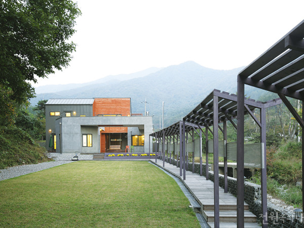 긴 담장을 따라 걷다보면 집과 마주하게 된다. 자연이 주는 온기를 곳곳에 들이고, 발걸음을 옮길 때마다 하나씩 새로운 공간이 그려진다. 건축주의 첫인상을 닮은 이곳에서 건축가가 담은 추상적인 공간을 만났다. 취재 김연정 사진 변종석 ▲ 산세와 어우러진 주택의 모습에서 여유로움이 느껴진다. 한켠에는 여울져 흐르는 시냇물을 끼고, 또 한 켠에는 경사도가 급한 산자락과 어깨동무한 좁고 긴 대지를 만난다. 산과 천이 만나서 만들어낸 단출한 형상이 서로에게 의지하듯 관계를 맺고 있다. 정착되어 있는 산의 덩치 큰 매스와 흐르는 선 사이에 사람이 들어가 거주하게 된다. 본래의 자연이든 인공으로 빚은 자연이든, 자연을 추상화하면 어떤 모습으로 형상화 될까? 건축주의 첫인상이 이 주택의 콘셉트가 되었다. 그의 섬유미술 작품도 함께 보았다. 비물질화되고 추상화한 작품과 인류의 표현이라고 느껴졌다. 화려한 수사법을 달고 사는 현대인과는 거리가 멀었다. 거주할 집에 대한 생각과 취향이 확실하고 군더더기를 거부하는, 이른바 추상적인 현대인이었다. 그의 표정과 사유를 추상화하기로 하였고 그것이 모티브로 작동되었다. 추상이란 어떤 대상의 전체를 재현하는 것이 아니라 눈에 덜 띄는 한두 개의 특성만을 나타내는 것이다. 형태와 공간을 구성하는 관습적 관찰형식에서 벗어나, 전체를 대표하는 특성을 표현하게 된다. 건축을 구성하는 내면성을 읽어내어 구축하는 것으로 작업을 시작하였다. 궁극에는 공간의 자체적 본질이 형상화되는 것이다. ▲ 작업실 앞 데크에 나와 언제나 아름다운 자연을 감상할 수 있다. ◀ 다양한 외장재의 조화가 멋스러운 오른쪽 입면 ▶ 2층 내부와 연결된, 데크 깔린 지붕층은 이 집의 또 다른 산책로 ◀ 주거공간과 별도로 마련된 건축주만의 아늑한 작업실 ▶ 시원하게 펼쳐진 마당은 드라마틱한 풍경을 만들어준다. 자연은 어떻게 추상화되는가? 캔버스가 아니라 공간 속에서 추상화되는 자연을 표현하고자 했다. 소리와 바람, 빛과 그림자, 자연의 빛깔 등이 수사적 껍질을 벗고 속성만을 이 공간에 남기려 한다. 환경 친화적 건축 또는 생태적 건축이라는 인공화된 친자연과 해와 물과 바람 등의 자연이 서로 무심하게 함께 거주할 수 있다면, 그것이 본질을 찾아가는 추상화의 공간일 수도 있겠다. 이 주택은 해와 바람, 시냇물 소리와 빛이라는 추상화된 원시적 자연이 머무는 구축된 마당을 중심으로, 매스와 가벽으로 둘러쳐진 영역을 제1차적 인공화한 자연공간으로 규정하여 구성하였다. 또한 기다랗게 뻗어나가려고 하는 대지의 형태적 속성을 지닌 앞마당을, 담장과 데크로 된 길로 마당공간을 연장하여 제2차 자연공간으로 만들었다. 건축물의 위계를 없애기 위해 현관은 드러내지 않았고 각 공간을 매개하는 역할을 한다. 내부는 크게 본채와 작업실로 구성하였지만 부분이 전체이고 전체가 부분인 듯 연결되어 있다. 건물의 형태는 세모와 네모의 조합으로 이루어진다. 공간을 형성하는 많은 선들은 본질적으로 단순화하면 세모와 네모를 지향한다는 가정을 세웠다. 네모를 수직·수평적으로 공간화하고 세모가 결합되는 형식이다. 전체적으로 단순하면서 공간의 절제를 꾀하고 있다. HOUSE PLAN 대지위치 경기도 양평군 지역지구 계획관리지역 / 자연보전권역, 수질보전특별대책지역 용도 단독주택 대지면적 837.00㎡(253.19평) 건축면적 157.60㎡(47.67평) 연면적 151.52㎡(45.74평) 1층 - 103.34㎡(34.26평) 2층 - 48.18㎡(14.57평) 규모 지상 2층 구조 철근콘크리트 + 일반목구조 시공 최형권(HOUSE PLAN) 설계 이윤하(건축사사무소 노둣돌) 02-776-3051, www.ecoarch.org각 실의 공간의 크기는 축소 지향적으로 최적화하였다. 전체적인 덩어리를 들여놓고 덜어내는 과정 속에서 대지의 생김새와 건축주의 공간소비 취향으로 재구성하여 잉여 공간을 최소화하였다. 이미 절개된 대지라는 몸의 형상 위에 탑재되어 기억하는 내적 이미지와 감각을 건축물에 투영하였다. 평면의 동선은 중정을 에워싼 채 순환적이고, 수직 동선은 좁고 가파르다. 자연요소가 건물과 만나는 추상화된 자연의 동선은 느리고 완만하게 대지를 감싸고 돌아간다. 내재되어 있던 대지의 고유수용감각적(Proprioceptive Sense) 이미지들은 인공건축물과 만나서 추상화되어 나타난다. 1층은 작은 안방과 거실, 주방 및 식당, 2층은 주인의 서재 및 침실로 콤팩트하게 구성되었다. 대지의 경사지 고저차를 수용한 평면과 2층과의 커뮤니케이션을 배려해 식당 상부는 오픈(Void) 형식을 취하였다. 2층 서재와 옥상지붕을 연결하여 경관 조망과 소규모 사적 만남을 매개한다.◀ 새하얀 외벽이 눈길을 끄는 심플한 주방 ▶ 레트로풍의 소파가 모던한 공간에 경쾌한 포인트가 된다. PLAN – 1F◀ 2층에 마련된 건축주를 위한 공간 ▶ 침실 맞은편에는 욕실과 게스트룸이 위치한다.지금까지 생태적이고 친환경적인 집짓기 작업에 전념하여 왔다. 건축에 있어서 친환경적 요소인 에너지, 재료, 물, 녹지, 토양, 대기 및 실내 공기질 등을 정량화하고 물리적으로 구축하는데 많은 노력을 했다. 그러나 이번 작업은 건축주의 철학과 작품