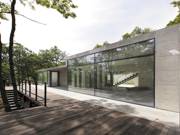 오랜 세월을 간직한 참나무숲에 나무들과 하나 된 잿빛 건물 한 채가 들어왔다. 대지에 대한 각별한 애정과 열정이 만들어낸 아틀리에, 그곳을 찾았다. 취재 김연정 사진 진효숙, 박창현 ▲ 나무를 피해 건물을 배치하는 등 주변을 배려하며 아틀리에를 설계하였다. ▲ 오래된 참나무숲에 위치한 건물의 외관 ELEVATION 3년 전, 지인을 통해 소개받았던 건축주와 함께 서교동 대지에 도시형 생활주택을 완공하였다. 덕분에 주변의 같은 기능과 규모, 그리고 같은 공사비로 디자인된 설계 건물이 경제적 이윤에 얼마나 많은 영향을 미치는가에 대한 경험을 했다. 건축주도 설계자도 심증은 있지만 물증이 없었던 이 용기가 실제로 그 사실을 여실히 보여 주게 된 것이다. 결과적으로 처음 주변 시세로 계획하였던 자금이 남았고, 이는 건축주가 이전부터 꿈꾸던 시골생활을 현실로 옮길 수 있는 여유자금이 되었다. 건축주는 몇 년 전 양평의 농촌 가옥을 빌려 1년 동안 잠시 살아 보았다. 그 경험으로 시골에서의 생활이 가능하고 적극적으로 필요하다는 생각에 이르렀다고 한다. 그래서 익숙한 양평 근처의 대지부터 알아보았다. 마음에 드는 여러 대지를 고른 후 몇 개로 압축하고, 그중 서너 개의 대지를 함께 둘러보았다. 같은 양평이라도 너무 넓어, 선택된 대지의 성격과 접근성, 가격 등도 천차만별이었다. 그러던 찰나, 하나의 대지가 강하게 시야에 들어왔다. 그 땅은 오래된 참나무숲으로 이루어진 경사지로, 370여 평의 임야였다. 이미 주위에는 유명 건축가가 지은 몇 채의 건물이 있었고, 진입까지의 도로와 전기까지 들어온 상태였기에 건물을 짓는 데는 별 문제 될 것이 없었다. 무엇보다 참나무숲에는 큰 바위와 그곳에서 나온 작은 돌들, 그리고 거기에 살던 동물과 새들의 소리가 있었다. 처음부터 이 숲을 위한 건물을 지어야겠다고 건축주와 공감한 뒤 설계를 시작하였다. ▲ 경사면에 그대로 건물을 앉혀 높낮이에 따라 다양한 경험을 유도했다. ▲ 시시각각 변화하는 나무의 모습은 계절에 따라 새롭게 다가온다. HOUSE PLAN 대지위치 : 경기도 양평군 대지면적 : 660㎡(199.65평) 건축면적 : 116.82㎡(35.34평) 연면적 : 100.36㎡(30.36평) 규모 : 지상 1층 구조 : 철근콘크리트조 마감 : 콘크리트 노출면 시공 : design forest(홍현득) 구조설계 : 은구조 조경설계 : 정성훈 감리 : a round architects 설계담당 : 권도연 설계 : 박창현(a round architects) 02-3144-3133www.aroundarchitects.com SECTION ▲ 계단을 따라 올라가면 건물의 또 다른 공간과 마주하게 된다. ▲ 손잡이와 문고리 등 공간 곳곳에서 발견되는 디테일에서 건축가의 배려가 엿보인다. 사진제공 : 박창현 우선, 사람이 이곳을 점유하기 전부터 있던 나무와 흙, 돌과 동·식물들 그리고 물과 바람에 대한 조사를 위해 꼼꼼히 실측하고 관찰하였다. 나무의 종류와 수령, 흙의 상태와 오랫동안 있어왔던 바위의 위치 등을 빈틈없이 체크하며 주변을 배려하는 것으로부터 시작하였다. 사람이 사용하기 전까지 그들이 이미 아주 오래 전부터 점유하고 있던 곳이니 이러한 조사와 배려는 당연히 필요하다고 생각했다. 나무를 피해 건물을 배치하고 새들이 둥지를 튼 나무까지도 확인했다. 기존에 있던 바위를 잠시 옮겨둔 뒤 건물이 완성된 후 다시 제자리에 두기로 하고 설계를 진행하였다. 불필요한 잡목들을 정리하며 건축주가 숲을 향유하고 바라보는 행위를 생각했다. 경사면에 그대로 건물을 앉히게 되니 나무들의 높낮이에 따라 이를 바라보는 다양한 경험을 하게 된다. 내부에서 연결된 데크로 나가면 참나무, 개암나무, 참죽나무, 오동나무 등 다양한 수종의 나무가 눈앞에서 가지를 흔들고, 그 사이를 타고 오는 시원한 바람과 따뜻한 햇볕은 일상에서 지쳤던 몸과 정신을 맑게 정화해 줄 것이다. ▲ 거실과 긴 복도를 사이에 두고 만나게 되는 주방의 모습 ▲ 모든 공간에 창을 내어 누구라도 만족스러운 휴식과 개방감을 느끼게 했다. ▲ 유리 통창으로 시공한 내부. 밖으로는 넓은 데크와 푸른 산세가 펼쳐진다.PLAN ▲ 내부 마감재와 바깥 풍경이 어우러져 자연과 교감하는 공간이 완성되었다. ▲ 천창에서 내려오는 밝은 빛줄기가 내부를 밝혀준다. 숲은 계절에 따라 다양하게 다가온다. 시간을 느끼고 시시각각 변화하는 풍부한 나무들에게 고마움이 생긴다. 낙엽이 지고 앙상한 가지만 남게 되면 그동안 숨겨왔던 아주 먼 풍경들이 눈앞에 펼쳐진다. 흰 눈이 내리면 건물 주위는 이내 다른 세계가 되어버린다. 해가 뜰 때 어둠이 걷히면서 숲의 형태가 드러나는 경험은 도심에서는 결코 느낄 수 없는 것이다. 거실과 주방 사이의 작은 복도는 공간의 크기를 조절해주는 장치이며, 숲을 일시적으로 차단하는 효과를 지닌다. 기능적으로 필요한 문과, 촉각적으로 느낄 수 있는 내부 곳곳에는 나무와 가죽을 사용해 디자인하였다. 또한 나무의 일부가 벽이 되고 건물의 일부가 숲이 된다. 아래채에서의 낮은 수평 창을 통해 나무 기둥들이 눈에 들어온다. 위채에는 하늘을 볼 수 있는 천창을 두어 맑은 빛줄기가 내부를 밝히며 그 공간이 지닌 특별한 분위기를 느끼도록 도와준다. 건축주와 함께 