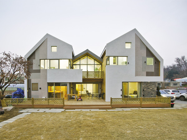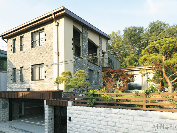 성격도, 취향도 다른 두 세대가 공존하게 될 집. 건축주의 의견을 반영해 서로의 라이프스타일을 존중하면서도 각자의 취향을 잘 살린 집을 만나본다. 월간 <전원속의 내집> 취재 김연정 /사진 황효철 ▲ 콘크리트조와 경량목구조가 조합된 주택의 외관 상생제(相生濟)는 두 세대가 같이 살아가는 집이다. 건축주와 처음 현장에서의 만남이 기억난다. 건축주는 현장에서 이 땅에 어떤 집을 지었으면 좋겠냐고 물어왔고, 간단한 스케치로 대답을 대신했다. 그리고 6개월이 지난 얼마 전, 주택이 완공되었다. 주택은 시작부터 굉장히 많은 문제들이 있었다. 목조주택 경험이 전무한 시공사를 선택한 건축주를 위해 목구조가 올라가는 내내 현장에 나가 있어야만 했다. 또한 박공지붕의 경사가 제각각 다르게 설계된지라 목수들의 불만의 목소리가 높았다. 하지만 결국 모두가 만족한 집이 완성돼 그간의 어려움은 이미 기억조차 나지 않는다. 콘크리트 집을 선호하는 1세대와 목조주택에 살고자하는 2세대의 타협점은 건물의 구조에서부터 이루어졌다. 그리하여 이 집은 콘크리트조와 경량목구조가 조합된 주택이다. 예전에 용인에 1층 철골조와 2, 3층 목구조로 이루어진 주택을 경험해본 터라, 어렵지 않은 결정이었다. ▲ 부모님이 머물게 될 1층의 거실 전경. 전면창을 두어 개방감을 확보했다. 이 집을 보면 누구나 두 채의 집과 가운데 끼인 또 하나의 집으로 인식하곤 한다. 첫 스케치에서의 의도는 양쪽에 두세대가 사는 각각의 집과 가운데 끼인 공용공간을 만들자는 것이었다. 하지만 건축주 가족들과의 만남 후에 집은 아래위 둘로 나누기로 결정했다. 계단을 오르내리기가 번거로운 부모님 세대를 고려한 계획이었다. 최종적으로 각 층은 주방이 속한 하나의 매스와 안방이 있는 하나, 그리고 둘을 연결하는 가운데의 거실 매스로 계획하게 되었다. 집은 점점 늘어날 가족구성원과 평소의 생활 패턴을 고려하여 최대한 많은 면적을 확보해야 했다. 법이 허락하는 최대한의 건폐율과 용적률에서 뒷마당에 주차장을 확보하기 위해, 그리고 큰길가에서 마당으로의 시선을 가려 좀 더 아늑한 마당을 만들기 위해 매스를 이리저리 이동하며 조합하는 작업이 이어졌다. 외부에서 봤을 때, 건물 크기에 대한 부담감을 줄이고자 양쪽 지붕처마 라인을 최대한 내리기로 결정했다. 도로 쪽에서 보이는 면은 지붕, 2층 벽, 그리고 1층 벽으로 분할된다. 1층 벽면에 사용된 청고 벽돌은 건물에 안정감을 준다. 또한, 2층 벽을 도로와 평행하게 돌출시켜 매스가 분할되어 보이도록 했다. 그 결과, 건물의 거대한 부피감을 다소 줄일 수 있었다. ▲ 1층 벽면에 사용된 청고벽돌은 건물에 안정감을 느끼게 한다. ▲ 식당 역시 곳곳에 창을 두어 채광과 환기를 극대화했다. HOUSE PLAN 대지위치 : 서울시 강동구 대지면적 : 311㎡(94.08평) 건축면적 : 170㎡(51.43평) 연면적 : 294㎡(88.94평) 건폐율 : 54.88% 용적률 : 84.13% 규모 : 지하 1층, 지상 2층 구조 : 철근콘크리트조, 목구조 주차대수 : 2대 최고높이 : 8m 설계팀 : 최헌준, 정상미, 김강, 주정영 설계 : 곽대원(Design Guild) 010-4912-2929, www.designguild.co.krEAST ELEVATIONFRONT ELEVATION01 지하 가족실 / 02 사랑방 / 03 현관 / 04 다용도실 / 05 화장실 / 06 거실 / 07 주방 / 08 보조주방 / 09 파우더룸 / 10 안방 / 11 방 / 12 다락◀ 두 세대가 함께 살면서도 각자의 독립성은 유지할 수 있도록 현관을 분리하였다. ▲ 두 개의 서로 다른 경사지붕이 만나 남쪽으로 또 하나의 창문을 만들어낸다. ▶ 하자가 발생할 수 있는 천창을 대신해 설계한 삼각형의 창 ▲ 차분한 블루톤의 벽과 다락공간이 자연스러운 조화를 이룬다. ▲ 자녀 세대의 2층 공간. 거실을 중심으로 두 공간을 분리했다. ◀ 높은 천장고 덕분에 공간이 더욱 확장되어 보인다. ▶ 다락을 확보하기 위해 지붕의 경사를 변형했다. ◀ 주방은 심플한 인테리어로 정갈한 분위기를 연출한다. 다락이 설치된 부분에는 실내 천장고를 고려하여 전체 지붕과 다른 경사의 지붕을 적용했다. 서로 다른 두 개의 경사지붕은 남쪽으로 삼각형의 창문을 만들어 낸다. 그 창을 통해 시간마다 다른 태양광이 내부로 들어올 것이다. 하자가 빈번한 천창을 피하면서도 다락이 어둡지 않았으면 하는 마음에서 떠올린 아이디어다. 추가로 도로 쪽에 건축주가 원하는 작은 발코니가 생겼다. 간혹 주위에서 이 집은 어떤 콘셉트냐고 물어온다. 난 그저 기능에 충실한 집이라고 말하고 싶다. 주차장과 더 아늑한 마당을 위해 매스를 이동시키다보니 도로 측에서 느껴지는 매스의 거대함은 지붕과 2층 평면을 변형하는 것으로 해결했다. 또, 다락을 확보하기 위해 지붕의 경사를 변형하고, 그 틈을 타고 빛이 들어온다. 물론 이 모든 것을 처음부터 의도하여 이렇게 디자인했다고 말할 수는 없다. 주어진 대지의 상황에서 건축주와의 소통을 통하여 하나하나 해결해 나가는 것이 바로 주택 설계가 아닌가 생각한다. 결국 주택은 건축가 혼자 짓는 것이 아니기 때문이다. <글 _ 곽대원> 건축가 곽대원 2005년 국민대학교 건축과를 졸업하고, 가와디자인그룹과 유신건축에서 근무했다. 2008년 네덜란드 베를라헤 