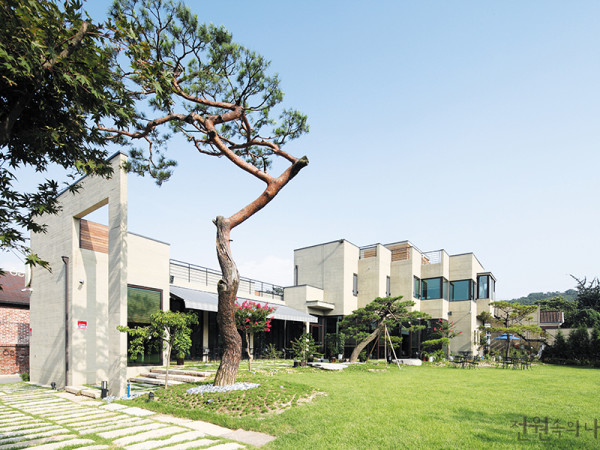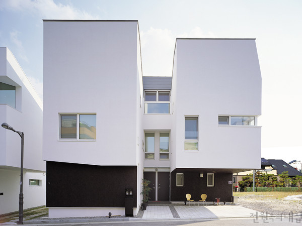 한 대지에 두 세대가 함께 사는 듀플렉스 하우스(Duplex house). 건축가 조성욱 씨와 친구 김재윤 씨의 판교 단독주택 ‘무이동’의 기본 컨셉도 바로 여기서부터 출발한다. 집짓고 살 생각이 전혀 없었던 건축가 조성욱 씨가 집을 짓게 된 것은 땅콩집을 방문하고 듀플렉스 하우스의 고질적인 문제들을 자신만의 건축적 해법으로 풀어갈 수 있으리라 확신한 후였다. 그렇게 해서 지어진 하나의 박스형 메스에 나란한 두 채의 건물이 닮은 듯 다른 듯 서있다. 마치 쌍둥이처럼 친구와의 땅 나눔이 기꺼운 듯, 그만의 세심한 설계로 공간 구석구석 적당한 가까움과 거리 두기의 요소들이 읽히고 또 읽힌다.취재 정사은 사진 변종석▲ 북측의 주출입구는 두 개 박스의 조합이다. 외관은 자정 작용을 가진외단열재 퀵믹스로 마감했다.- 건축가의 말 -사람은 집을 만들고, 집은 사람을 만든다고 한다. 건축가는 집을 만듦으로서 그 역할을 다하는 것이 아니라, 만들어 놓은 집이 다시 그 안에 거주하는 사람을 만들어 줄 수 있도록 삶의 바탕이 되는 그런 건축을 만들어 주어야 한다. 건축가가 ‘사람 = 대지 = 건축’이라는 삼위일체적 신념을 가진다면, 아름다운 건축, 아름다운 마을, 아름다운 도시는 남의 나라 이야기가 아닐 것이다.건축가의 향연이 펼쳐지는 이곳 판교의 단독주택 용지. 조성욱•김재윤 씨의 무이동(無二同) 주택은 그 한복판에 자리하고 있다. 대지 마련부터 건축 설계, 그리고 시공까지 모든 과정을 함께 한 두 사람이 반가운 얼굴로 손님을 맞는다. 서로에 대한 신뢰가 빚어 낸 세상에 단 하나뿐인 ‘맞춤형 집’에 대한 이야기가 시작된다.▲ 서쪽 조성욱 씨의 집에는 대나무가, 동쪽 김재윤 씨의 집에는 단풍나무가 식재되어 있다. 같은 듯 다른 공간은 이런 점에서 드러난다.집짓기, 그 여정의 시작미리 말해두자면, 모든 일은 건축가 조성욱 씨의 친구인 김재윤 씨로부터 시작됐다. 큰딸이 초등학교 4학년이 되기 전에‘내 집’을 짓고 싶어 했던 그는 고등학교 동창인 조성욱 씨에게 적절한 설계자나 시공회사를 소개받을 요량이었다. 그러나 막상 조성욱 씨는‘나도 같이 짓자’며 집짓기에 선뜻 동참했다.도시에서 나고 자란 아스팔트 키즈는 이해할 수 없을 지 모르지만, 어른들에게 흙과 자연에 대한 갈망은 항상 가슴 한켠을 차지하고 있다.‘아이들을 위해서 집을 짓는다’는 연유를 당사자인 아이들이 이해할 리 만무하지만, 더 이상 펜스가 둘러진 아파트 놀이터가 아닌, 내집 마당에서 뛰어노는 환경의 변화는 아이들의 인성과 자아 형성에 지대한 영향을 미침을 어른들은 잘 알고 있다.미션 _ 부족한 면적을 확보하라!함께 집을 짓기로 결정한 후 듀플렉스 타입으로 확정하기까지 치밀한 조사를 거쳤다. 두 사람 모두 서울을 기반으로 생활했기에 멀지 않은 판교의 단독주택지로 땅을 결정하는 것까지는 문제가 없었다. 하지만 넓지 않은 231㎡의 대지에 나란히 두 집을 올리려니 평면부터 수직 동선 설계와 시공과정까지, 쉬운 것은 단 하나도 없었다.▲ 옥상정원에는 잔디와 흙 사이 한 층, 그리고 골조면이 닿는 한 층의 두 층으로 방수층을 주어 물 빠짐에 신경 썼다. - 공용 계단실과 옥상정원의 이유 있는 변신 -옥상으로 향하는 계단부는 영화를 보거나 빨래를 너는 용도이며, 옥상정원은 바비큐 파티와 겨울날 눈썰매를 타는 데 활용될 공간이다. 다양하게 이용될 수 있도록 수목 식재 보다는 넓은 잔디와 데크 위주로 계획했다. 아파트에서는 누릴 수 없는 호사다. 가족사진을 찍자 하니 무이동 식구들이 총출동했다. 마실 온 옆집 식구들까지 한 자리에 모였다. 조성욱 씨의 건축가로서의 능력은 이러한 상황에서 빛을 발했다. 건축가는 제한된 조건 하에서 고수할 것과 버려야 할 것을 결정하고, 비용의 문제를 건축주와 논의하는 과정을 거쳐 설계를 완성한다. 이 집에서 건축가 조성욱 씨가 해결해야 할 가장 큰 문제는 면적의 확보였다. 두 집 모두 두 명의 자녀가 있고, 더구나 친구인 김재윤 씨는 어머님과 함께 2세대가 거주하길 원했다. 그러자면 각자 최소한 80~100㎡의 면적이 필요했다. 건축가가 내놓은 해결책은 지하실을 조성해 부족한 실내 공간을 확보하고, 두 가정이 언제든 사용할 수 있는 여분의 공용 공간을 내외부에 마련하는 것이었다. 또, 한창 뛰어 놀 나이의 자녀들을 위해 옥상에 또 하나의 프라이빗 정원을 만드는 방안을 제시했다. 온 가족의 토론 끝에 비용과 노력을 들여 이 공간을 마련해야 할 당위성이 확보되었고, 이로써 규모의 문제는 해결점을 찾았다. 이렇게 지어진 집은 지하실을 포함해 각 103㎡의 연면적을 갖는다. 약간의 차이로 국민주택 규모를 넘지만, 각종 세제 혜택의 문제와 면적의 확보를 두고 비교했을 때, 더 중요한 것을 얻었기에 양쪽 건축주 모두 크게 유념치 않았다. 지피지기(知彼知己)면 백전백승(百戰百勝)이라 했던가? 자신에게 필요한 것과 버려야 할 것이 무엇인지 아는 지혜가 이러한 중대 결정을 가능하게 했다. ◀ 양쪽 집에서 접근할 수 있는 이 공간은 스크린을 설치해 두 가족의 전용 영화관으로 활용될 계획 ▶ 흐린 날 빨래를 널거나 편히 