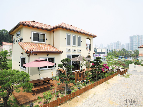 동남쪽으로는 남한산성, 서쪽으로는 대모산을 마주하는 빼어난 전망. 건축주는 그 풍경을 혼자 즐기기 아까워 막 구입해 살고 있던 집을 헐고 카페 겸 집을 다시 짓기로 했다. 까다로운 건축 규제 안에서 조망과 정원의 아름다움을 최대한 살리고자 한 노력이 묻어나는 집이다. 취재 편집부 사진 변종석◀ 대모산 풍경을 안고 있는 듯 건물을 배치해 모든 공간에서 전망이 뛰어나다. ▶ 목재 데크 대신 자연석을 깔아 내구성을 높이고 있는 그대로의 정원처럼 아름답게 구성했다. 서울 강남구 자곡동에는 ‘교수마을’로 불리는 오래된 주택 단지가 있다. 농가 몇 채 있던 마을에 한 교수 동호회가 집을 짓기 시작한 이후, 도시 가까운 곳에서 전원생활을 누리고자 하는 이들이 삼삼오오 모여 든 동네. 수서역에서 차로 5분 거리지만, 그린벨트 내 취락지구로 정해진 마을은 초기와 같이 조용하고 쾌적한 분위기다. 건축주 부부 역시 도심 접근성과 주변 풍광에 반해 이곳에 있던 구옥을 구입했다. 살림집을 염두에 두고 리모델링 해 입주한 지 6개월. 집을 방문한 지인들은 하나같이 ‘카페를 열어야 될 위치와 전망’이라고 입을 모았다. 부부는 고심에 빠졌고, 결국 석양이 아름다운 마당을 내다보다 카페 겸 살림집을 다시 짓기로 마음 먹었다. 리모델링 공사가 끝난 지 6개월만에 신축 공사는 또다시 시작되었다. 대지는 그린벨트 내 취락지구로 근린생활시설이 가능했다. 그러나 건폐율 등 법적 규제가 복잡하고 아침저녁으로 공원녹지과에서 단속을 나올 정도로 건축이 까다로운 지역이었다. 게다가 땅 자체의 모양도 만만치 않았다. 좁고 길게 뻗은 모양새에 좌우 세모꼴의 날개가 달린 대지는 부부를 한참 고심하게 했다. 결국 땅의 형태 그대로 건물을 그리고 1층은 상업 공간, 2층과 3층은 살림집과 사무실로 활용하기로 결정했다.건물은 대모산이 마주한 서쪽을 향해 일자형으로 배치했고, 창호 역시 모두 서쪽 입면에 설치했다. 상업 공간이다 보니 전망을 최우선으로 고려할 수 밖에 없었다. 대신 난방비에 대한 부담을 줄이고자 노출콘크리트에 우레탄폼으로 내단열 시공하고 창호는 고단열의 기능성 도어를 택했다.모던한 건물을 원했던 바람대로 건물은 송판무늬 노출콘크리트로 지어졌고, 평지붕으로 디자인되었다. 건물 뒤편으로는 길을 따라 콘크리트 벽면이 성벽 같은 모습으로 비친다. 탁한 시멘트색보다 조금 따뜻하고 은은한 색으로 발현했고, 여기에 발수처리까지 꼼꼼히 해 완성도 높은 골조를 보여주고 있다. 특히 표면 질감의 확보를 위해 레미콘 회사와 협력하여 콘크리트 배합비 및 첨가제를 조절해 노출콘크리트 시공 시 생기는 재료 분리 등의 문제점을 사전에 꼼꼼하게 예방했다는 후문이다.▲ 카페 바닥은 온돌을 깔아 바닥난방을 한다.▲ 건축주가 직접 제작, 페인팅한 카운터 시설물▲ 해가 질 무렵 건물에서 새어 나오는 빛과 석양이 멋지게 어우러진다.▲ 출입구는 자연석을 이용한 계단과 콘크리트 구조물로 육중한 무게감을 준다. ▲ 액자들이 늘어선 벽면 앞으로 실내외 테이블을 두어 안팎의 경계가 없다. ◀ 건물 모서리에 앉힌 엔소의 간판 ▶ 카페에서 취급하는 고급 유기농 원두 인테리어와 조경은 건축주 부부가 직영으로 진행했다. 오래된 정원석은 중국에서 직접 컨테이너째 수입했고, 카페의 움직이는 조명도 미국에서 공수한 소품들이다. 길게 이어진 테이블 벽면에는 그림과 액자를 직접 준비해 달고, 카운터와 선반 디자인도 목수와 협업해 형태를 그리고 칠까지 손수 했다. 상업 공간임에도 바닥에 온돌식 난방을 채택한 점도 눈에 띈다. 부부는 전국 각지의 유명한 카페를 답사하고 원두와 차, 와인 리스트를 구성해 서비스하고 있다. 특히 더치와 핸드드립 커피는 이곳의 인기 메뉴. 여기에 브람스라고 하는 얇은 밀가루 반죽을 도우로 한 피자는 이곳만의 브런치 메뉴다. 현재 1층은 카페, 2층은 살림집으로 분리해 사용하고 있지만, 카페 운영이 활성화되면 전망 좋은 2층까지 카페로 오픈해 베이커리로 별도 활용할 계획도 갖고 있다. 모나지 않은 둥근 원이란 뜻의 ‘ENSO(엔소)’는 원두와 포도의 원형에서 따 온 카페 이름이다. 방문객들이 이 원형 같은 공간에 푸른 잔디와 꽃, 향기에서 느끼는 여유를 담아내길 바라는 부부의 마음이 전해진다. HOUSE PLAN 대지위치 : 서울시 강남구 자곡동 271-11 대지면적 : 350㎡(106.06평) 건물규모 : 지상 2층 건축면적 : 201.86㎡(61.16평) 연면적 : 297.91㎡(90.27평) 건폐율 : 57.67% 용적률 : 85.11% 주차대수 : 2대 최고높이 : 10.5m 공법 : 기초 - 철근콘크리트 줄기초, 지상 - 철근콘크리트(송판노출) 구조재 : 철근콘크리트 단열재 : 우레탄폼 단열공법, 아이소핑크 창호재 : LG시스템창호 계획설계 : (주)DND그룹 건축사사무소 02-578-8841 시공 : 주택건설 우리집 http://www.myhousec.com/INTERIOR SOURCES 내벽 마감 : 실크벽지, 친환경 VP도장 바닥재 : 원목마루 욕실 및 주방 타일 : 수입타일(윤현상재) 수전 등 욕실기기 : 아메리칸 스탠다드 주방 가구 : 주문제작 조명 : 국산 방문 : 영림도어 ※ 월간 <전원속의 내집> www.uujj.co.kr 본 콘텐츠의 저작권은 (주)주택문화사에 있으