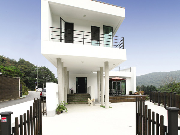 완벽한 외부도, 내부도 아닌 공간이 많아질수록 공간은 풍성해진다. 예를 들어 천장이 있지만 벽이 없는 필로티라던가, 바닥과 벽은 있지만 천장은 없는 데크가 그 대표적인 예. 비용과 규모의 문제로 아파트 등의 공동주택에서는 실현할 수 없었던 이러한 ‘중간 성격’의 공간에서 펼쳐지는 다양한 활동은 집에 컬러풀한 색채를 입히는 일등공신이다. 형태를 그대로 드러내는 두 개의 흰 박스가 1,2층으로 교차된 채 대지에 앉혀 있다. 거대해 보이는 외관과 다르게 집은 85㎡ 이하의 국민주택 규모이다. 취재 정사은 사진 변종석- 건축가의 말 -건축은 문화이기에, 다양한 주거의 모습을 인정하는 문화를 만들어야 한다고 생각한다. 건축주와의 소통을 최우선으로 생각하고, 이제까지 배워온 것보다는 배워야 할 것이 더 많다고 생각하는 젊은 건축가로서 여러 삶의 모습을 담아내는 집이 많아질수록 사회는 다채로워질 것이라 믿는다. ▲ 두 개의 메스가 십자로 교차되어 건물은 연속적인 채움과 비움의 공간을 갖는다. 서울 양재에서 자가용으로 20분 거리, 아직은 사람 손을 덜 탄 경기도 용인 고기동의 자연 속에 그리 뽐내지도, 그렇다고 흐릿하지도 않은 하얀 집 한 채가 서 있다. 시베리안 허스키와 진돗개의 믹스견인 둥이가 본분을 망각한 채 손님을 보고 꼬리를 흔드는 이 집은 건축가 송태성 씨의 자택이다. 건축가가 집을 짓는다는 것의 의미 패션디자이너가 입는 옷이 그 사람의 디자인능력을 검증하듯, 건축가가 지은 작품, 더구나 자신의 집은 그 사람의 디자인 철학과 주거를 바라보는 시선을 여과 없이 드러낸다. 그렇기에 건축가에게 자택을 짓는다는 의미는 그 사람의 건축 인생을 총망라하는 일종의 ‘대사건’이다. 건축가 송태성 씨도 언젠간 자신의 집을 지으리라 생각해왔지만, 이 ‘집짓기’의 시기는 계획보다 일찍 찾아왔다. 그 역시 두 아이가 태어나고 가족구성이 달라지자 더 이상 아파트의 장점이 단점을 상쇄하지 못하는 상황에 이르렀다. 신이 나 뛰어노는 아이들에게 조용히 하라고 소리치는 것도 한두 번이지 아이들이 주눅들까 노심초사 염려하며 닭장 같은 아파트에서 키우는 것도 더 이상 못 할 짓이라는 생각이 들었다. 결국 부부는 이전부터 꿈꾸던 ‘내집 지어 이사가기’를 실현하기로 마음먹는다. 아이들을 자연 속에서 풀어놓고 싶었고 일상에 쫓기지 않는 여유로운 삶을 선물해주고 싶었다. 자연스레 분주한 도시보다는 한적한 교외를 알아보기 시작했다. ◀ 콘크리트로 마감한 마당은 아이들이 자전거를 타고 뛰노는 놀이터다. ▶ 도로에 면한 북측면은 에너지 절감과 사생활 보호를 위해 창을 최소화했다. ▲ 아이들은 비 오는 날에도 필로티 하단부와 입구의 포치에서 소꿉장난을 하며 논다. 세상에서 가장 솔직한 공간, 나의 집 주택 설계는 어렵다. 한두 가지 목적만을 가진 상업공간의 설계와는 다르게 24시간 생활하는 삶의 터전이 되는 곳으로서 가족의 생활 패턴과 생애 주기를 파악하고 제도와 기술, 법규 그리고 자본이라는 제약 속에서 공간을 풀어나가야 하기 때문이다. 그렇기에 구성원들 각각의 다양한 욕망을 3차원의 공간에 구현해 꿈을 현실화시키는 역할이 건축가의 소임이다. 건축가는 집의 모양이나 외장재 등 보여지는 것을 결정하기에 앞서 먼저 공간의 성격을 규정하고 구성원들의 욕망을 적절히 조율하는 과정을 거친다. 집짓기가 시작되고 송태성, 강남이 씨 부부는 각자 역할을 맡았다. 건축 설계를 비롯한 공간의 구성은 전적으로 남편의 몫, 공간의 쓰임을 결정하고 가구 위치를 정하는 일은 아내가 맡기로 했다. 아이들과 집에서 대부분의 시간을 보내는 사람은 아내였기에, 건축가는 두말 않고 이 역할을 일임했다. - 중간 성격의 공간, 필로티와 데크 - 건축가는 중간 성격의 공간을 많이 만들어 이곳에서 벌어지는 가족의 활동을 풍성히 하고 싶었다. 아파트에서는 가질 수 없는 공간들이기 때문이다. 마당에 데크를 설치해 거실의 확장을 꾀했고, 건물의 일부를 필로티로 들어 올려 날씨와 관계 없이 야외활동을 할 수 있는 포치로 활용했다. 건물 규모에 비해 심리적으로 입구부가 과대한 부분이 있지만, 계단부에서 아이들이 노는 모습도 볼 수 있고, 비 오는 날 의자 하나 두고 책도 볼 수 있어 만족한다. ▲ 거실 창을 활짝 열어 데크와 연결해 연속적인 공간으로 넓게 사용한다. 공간에 ‘담을 것’을 먼저 생각하자 설계를 하며 송태성 씨가 가장 중요하게 생각한 것은 ‘만들고 싶은 가정의 모습’이었다. 새로 지어질 집에서 아이들과 많은 시간을 보내고 싶었던 부부는 각 방을 최소한으로 구성하고 대부분의 활동은 공용 공간인 주방과 거실에서 이루어지도록 유도했다. 그러다보니 자연스레 1층에는 공용공간을 두어 접근과 확장성을 꾀했고, 조용한 2층에는 각 방을 배치하게 됐다. 선택과 집중으로 오밀조밀하게 공간이 구성된 까닭에 국민주택(85㎡) 이하로 지을 수 있게 됐고, 이로 인해 주택 취등록세 절감과 대출금을 마련하는데 제도적 도움을 받을 수 있었다. - 공간에 쉼표를 만들자 - 2층의 길다란 메스는 자칫하면 너무 무거운 짐을 