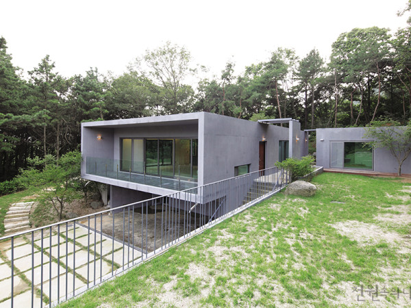 전원주택으로 가는 발걸음에 ‘집’은 절반의 이유일 뿐, 나머지 절반은 ‘자연’임에 틀림없다. 집의 안과 밖을 연결하는 탁월한 동선과 설계를 보여준 이 집은 내외부가 언제든 소통하며 자연과 하나 되는 건강한 삶을 위한 휴식 공간으로 지어졌다. 취재 정사은 사진 변종석 ▲ 땅을 크게 훼손하지 않게끔 앉혀진 두 동의 건물 ▲ 건물들 사이에 작은 못과 마당이 있어 전원생활에 야외활동을 더한다. ▲ 측면 및 뒷편 언덕에서 바라본 건물의 모습▲ 울창한 숲속에 폭 싸인 주택. 본동 지붕으로 실내 보이드 공간에 심긴 나무가 빼꼼히 고개를 내밀고 있다. 골짜기 깊은 곳 야트막한 산 능선에 자리한 주택단지. 내로라하는 건축가들의 작품이 한집 건너 한 집씩 있는 이곳에 간결하면서도 웅장한 노출콘크리트 주택이 들어섰다.대부분 주말주택으로 사용하는 이 단지는 지인들에게 알음알음 개방된 프라이빗한 땅이다. 이곳의 집들은 자연 속에 폭 파묻혀 주변과 하나 된 모습을 보이는 점이 다른 주택단지들과는 확연히 다르다.건물은 능선을 깎아내지 않고, 그 경사를 이용해 단차 구분을 냈다. 건물 앞쪽은 경사면으로부터 삐쭉이 튀어나왔는데, 이는 자연스럽게 필로티 구조를 만들어내며 흥미로운 외관을 형성한다. 단층 주택임에도 2층짜리 건물로 보이는 이유다. 이런 자유로운 형태를 표현할 수 있는 구조재로 철근콘크리트만 한 것이 없다. 또한, 별다른 치장 없이 거대한 건물의 외형을 강조하기에 건축가들 사이에서 ‘솔직한 재료’라 평가받는 노출콘크리트 마감이 제격이었다. 이 집도 콘크리트의 매끈한 노출면이 매스의 거대한 느낌을 강조하는 역할을 한다. 하지만 건물 뒤편으로 돌아가면 정면의 웅장한 모습과는 사뭇 다른 단정한 단층주택의 모습이 펼쳐진다. 뒤쪽의 언덕에서 바라보면 건물은 땅과 하나 되어 폭 파묻혀 있는 느낌이다. 대지와 순응한다는 표현이 적절할 것이다. ▲ 동쪽의 큰 창으로 아침햇살을 가득 받아들일 수 있도록 배치했다. ▲ 부부만을 위한 욕실공간 본래 2층으로 계획되었지만, 평소에는 부부만 기거하기에 2층을 분리해 별동으로 앉혔다는 설명이 인상적이다. 둘이 살기에는 단층이 좋고 관리도 편하다는 이유다. 집에는 도심에서 지내던 건축주 부부가 노년의 삶을 고즈넉이 즐길 수 있는 장치들이 곳곳에 산적해 있다. 건물이 위치한 양평이라는 땅에서부터, 언덕을 뒤에 두어 언제든 산 속에 있는 기분을 느낄 수 있는 점, 아침잠이 적은 부부를 위해 동쪽에 큰 창을 내어 햇살과 함께 이른 하루를 시작할 수 있게 한 점 등이 그것이다. 거실과 주방을 하나의 구역으로, 그리고 서재와 안방을 또 하나의 구역으로 설정해 오가는 움직임도 명료하고 단정하다. ▲ 거실과 서재를 잇는 연결부에 중정을 만들어 채광을 좋게 하고 소정원을 감상할 수 있게 했다. ▲ 건물 안쪽 가장 내밀한 곳에 위치한 서재. 왼쪽 슬라이딩 도어 너머에는 안방이 위치한다. ◀ 거실 안쪽에 위치한 다실 가운데 중정부는 이 집의 백미다. 주변은 자연 그대로 둔 채, 건축주가 가꿀 수 있는 최소한의 정원을 들인 것. 하지만 이 또한 온실처럼 꽉 막혀 인위적인 형태가 아닌, 사계절을 오롯이 담도록 야외와 연결되어 있어 자연 일부를 집 내부로 빌린 형태다. 건물 오른편에 위치한 보조동은 주말에만 들르는 자녀세대를 위해 최대한 단출하게 만들었다. 두 개의 건물 사이에 난 작은 길과 마당은 두 건물을 잇는 매개공간으로 이곳에서 손주가 뛰어 놀고, 온 가족이 모여 바비큐파티를 할 것이다. 이 집은 젊었을 적 열심히 일한 부부를 위해 그야말로 ‘여유로운 휴식’을 선사한다. HOUSE PLAN 대지위치 : 경기도 양평군 대지면적 : 1239.67㎡(375평) 건물규모 : 1층 건축면적 : 195.04㎡(59평) 연면적 : 195.04㎡(59평) 건폐율 : 20% 용적률 : 80% 주차대수 : 3대 최고높이 : 7m 공법 : 기초 - 줄기초, 지상 - 철근콘크리트 구조재 : 철근콘크리트 지붕재 : 철근콘크리트 단열재 : 펙트론 열반사단열재, 인슐레이션 50㎜ 외벽마감재 : 노출콘크리트 창호재 : 공간창호 건축설계 : 르몽드레죠(주) 곽데오도르 인테리어설계 : 르씨지엠 구만재 시공 : C.N.E(건축과환경) 031-771-8788 http://blog.naver.com/ire700HOUSE SOURCES 내벽 마감 수성페인트 바닥재 원목마루 욕실 및 주방 타일 이태리 수전 등 욕실기기 아메리칸스탠다드 주방 가구 한우리아트 조명 램프랜드 현관문 일진게이트 알루미늄도어 방문 제락 아트월 멀바우 붙박이장 한우리아트 데크재 멀바우 원목 후로링 ※ 월간 <전원속의 내집> www.uujj.co.kr 본 콘텐츠의 저작권은 (주)주택문화사에 있으며, 이를 무단 이용하는 경우 저작권법 등에 따라 법적책임을 질 수 있습니다.