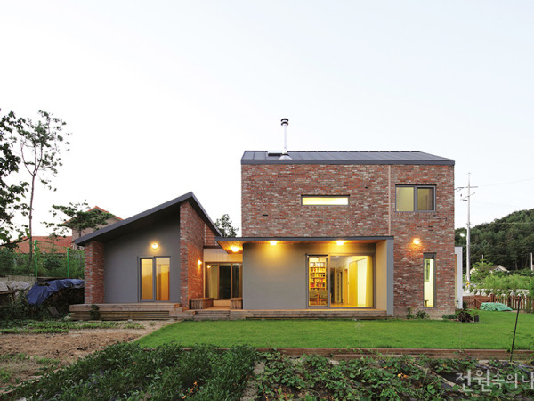 경기도 양평군의 평화로운 마을, 작은 산수유나무가 아늑하게 품어주는 벽돌 집 한 채가 눈에 띈다. 가족의 취향과 건축가의 배려로 지어진, 공간 활용이 돋보이는 집안을 들여다본다. 글 김창균 취재 김연정 사진 변종석 ‘집짓기 바이블’을 공동 집필하는 동안, 지인에게 양평에 대지를 둔 주택 설계를 의뢰받았다. 건축주는 출판업에 종사하면서, 중학생 아들을 둔 매우 소탈한 성격의 부부였다. 처음 만난 자리에서 그들은, 35평 2층 규모의 따뜻하고 튼튼한 단독주택을 원한다고 전했다. 새로 부지를 개발하여 생기는 산수유마을 초입에 위치하고 다른 집보다 비교적 먼저 지어지는 만큼 외관을 돋보이게 할 수도 있었지만, 건축주 부부는 그저 소박하면서 단단한 집이면 충분하다고 거듭 당부했다. 또한 집은 남쪽을 향하고 텃밭을 일구며 집안 곳곳에서 책과 함께 있길 바란다고 했다. 따라서 1층은 손님을 맞이하는 공적인 공간이면서 부부의 공간으로, 2층은 가족과 아들을 위한 사적인 공간으로 정했다. 허가 면적은 최대한 작게 하되, 부족한 부분은 다락을 이용해 채우기로 하였다. ▲ 고벽돌로 마감된 주택은 건축주의 바람대로 소박하고 단단한 모양새로 완성되었다. ◀ 2층 내부와 연결된 작은 테라스 ▶ 현관 앞 포치. 남측 마당과 원경이 프레임 속에 들어온다. 주어진 대지는 일반적인 전원 속 다른 부지와 달리 비교적 단순한 직사각형이었다. 내부 지향적으로 구성하고 남향으로만 배치할 경우, 자연과 일대일로 대응하는 인공물로 남을 우려가 있었다. 설계를 진행하면서 다양한 대안을 검증하였고, 결국 집 전체를 여러 개의 켜로 나누어 자연과 최대한 접하면서 조금은 느리게 생활할 것을 제안했다. 심플한 공간구성의 아파트에서 편하고 빠르게 삶을 살던 건축주 가족에게 속도보다는 가족만의 이야기와 다양한 접촉이 있는 집을 만들어주고자 했다. 대문을 열고 마당으로 발을 내딛으면, 안쪽으로 5개의 켜가 나누어져 있다. 우선 마을 입구이다 보니 현관을 적당히 가릴 벽을 설치할 필요가 있었다. 대신 남북으로는 벽을 두지 않고 열어두기로 했다. 벽을 보고 진입하다 방향을 돌리면 남측 마당과 원경이 프레임 속에 들어온다. 이로 인해 현관 앞에는 자연스레 비와 햇빛을 피하는 포치가 만들어졌다. 전이공간인 입구 데크를 지나 현관에 들어서면, 홀-거실과 식당-작은 도서관-안방 공간을 하나씩 만나게 된다. 각 공간은 다양한 방향과 거리감을 가진 창문을 통해 외부 풍경을 끌어들여 차이와 풍성함을 주었다. 입구 홀과 작은 도서관은 1층에서 주요 공간을 연결하면서 속도를 조절하는 역할을 담당한다. 특히 작은 도서관은 공적인 거실에서 사적인 안방을 분리하여 별채처럼 보이도록 함과 동시에 남북으로 창을 내어 자연을 끌어들였다. 건축주 부부는 이곳에서 시간에 따라 변화하는 자연과 함께 차 한 잔의 여유를 즐길 것이다. 설계 과정 중, 건축주는 시골에서 가끔 이곳을 방문하실 어머님을 위한 공간을 요청했다. 어머님 방은 별도로 구획하지 않는 대신 거실과 연계하여 미닫이문으로 분리와 확장을 할 수 있게 해, 손님방 등 다목적 공간으로 사용 가능하도록 배려했다. ▲ 2층으로 올라가는 계단은 상부가 오픈되어 집안 전체를 느끼게 한다. ◀ 대지가 마을 입구인 만큼, 현관을 적당히 가려줄 벽을 설치했다. ▶ 마당을 향한 전면창과 천창이 집안으로 자연을 이끈다. ◀ 미닫이문으로 공간의 분리와 확장이 가능하도록 배려했다. ▶ 아들의 방. 다락은 아이의 놀이터 겸 취침 공간이 된다. ◀ 가족이 모여 책과 함께 이야기를 나누게 될 장소 ▶ 거실상부의 다락공간이 시선을 끈다. 수평 공간의 흐름을 5개의 켜로 나눔과 동시에, 곳곳에 단 차이를 두어 기능의 분리와 수직이동의 즐거움을 주었다. 집 안에서 실제 몸으로 느껴지는 공간의 크기는 2층 이상이다. 안방은 거실보다 조금 높게 분리되어 있고, 2층으로 올라가는 계단은 상부가 오픈된 공간 속에 위치하여 집안 전체를 느끼며 움직인다. 각 레벨별로 총 3개의 다락 공간을 배치하여 수직적 변화와 함께 부족한 공간을 보충했다. 안방의 수납전용 다락은 계절별 짐을 보관하고, 주계단과 연결된 다락은 가족이 모여 책과 함께 이야기를 나누며, 거실 상부 다락은 아들 방에서 아이의 놀이터 겸 취침 공간이 된다. 환경친화적이고 단열성이 우수한 2×6 경골목구조를 바탕으로, 외벽 마감은 러시아산 고벽돌로 결정하였다. 고벽돌은 마을 입구에서 소박한 느낌으로 표현됨과 동시에 건축주 부부의 기품을 나타내면서 미래에도 함께 세월의 흔적을 나누게 될 것이다. 여기에 현관 앞 가림벽은 스터코 뿜칠로 마감하여 고벽돌과 대비를 이루면서 정갈함과 동시에 미니멀한 입구의 분위기를 전달한다. 남측 거실과 안방 전면에는 차양을 가진 툇마루를 설치하여 햇빛을 조절하고 외부에서의 깊이를 주었다. 양평 주택은 건축가 자신의 공간과 형태가 아닌 건축주 가족의 이야기로 자연스럽게 채우고자 하였다. 주어진 땅 주변과 솔직하게 대화 하며 그 이야기가 더 풍성해지고 동네와 어울리는 존재가 될 것이다. 앞으로 노란색 산수