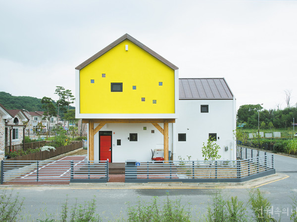 몇 년 동안 생각 속에만 존재했던 집을 비로소 현실로 옮겼다. 살고자 하는 집의 콘셉트가 명확한 건축주와, 그 바람을 적절하게 풀어낸 건축가가 만나 실현한 집. 익산의 조용한 주택단지에서 그 집을 만났다. 취재 김연정 사진 최지현 ▲ 이 주택만의 특징인 집 속의 집, 집 위의 집을 강조하기 위해 화이트 톤의 스터코로 전체를 마감했고, 옐로우와 레드, 그레이 컬러를 적용해 부분별로 포인트를 주었다. ▲ 블랙 & 화이트 컬러와 목재의 조화가 멋스러운 내부. 외관의 모습이 고스란히 전달된 디자인이 눈길을 끈다 아파트 생활만 해오던 건축주는 늘 주택에서의 삶을 꿈꿔왔다. 더 나이 들기 전에 집을 지어야겠다고 결심하고나자 땅 구입에서 설계까지 모든 것이 일사천리로 진행되었다. 3살, 5살인 두 딸이 함께 할 공간인 만큼 최대한 아이들에게 맞춰진 집을 계획하고자 했다. 주택 설계는 건축사사무소 KDDH의 김동희 소장이 맡았다. 그는 “처음 만났을 때 건축주가 보여준 방대한 자료가 그들의 성향을 파악하는 데 큰 도움이 되었다”며, “많은 부분을 참고할 수 있었기에 디자인적 접근이 좀 더 쉬웠다”고 소감을 밝혔다. 멀리서도 한눈에 들어오는 주택은 경량목구조로 시공되었다. 필로티 하부의 경우, 글루램(공학목재)으로 2층을 떠받치는 묵직한 느낌의 중목구조를 적용했다. 시공사가 자체 제작한 글루램은 주택의 강한 이미지를 연출하고, 경량목구조보다 구조적인 제약이 적어 자유롭게 열린 공간을 만들 수 있다는 장점을 가진다. 이렇게 마련된 두 개의 필로티 공간은 개방감을 높여 쾌적한 주거환경에 도움을 준다. 앞마당 쪽 필로티 하부 데크에는 자연스런 그늘이 드리워져 편안한 휴식을 즐기기에 안성맞춤이며, 북측 필로티 역시 우천 시 아이들이 비를 맞지 않고 집으로 들어갈 수 있는 효율적인 장치가 된다. ▲ 앞마당 쪽 필로티 하부에는 자연스런 그늘이 드리워진 데크공간이 마련되어, 가족이 편안한 휴식을 즐길 수 있는 장소가 되어준다. ▲ 감각 있는 건축주 덕에 화사하게 꾸며진 거실 전경. 취향이 녹아든 조명과 가구, 톡톡 튀는 소품까지 모두 직접 발품을 팔아 구매한 것들이다. ◀ 천장까지 이어진 목재 프레임이 심플하게 배치된 계단실을 더욱 돋보이게 만들어 준다. ▶ 나이가 어릴수록 어디로 튈지 모르는 아이들의 행동반경을 고려하여, 실내는 전체적으로 열려 있다. ◀여자 아이들의 방인만큼 핑크 컬러로 아기자기하게 꾸몄다. 최대한의 자연채광을 확보하기 위해 두 개의 천창을 설치했고, 북측 벽에는 유리블록으로 재미를 주었다. ▶ 주방 상부에 위치한 놀이 공간. 아이들이 머무는 곳이므로 내부 어디에서나 시야에 들어올 수 있는 1.5층에 배치하였다. 목재로 마감해 자연친화적인 분위기가 물씬 느껴진다. ▲ 2층의 각 실들을 연결하는 긴 복도는 아래층을 내려다 볼 수 있도록 오픈하였다.◀ 아이들의 방과 마주하고 있는 안방. 천장에는 이 집만의 특징을 살려 현장에서 직접 제작한, 유니크한 느낌의 조명을 설치했다. ▶ 안방 한켠에 위치한 엄마만의 아담한 작업실. ㄴ자 모양의 창과 공간 활용이 돋보이는 수납 아이디어 등 건축주를 위한 배려가 곳곳에 묻어난다. 아이들을 배려한 부모의 마음은 건물의 배치에서도 나타난다. 담장 너머 위치한 어린이공원은 건축주가 이 대지를 결정하게 된 첫 번째 이유이기도 하다. 대지의 조건을 활용하여 1층은 남측으로 오픈된 구조를 택했다. 거실과 마당, 공원을 나란히 두어 부모는 아이들이 마당과 공원에서 마음껏 뛰노는 모습을 언제든 확인할 수 있다. 내부공간의 경우, 1층은 거실, 주방, 화장실 등 공용공간을 배치하였다. 놀이방, 세탁실 등이 위치한 1.5층은 거실의 층고를 높이기 위한 중간 징검다리 역할을 하는 공간으로, 층고 3m 이내마다 설치해야 하는 법적 계단참을 대신한다. 2층은 아이방, 게스트룸, 욕실, 안방, 작업실로 구성된다. 두 아이의 방은 필요에 따라 하나로 합치거나 나눌 수 있도록 가변성을 고려해 설계되었고, 각 방들을 연결하는 긴 복도는 1층과 1.5층을 내려다 볼 수 있게끔 오픈되어 있다. 자칫 복잡해 보일 수 있는 벽면의 교차가 많아 화이트 톤의 벽지로 깔끔하게 마감했다. 아이의 놀이방은 목재를 이용해 자연 친화적인 느낌을 강조하였으며, 공용공간과 달리 각 방의 내부는 그 기능에 맞도록 컬러를 조절하였다. HOUSE PLAN 대지위치: 전라북도 익산시 지역지구: 도시지역, 제1종 전용주거지역, 제1종 지구단위계획구역 대지면적: 273.7㎡(82.79평) 건물규모: 지상 2층 건축면적: 111.60㎡(33.76평) 연면적: 192.78㎡(58.31평) 건폐율: 40.77% 용적률: 70.79% 주차대수: 2대 최고높이: 8.6m 구조재: 경량목구조, 중목구조(글루램) 지붕재: 컬러강판(리얼징크) 단열재: 비드법보온판 외벽마감재: 스터코 내벽마감재: 벽지, 자작나무합판 창호재: 이건 3중창호(PVC, AL커튼월) 시공: 하우징플러스(슈베르트 백) 설계: 김동희(KDDH) 010-2507-1677 http://blog.naver.com/kimddonghee3.3㎡(1평)당 건축비: 약 500만원INTERIOR SOURCES 바닥재: 강마루 욕실 및 주방 타일: 국산 고급형 수전 등 욕실기기: VOVO, 대림, 쎄비앙일체형시스템샤워기 주방가구