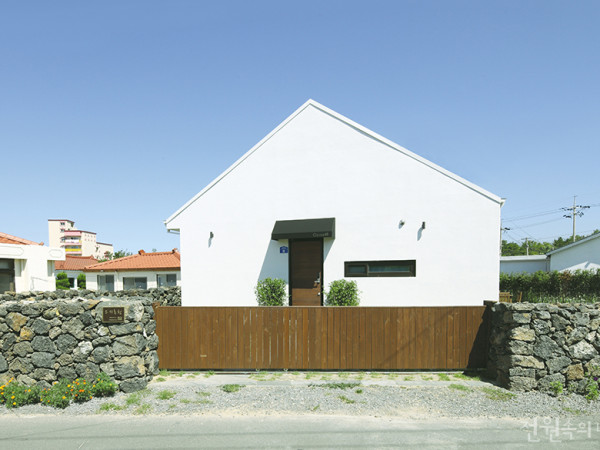 RENTAL HOUSE 제주집이라 하면 흔히 현무암으로 벽체를 구성하고 사이사이를 몰탈로 채워 지은 돌집을 떠올린다. 제주시 동쪽 협재 해변가 마을 한가운데, 화이트 외벽에 경사 지붕을 가진 ‘오시록헌’은 투박한 그들 사이에서 흰 적삼을 입은 여인처럼 빛을 발한다. 취재 정사은, 조고은 사진 변종석 렌탈하우스는 올레길의 시작과 끝에 생겨난 게스트하우스나 마을과 떨어진 한적한 평지에 지어진 펜션과는 성격이 조금 다르다. 휴식만을 위해 제주로 발걸음을 옮기는 사람들을 위해 집 한 채를 통째로 빌려주는 개념이다. 집과 마당, 그리고 마을 주민이 된 기분을 함께 누리며 색다른 체험을 할 수 있다. 오랜 세월 도시에서 생업에 종사하다 이곳 제주로 내려온 임영신 씨는 ‘괜찮은 숙소가 있으면 소개해달라’는 지인들의 반복된 요청에 직접 렌탈하우스를 짓기로 했다. 그녀에게 건축은 낯설고 새로운 도전이었다. 토지 구입에서부터 소유권 문제, 경관지구인 탓에 지붕설계가 변경된 일 등 처음 해보는 집짓기 과정이 어려울 법도 한데, ‘정 안되면 우리 부부가 살면 되지’하는 생각으로 느긋하게 또 긍정적으로 문제들을 풀어 갔다. 집짓기에 관한 이야기는 그녀가 운영하는 블로그에 차곡차곡 기록해 두었다. 이 기억들이 집에 얽힌 추억이 되어 건축주 부부의 제2의 인생을 즐겁게 시작하게끔 도와주었다고. ▲ 남사면 지붕의 넓지도 좁지도 않은 처마선은 적절한 그늘을 만들어주어 실내로 드는 햇빛의 양을 조절하는 역할을 한다. 살림살이를 많이 두지 않아도 되는 렌탈하우스이기에 수납이나 동선의 효율성보다는 손님들에게 선사해야 하는 ‘색다른 경험’에 중점을 두었다. 우선 현관과 주방, 거실이 하나의 공간으로 연결되어 있어 내부에서의 움직임이 간결하다. 현관은 클 필요 없고, 신발장 또한 불필요하다. 4인 여행객이 가져올 만큼의 짐만 수용할 수 있도록 만들어진 수납이다. 남쪽으로는 주방과 거실이 넓은 정원과 함께 배치되어 있고, 방 두 개가 나란히 집의 북쪽에 위치한다. 각 방마다 딸린 욕실이 있어 서로간의 프라이버시도 어느 정도 존중된다. 북쪽으로 낸 미니 데크는 두 방을 공간적·심리적으로 나누는 역할을 한다. 창은 문으로 사용할 수 있게 크게 만들어 남쪽과 북쪽에 난 두 외부공간으로 언제든 오갈 수 있고, 모든 창을 동서남북으로 배치해 시원한 바람이 언제든 집안을 관통할 수 있도록 했다. 특히 제주 해안가는 습도가 다소 높은 바람이 불기 때문에 특별히 주문한 해안주택용 창호와 유리를 사용했는데, 올 여름 목조주택의 습도 조절 능력이 더해져 쾌적한 실내를 즐길 수 있었다고 한다. ▲ 동백으로 담을 둘러 아늑한 마당을 만들었다. 거실과 주방에서 바로 나올 수 있는 데크를 건물과 나란히 내어 한옥 툇마루의 느낌을 살렸다. ▲ 살림집이 아닌 여행객을 위한 숙소이기 때문에 수납의 편리성 같은 실용적인 측면보다는 군더더기 없는 간결한 공간을 만드는 데 집중했다. 넓지 않은 실내이기에 천장을 2.7m로 높여 트인 느낌을 주었으며 사방으로 창을 내 공기가 늘 통하도록 했다. ▲ ㄷ자 형태로 배치해 사용하기 편리한 주방. 선반에는 기본적인 조미료와 각종 차(茶), 그리고 다녀간 손님들이 감사의 표시로 보내준 소품들이 놓여있다. 목조주택은 무거운 물건을 매달거나 벽면에 고정할 때 보조 각재를 벽면 구조체에 연결해 하중을 분산시켜야 한다. 벽걸이형 에어컨은 벽 안으로 매입해 공간을 미리 만들어두었고, TV 역시 미리 정해 벽에 걸기 전 구조체에 보강작업을 했다. HOUSE PLAN 대지면적: 295㎡(89.24평) 건물규모: 지상 1층 건축면적: 92.35㎡(27.94평) 연면적: 89.70㎡(27.13평) 건폐율: 31.30% 용적률: 30.40% 주차대수: 1대 최고높이: 6.70m 공법: 기초 - 콘크리트매트기초, 지상 - 경량목구조 구조재: 목구조 지붕재: 리얼징크 단열재: 인슐레이션 외벽마감재: 테라코타 창호재: 영림새시 계획설계: 트러스트홈 실시설계: 위드건축사사무소 064-725-1971 시공: 트러스트홈 064-702-5552 건축비: 3.3㎡(1평)당 570만원 ▲ 건물 북쪽에 위치한 뒷마당은 돌담과 건물 사이에 있어 여름철 볕을 피해 쉬기 좋은 공간이다. 미니 데크에는 비를 막을 수 있도록 반투명 폴리카보네이트 소재로 지붕을 만들어 덮을 예정이다. ▲ 침실과 드레스룸, 건식욕실이 위치한 프라이빗 공간. 거실과 주방 공용부에 면적을 많이 할당하고, 개인적인 공간은 콤팩트하게 짰다. 문은 홍송 원목으로, 욕실의 타일은 다소 값이 나가더라도 고급스러운 분위기가 나는 폴리싱 타일을 사용했다. ◀ 모서리 선반은 내벽 마감 전 목재 구조체와 연결해 설치했다. 이는 제작뿐 아니라 마감과 이후 페인팅 작업 시 손이 많이 가지만, 깔끔해 보이는 효과와 튼튼하다는 장점이 있다. ▶ 집주인이 소장하고 있던 원목 테이블과 알음알음 모은 의자들을 거실과 식당 사이에 두어 멋스런 다이닝 공간이 탄생했다. ▲ 오시록헌에서 보내는 여유로운 오후의 풍경 ▲ 렌탈하우스에는 신발장 대신 걸터앉을만한 미니 벤치 하나면 충분하다. 외투와 모자를 걸 수 있는 옷걸이를 비치하고, 예쁜 일러스트 제주 지도를 벽에 걸어 깔끔한 