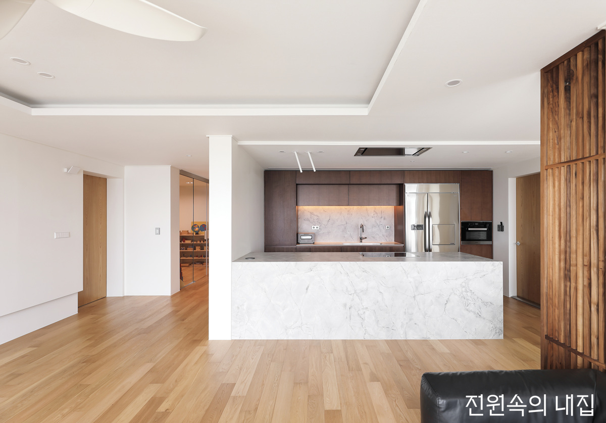 각 방을 잇는 복도를 지나면 군더더기 없이 깔끔하게 펼쳐진 거실과 주방을 만난다. 하얀 벽면과 조화를 이루는 원목 소재의 마루와 파티션이 따뜻하고 안락한 분위기를 연출하고, 간소하게 배치된 블랙 컬러의 가구들이 무게를 잡아준다.