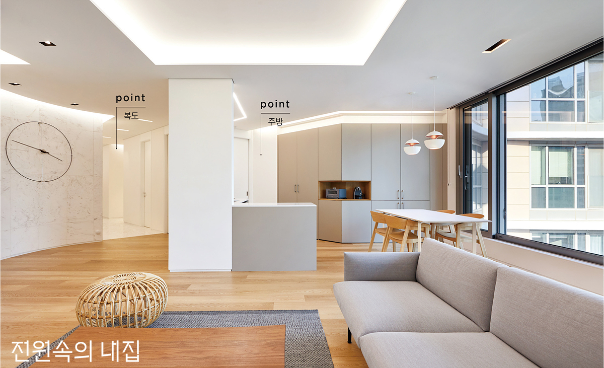 POINT 1 - 거실 옆 주방 기존 상부장 활용, 사선형 벽체를 이용한 수납 등 실용성 위주의 주방으로 완성했다. POINT 2 - 긴 복도 공간 각 방으로 연결되는 복도. 현관과 같이 화이트 톤으로 통일해 화사한 기운이 전해진다.