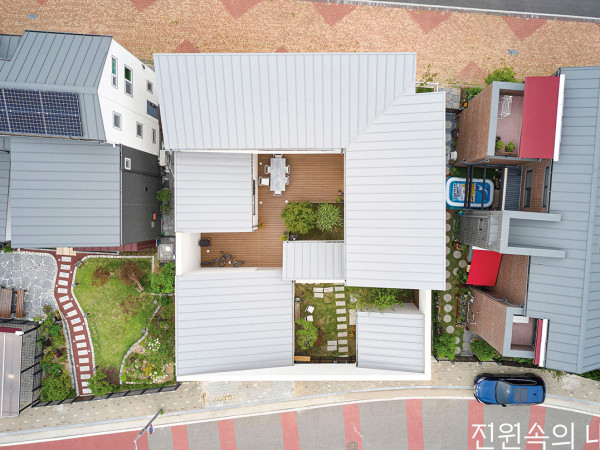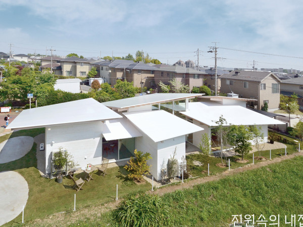 여섯 개의 크고 작은 지붕이 엇갈려 배치된 주택은 색다른 조형미를 드러낸다. 개방적인 주택 형태는 프라이버시를 중시하는 여느 일본 주택들과 달리 외부와의 소통에 중점을 두었다.건축주 부부와 아이, 3인 가족을 위한 집이다. 대지는 초등학교에 통학하는 아이들이 주로 다니는 조용한 길가에 위치하였다. 이 지역은 완만한 구릉지대로 대부분의 택지는 성토를 거쳐 평지로 조성되었다. 인근 주택들은 벽으로 둘러싸여 왠지 닫혀 있는 듯한 분위기를 풍긴다. 게다가 부지 앞 도로변으로 카포트를 배치해 주변과의 거리감도 느껴진다.건축가는 풍경과 길에 주목해 설계 콘셉트를 계획했다. 마치 땅에서 자라난 듯한 6개 지붕(HP Shell)이 눈길을 끈다. 반대 방향으로 향하는 지붕의 두 포물선이 직교하면서 완만한 곡면을 형성한다. 그리고 모양과 크기를 달리한 지붕이 서로 겹쳐지면서 하나의 군락을 이룬다. 지붕의 처마는 중앙은 높게, 바깥쪽은 낮게 디자인했다. 각 지붕의 가장 높은 지점부터 가장 낮은 지점까지는 완만한 계곡이 형성되면서 빗물의 흐름이 자연스럽게 통제된다.담장이나 벽으로 경계를 짓고 있는 여느 주택과 달리 마치 도로변에 자리한 공원처럼 개방적인 모습을 보인다.담장이나 벽으로 경계를 짓고 있는 여느 주택과 달리 마치 도로변에 자리한 공원처럼 개방적인 모습을 보인다.HOUSE PLAN프로젝트명≫ 6 roofs house 위치≫ 일본 아이치현 나고야시 메이토구 건축총면적≫ 333.01m2 외벽재≫ 시더(Cedar) 바닥재≫ 송이 소나무(Pinus pinaster) 천장재≫나왕 목재(Lauan) 사진≫ Kentaro Kurihara 설계≫ studio velocitywww.studiovelocity.jp건축가≫ Kentaro Kurihara, Miho Iwatsuki, Ryusuke SuzukiPLAN지붕과 지붕이 겹쳐지는 부위 사이는 모퉁이를 살짝 들어 올려 간격을 확보하였다. 그 틈새로 바람과 빛이 흘러들어 집 안으로까지 이어진다. 처마 밑 공간 사이는 물론 안과 밖으로 바라보고 받아들이는 시선의 소통도 원활하다.실내에는 밝고 환기에 유리한 생활공간과 사무공간이 마련되었다. 주택의 매스에 따라 자연스럽게 형성된 정원은 인접한 거리와 연속성을 가지며 훨씬 개방된 모습이다. 그만큼 집과 지나가는 이웃들 사이의 접근성을 높여준다.정원 안팎으로 모두 열려 있는 구조와 높낮이가 다른 여러 지붕들 사이로 바람과 빛이 원활하게 드나든다. 이로 인해 실내의 환기와 채광이 덤으로 확보되었다.주거 공간과 사무 공간 사이의 중정. 비가 오는 날이면 빗물 떨어지는 소리와 풍경으로 운치 있는 장소로 변한다.SECTION주방과 이어지는 열린 식당 공간.평면상 공간을 크게 분할하는 긴 복도를 따라 공간이 분배되는 형태이다.주택이 지어지는 내내 학교를 오가는 아이들과 이웃들의 지대한 관심을 받았다. 준공 후에도 흥미롭게 말을 걸어오는 이웃들이 많았다. 정원수가 마음에 든다며 품종을 묻는 사람부터 이 집을 따라서 외관을 흰색으로 페인팅하는 옆집도 있었다. 건축을 전후로 이웃과의 관계가 재정립되었고, 주택은 보다 활발한 소통의 장이 되었다. 집 안 어디에서도 모든 방향으로 열려 있는 건축 설계의 효과가 아닐까. 단절된 도심에서 벗어나 이웃과 소통하는 전원에서의 삶을 꿈꾸는 이라면 눈여겨볼 만하다.취재_ 이준희ⓒ 월간 전원속의 내집 / Vol.269 www.uujj.co.kr월간 <전원속의 내집>의 기사 저작권은 (주)주택문화사에 있습니다. 무단전재, 복사, 배포는 저작권법에 위배되오니 자제해주시기 바랍니다.